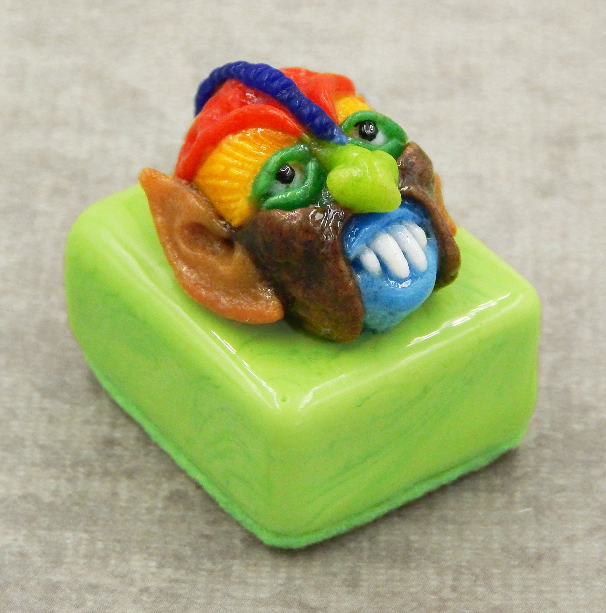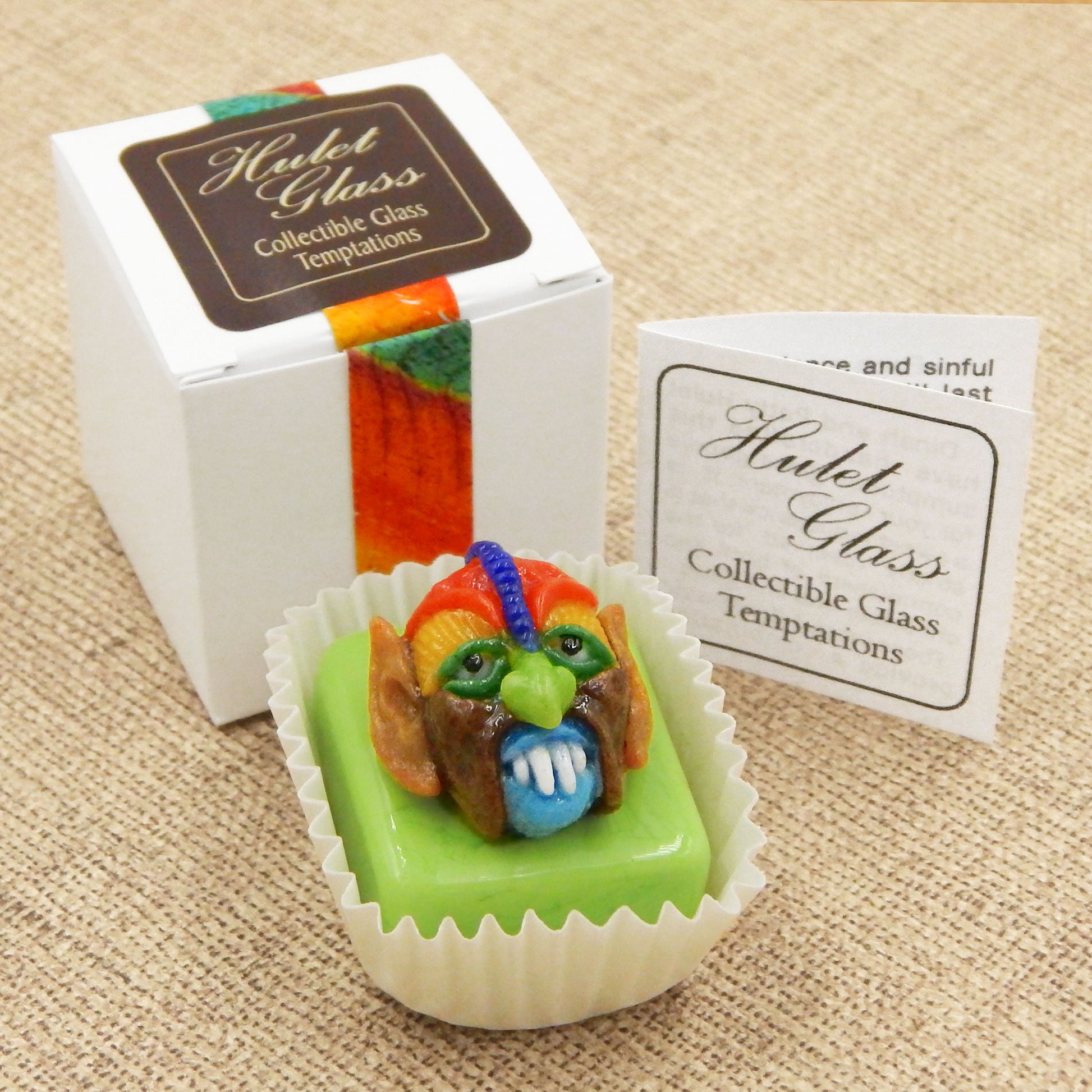 A handmade collectible solid glass pistachio petit four chocolate with a colorful alien on top. This glass chocolate is created from finely ground colored glass powders using variations of the centuries old technique of pate de verre (no paints are used in our work). The base is created over an open flame utilizing lampworking techniques that originated in antiquity. Our creations are annealed (cooled to room temperature) in a carefully controlled kiln to ensure strength and durability.