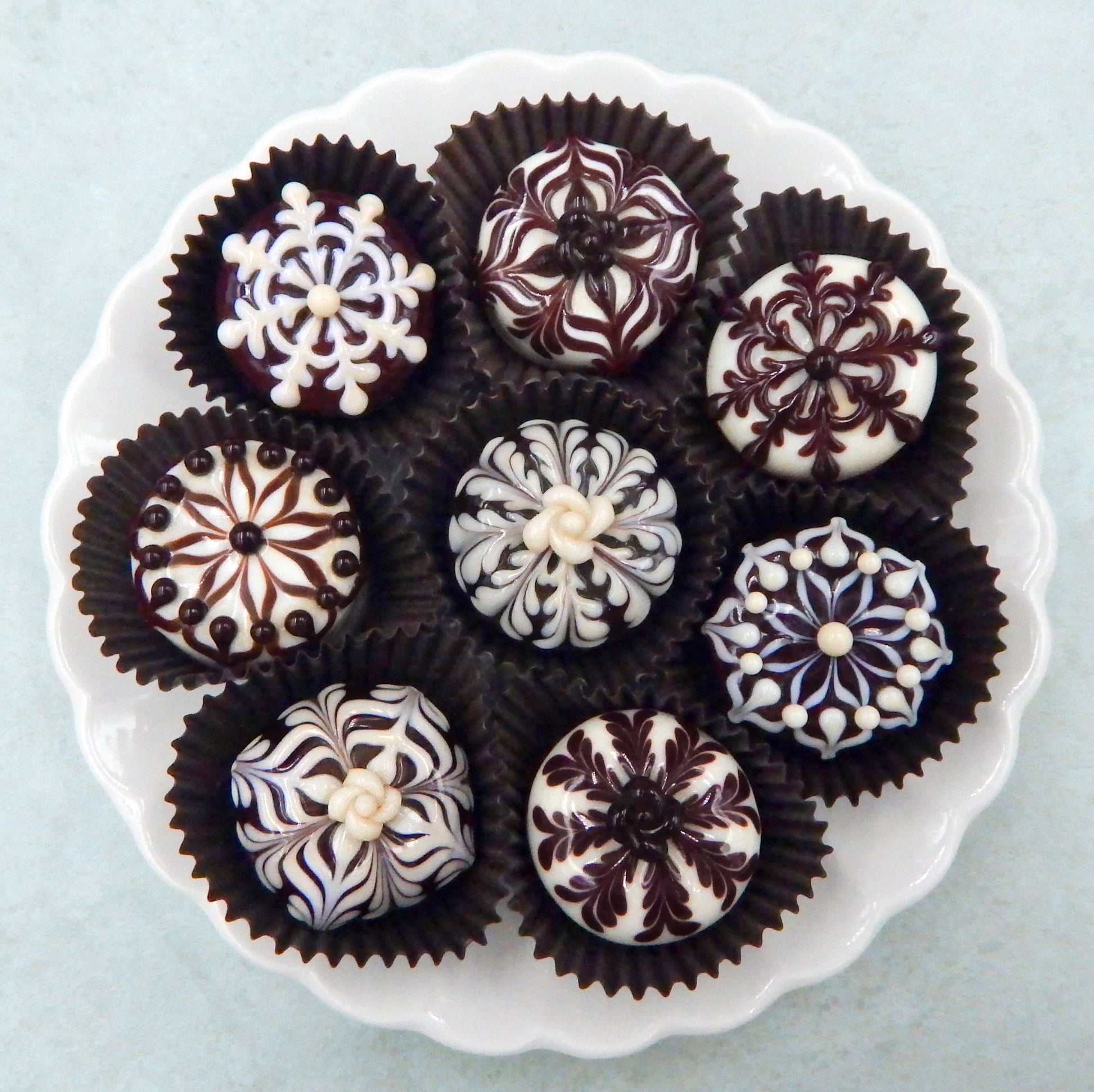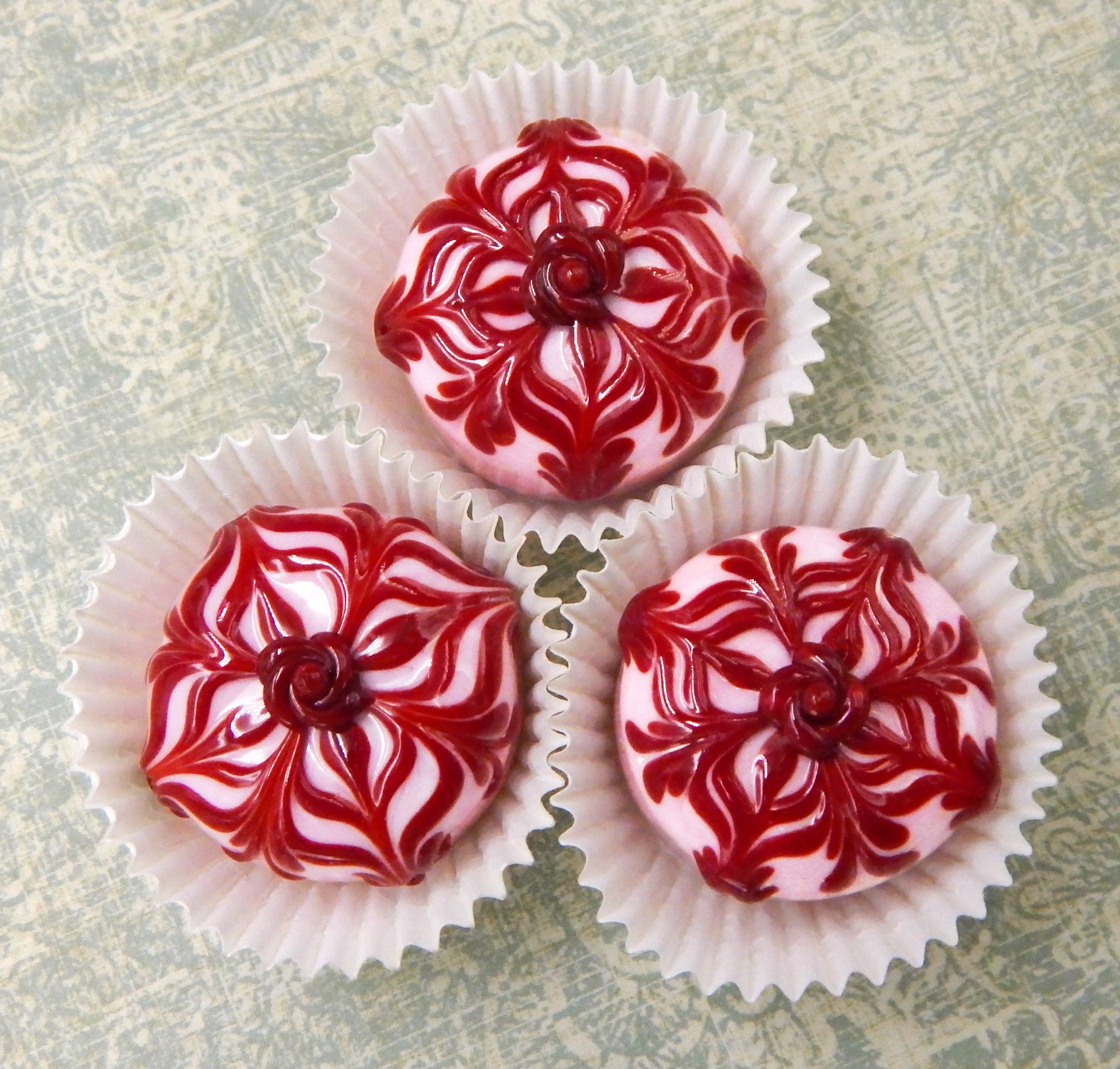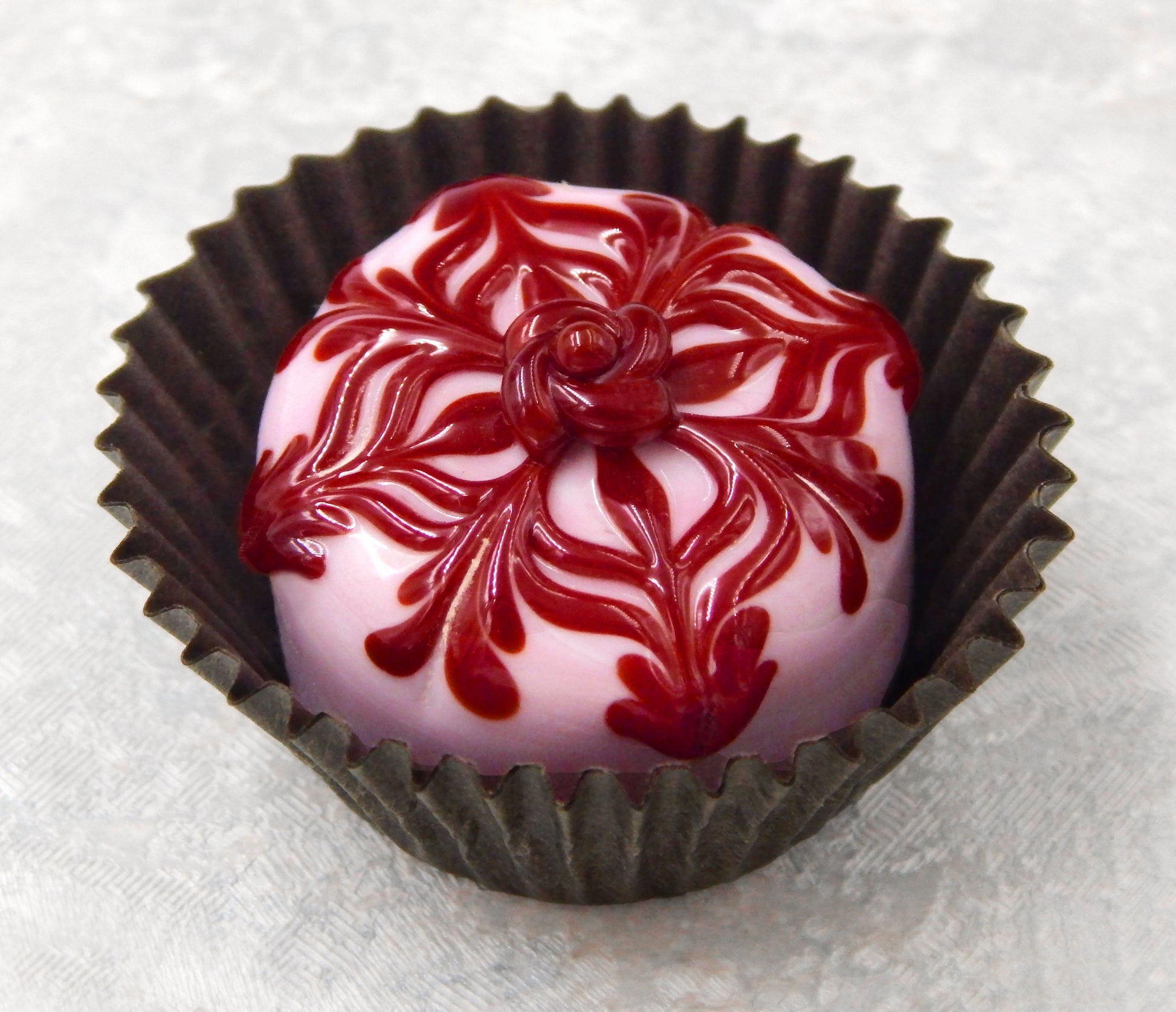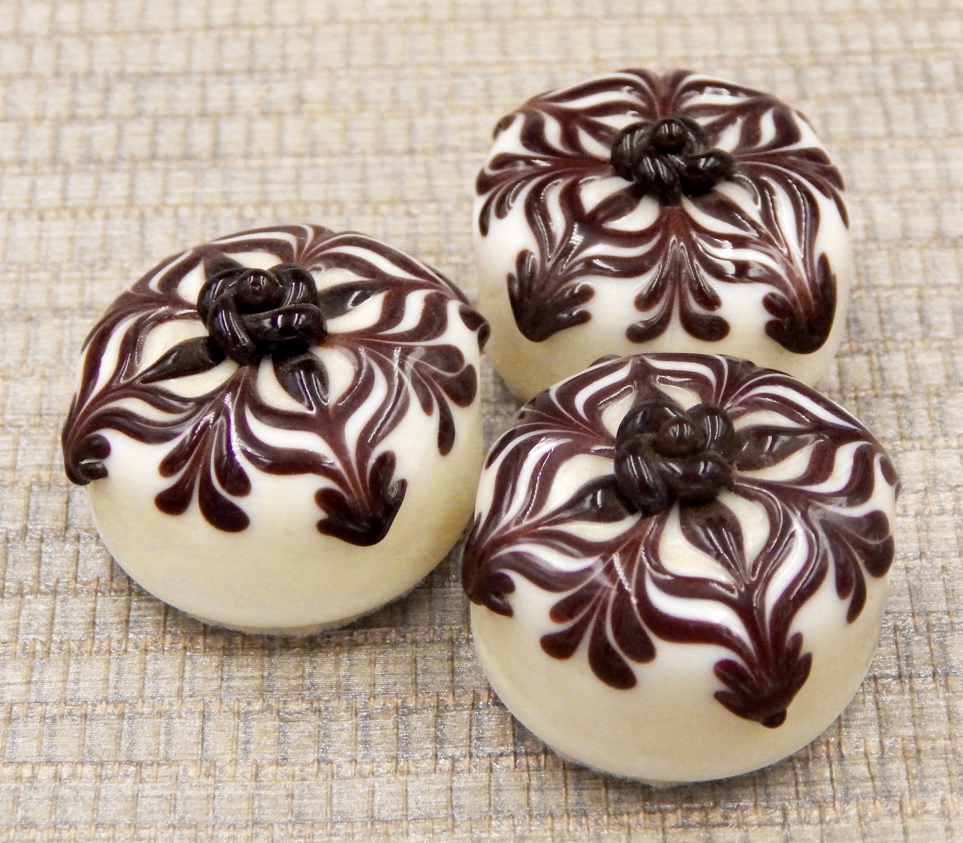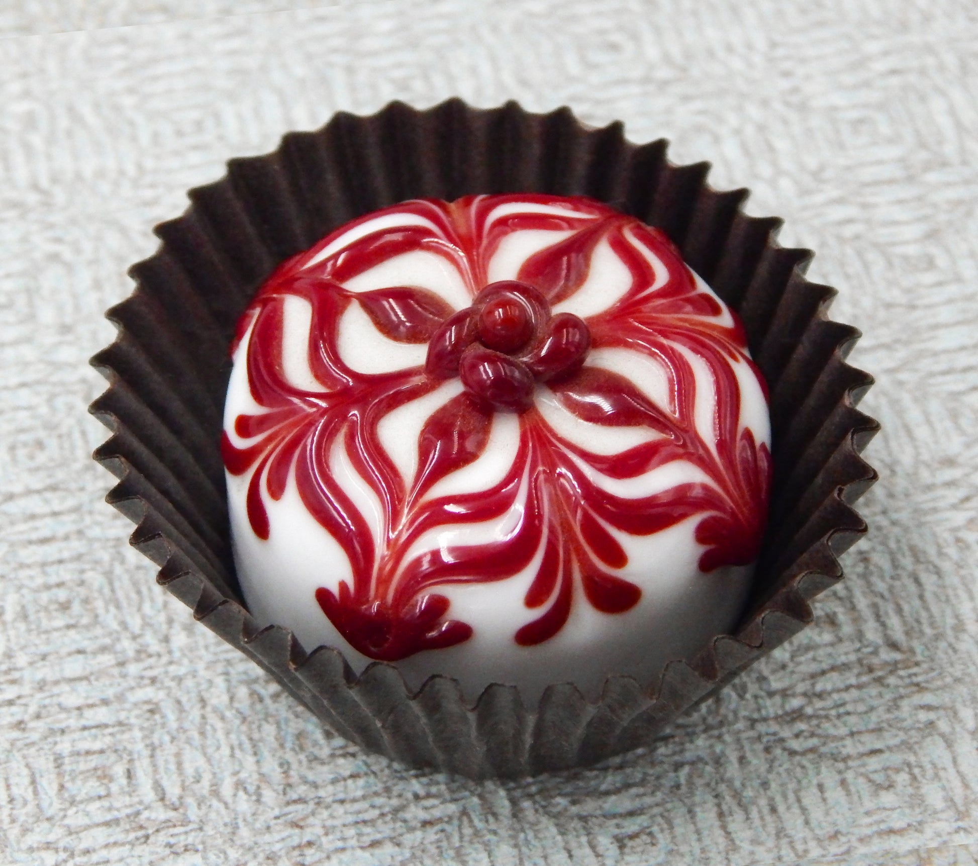 Handmade collectible solid art glass chocolates in four color combinations, each with a creamy embellishment on top, created from colorful glass utilizing flameworking techniques. Meticulous attention to detail has gone into the construction of each of our pieces to enhance its appeal and collectibility.