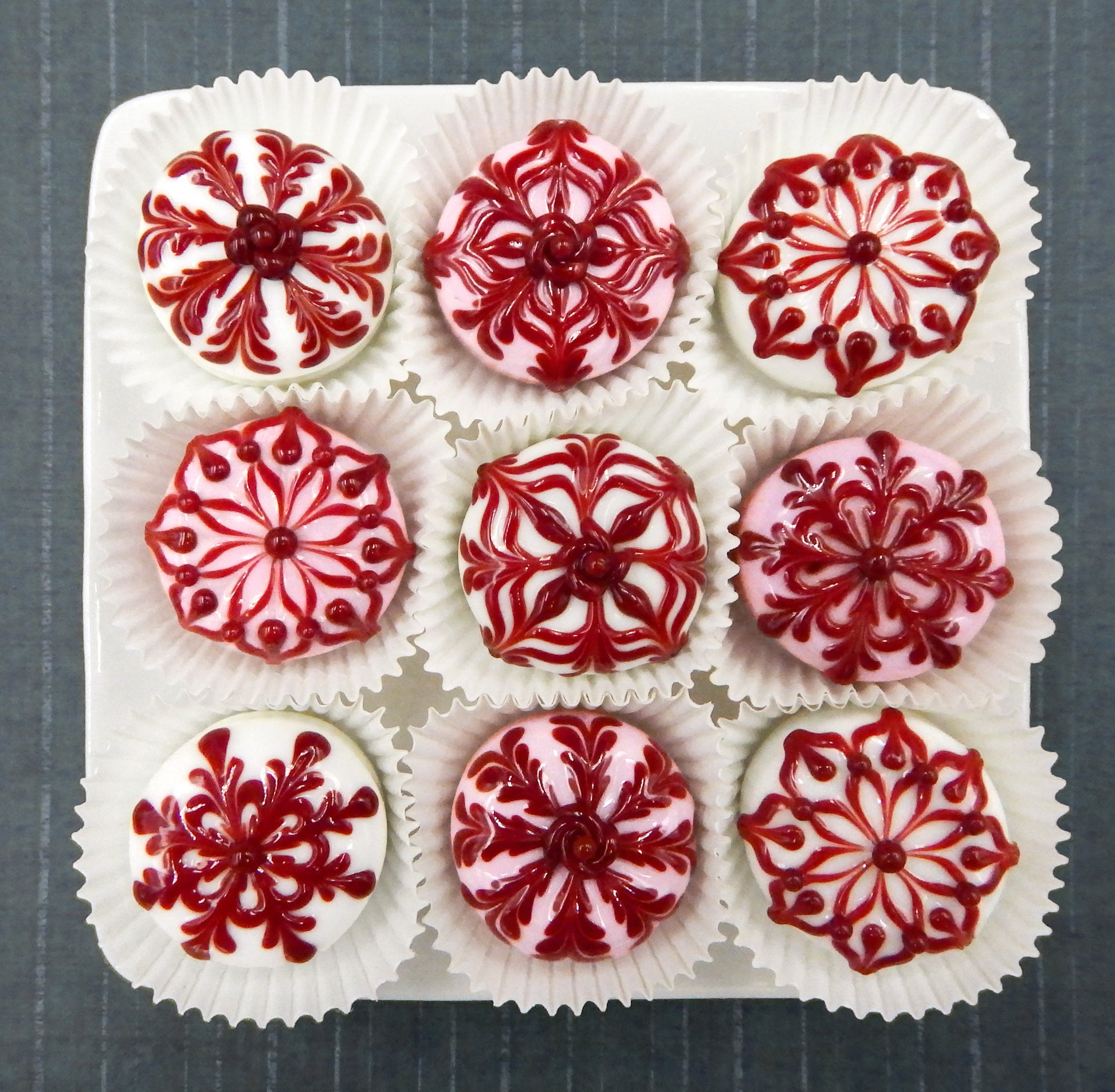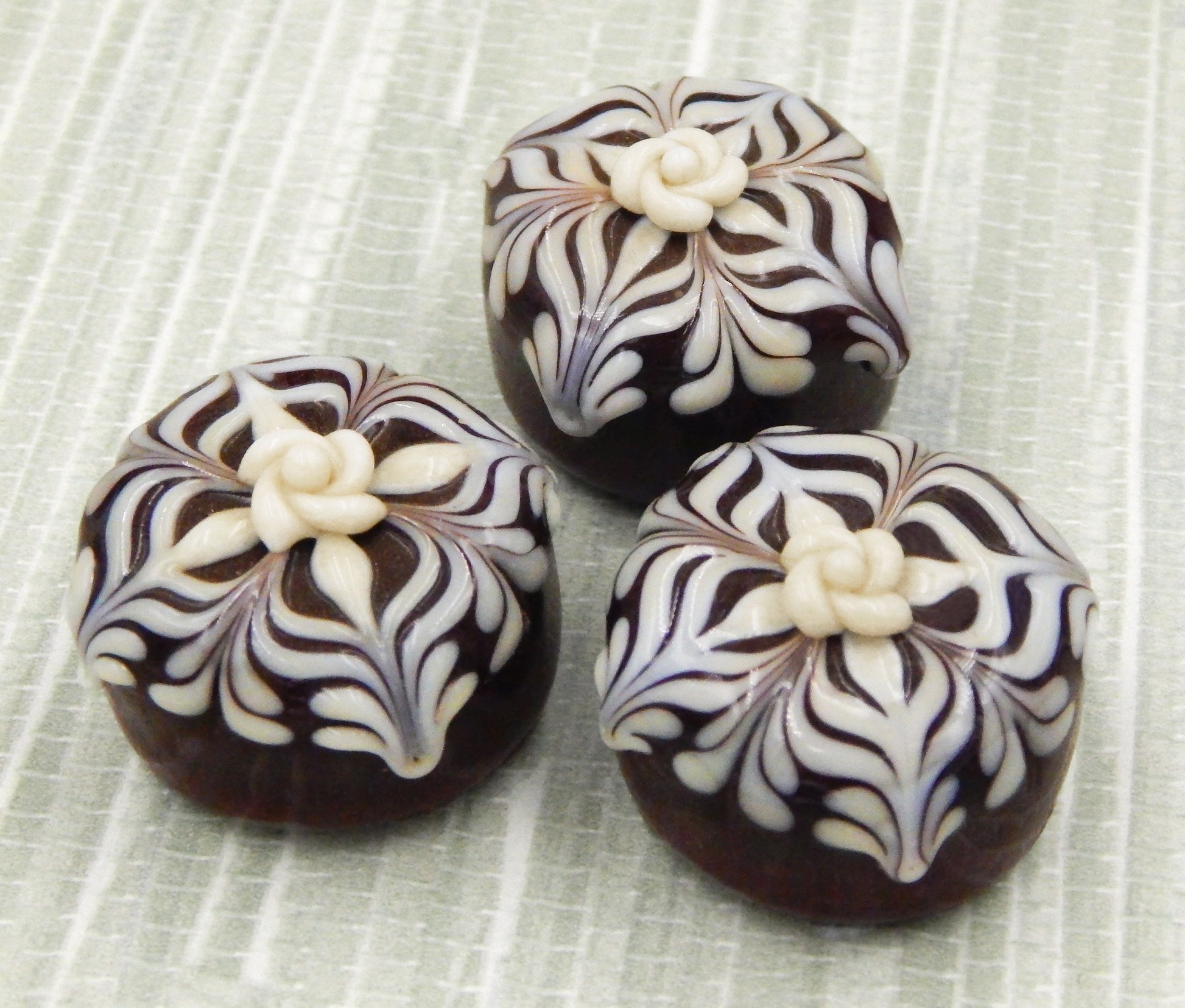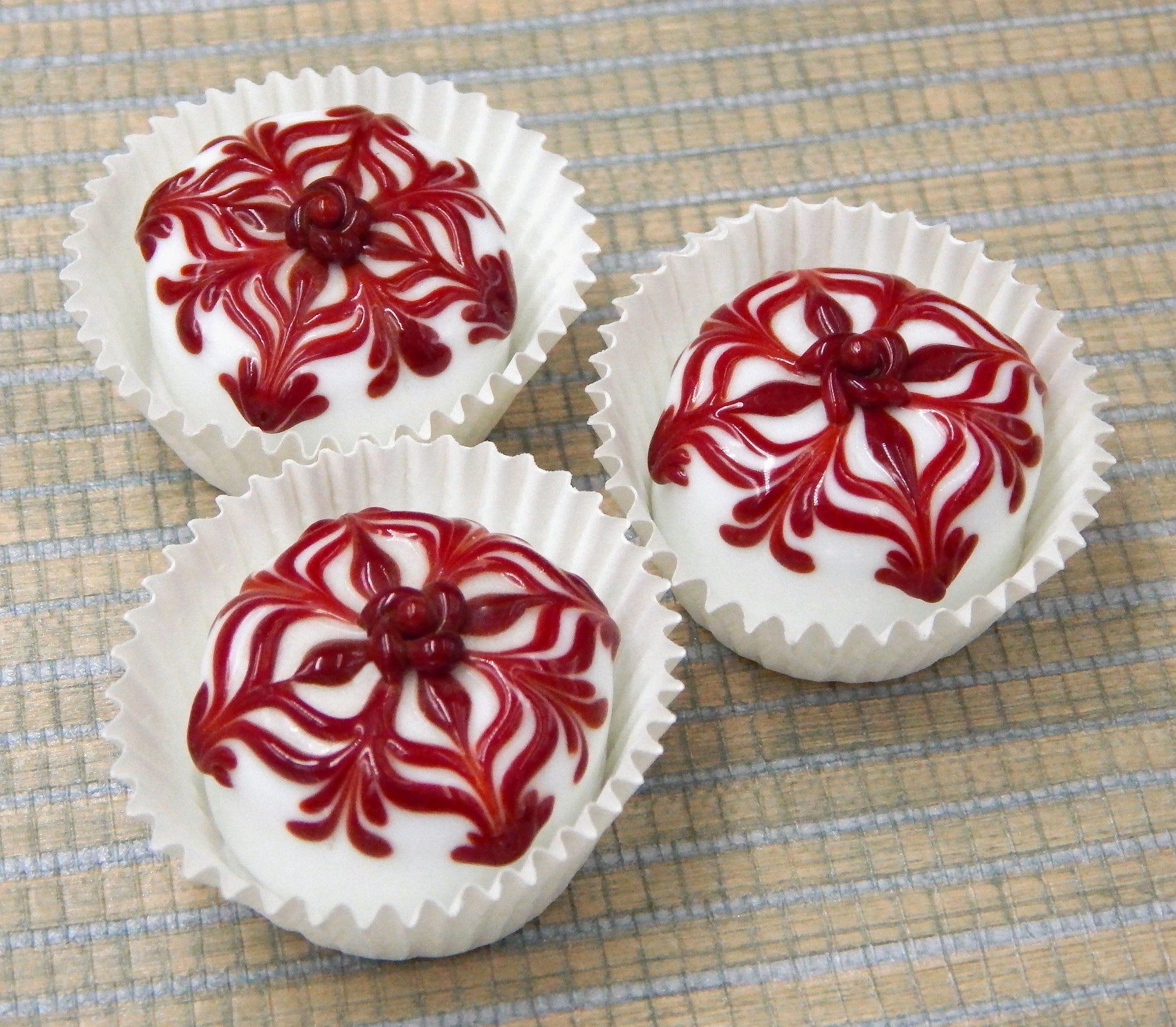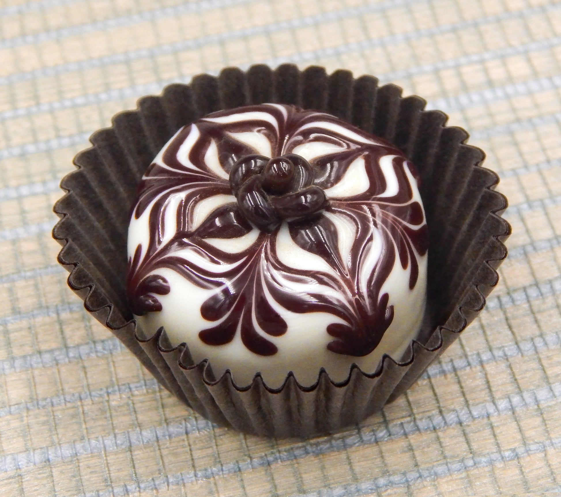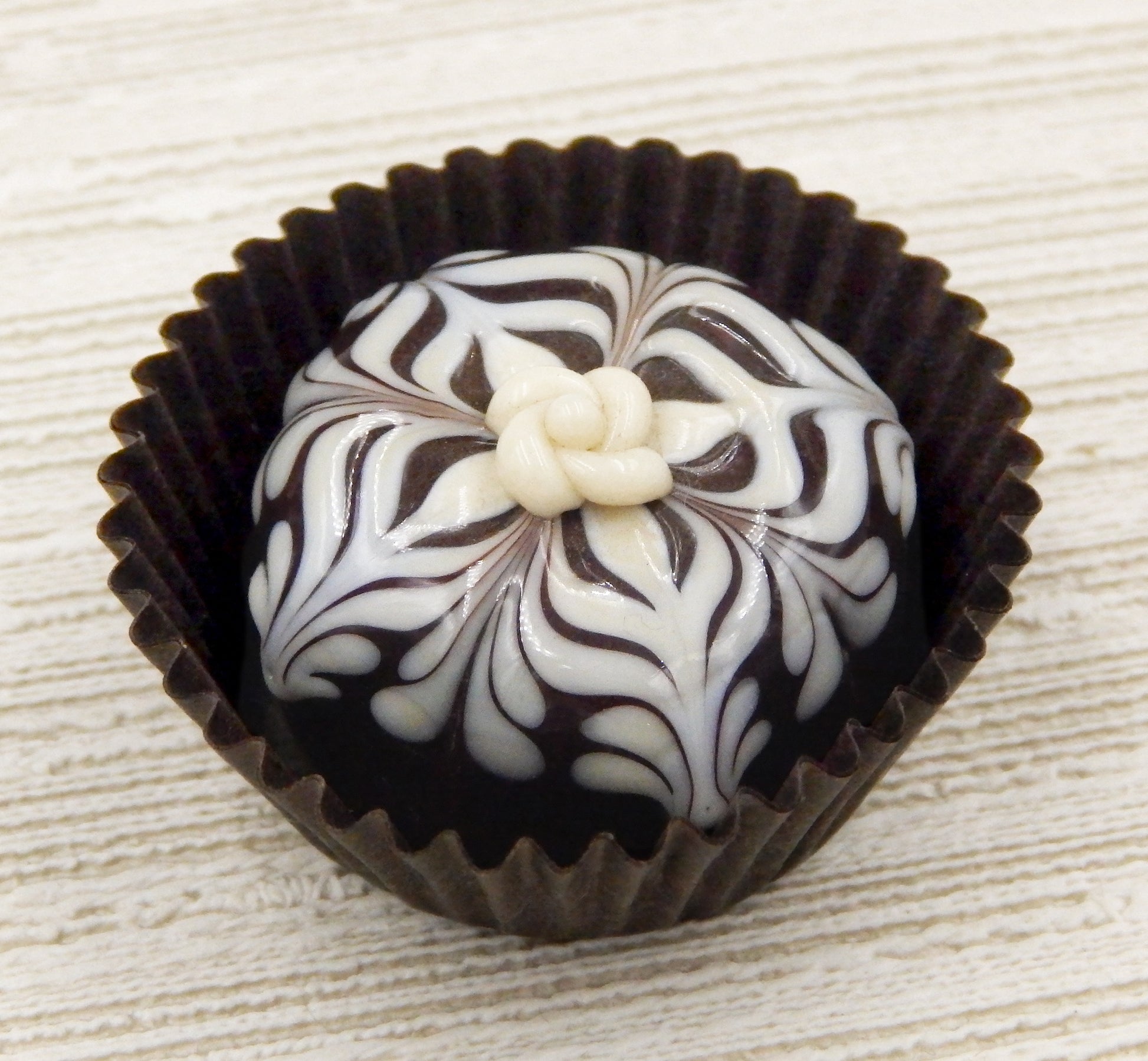 Handmade collectible solid art glass chocolates in four color combinations, each with a creamy embellishment on top, created from colorful glass utilizing flameworking techniques. Meticulous attention to detail has gone into the construction of each of our pieces to enhance its appeal and collectibility.