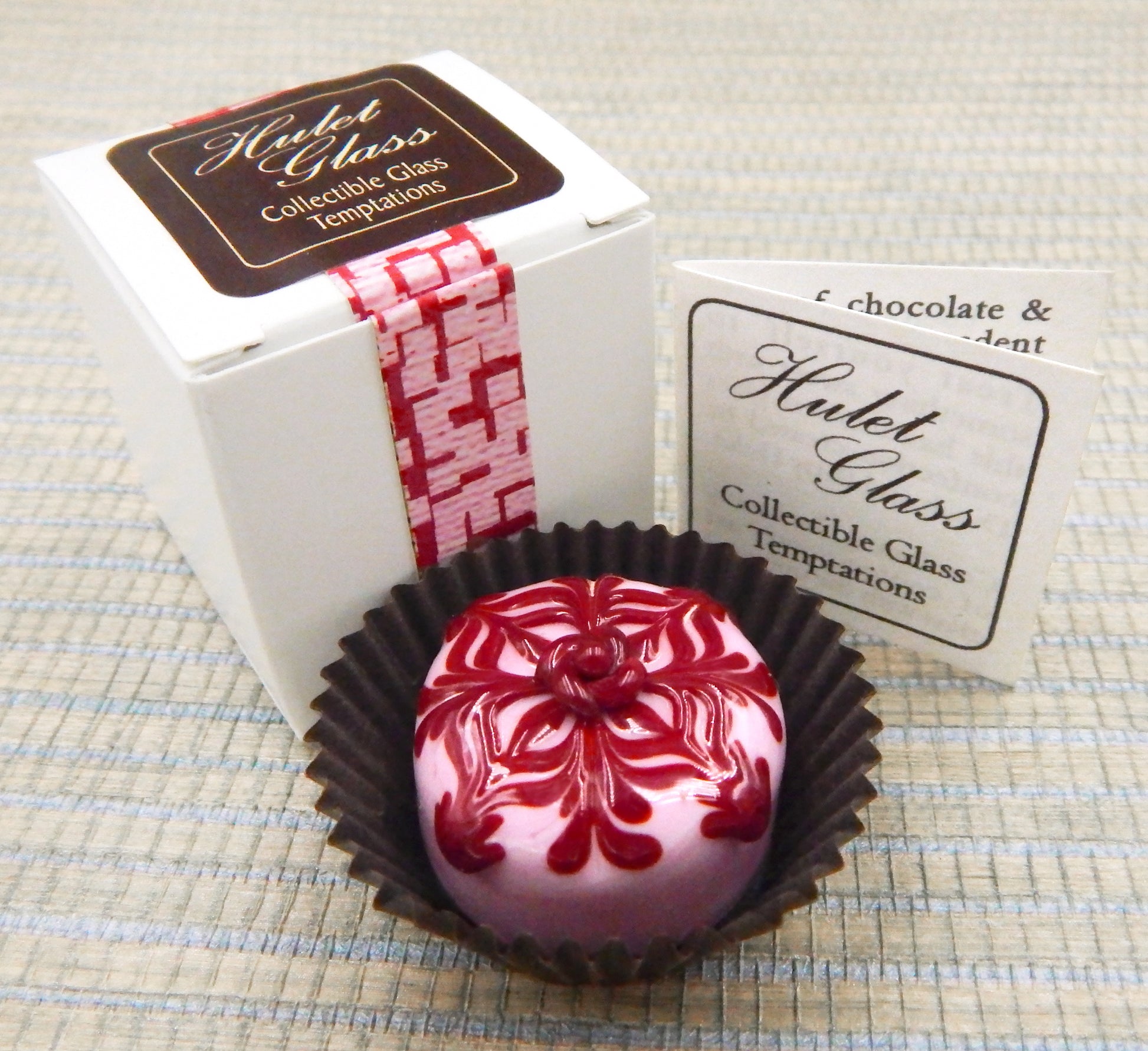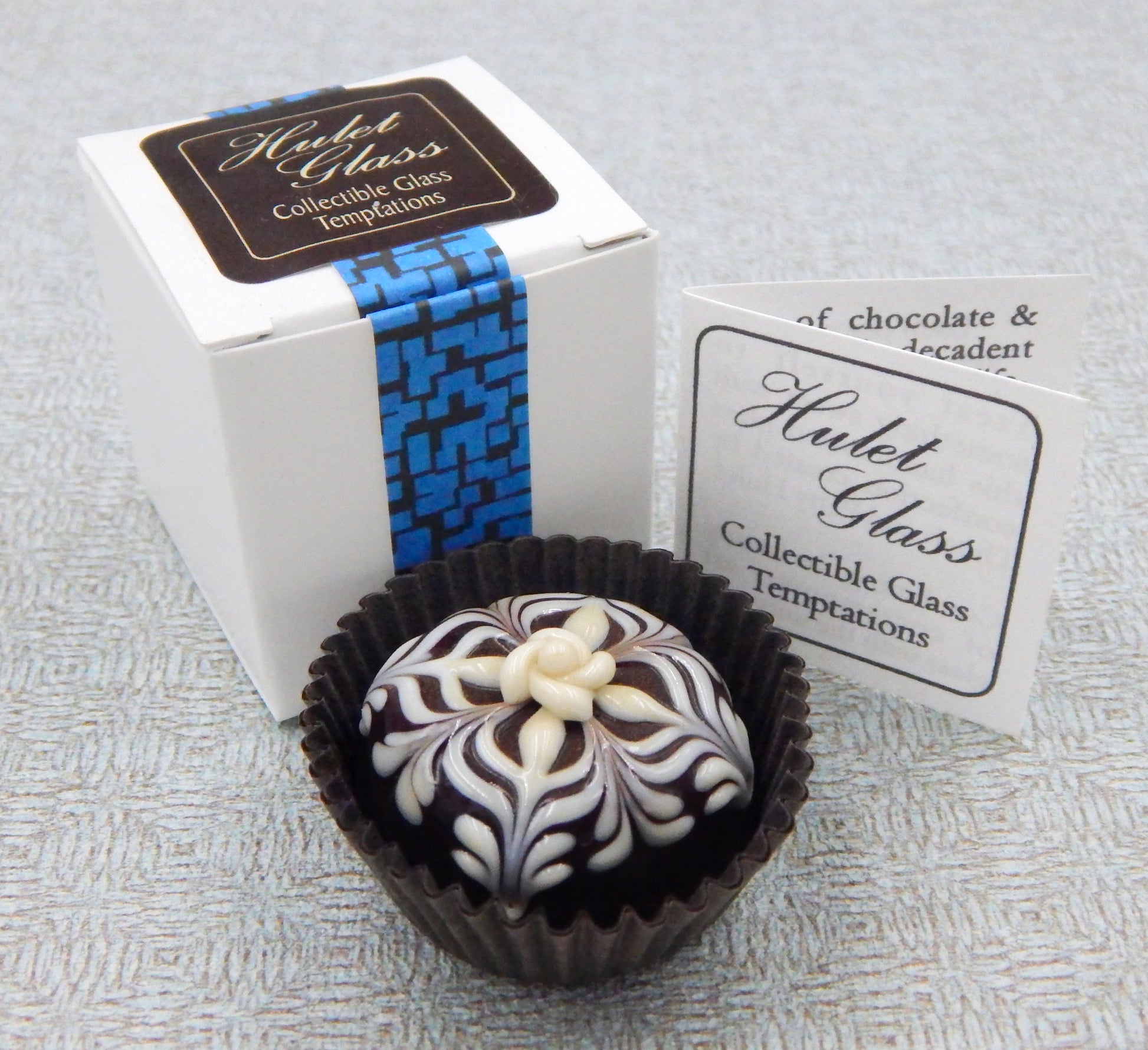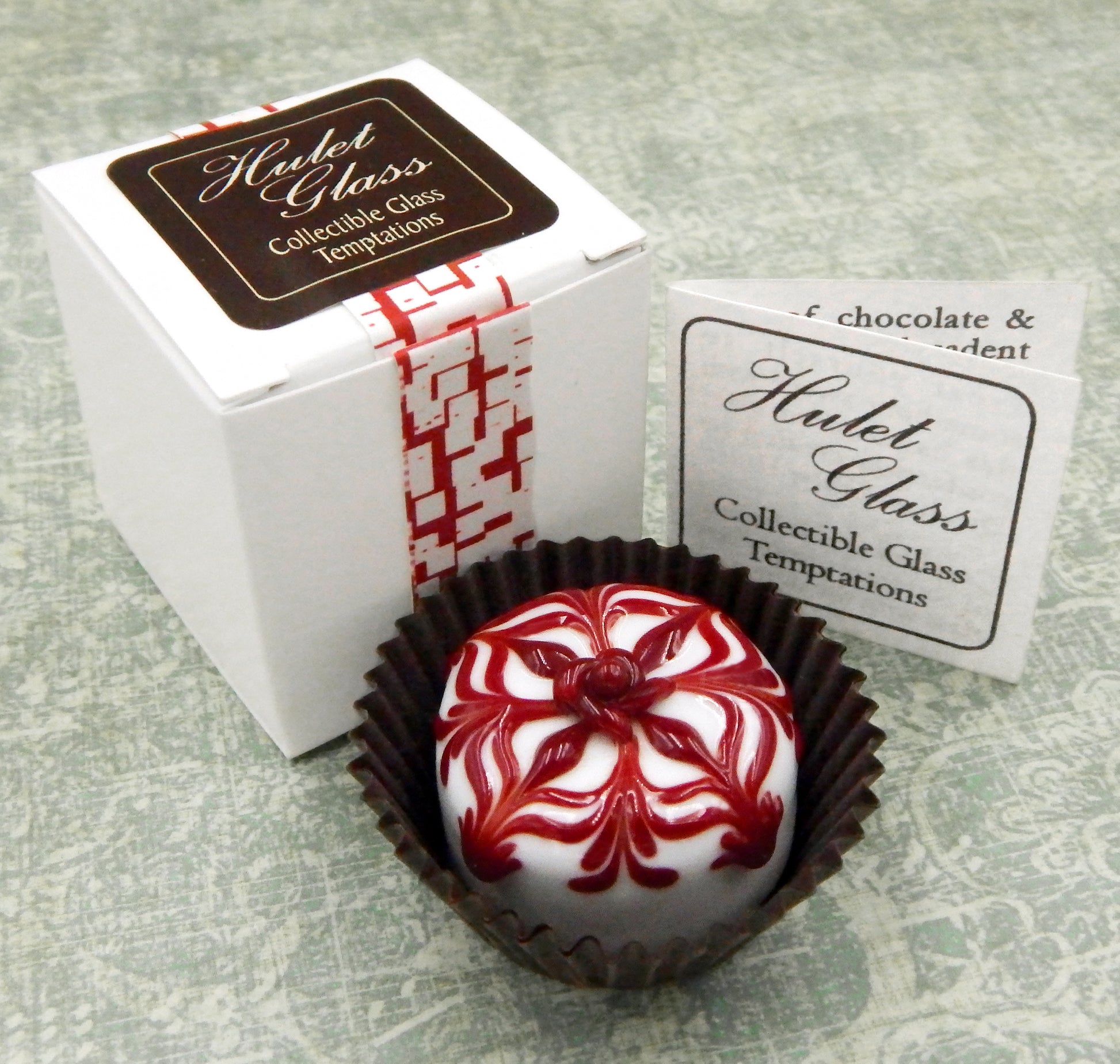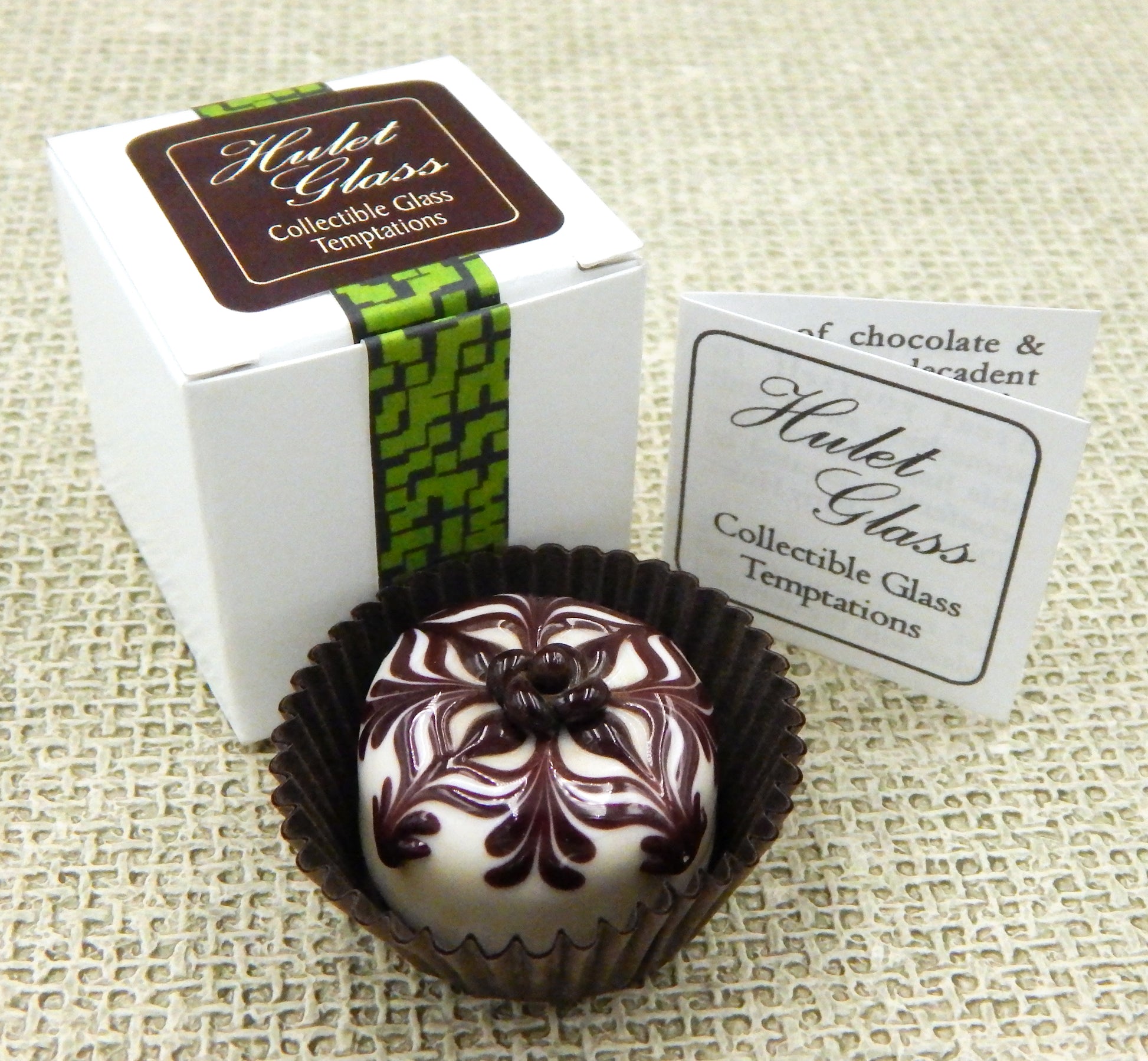 Each of these glass chocolate measures 1.25" x .75" (slightly larger than an actual chocolate candy) and sits in a fluted glassine paper candy cup. The bottom of the chocolate is covered in felt to protect the surface it will sit upon. Each beautiful glass chocolate is signed (Hulet), dated and comes to you in a colorful gift box with an enclosure card telling a bit about the piece.