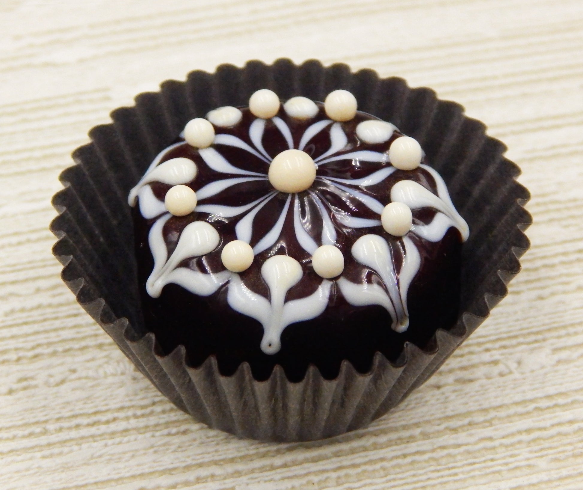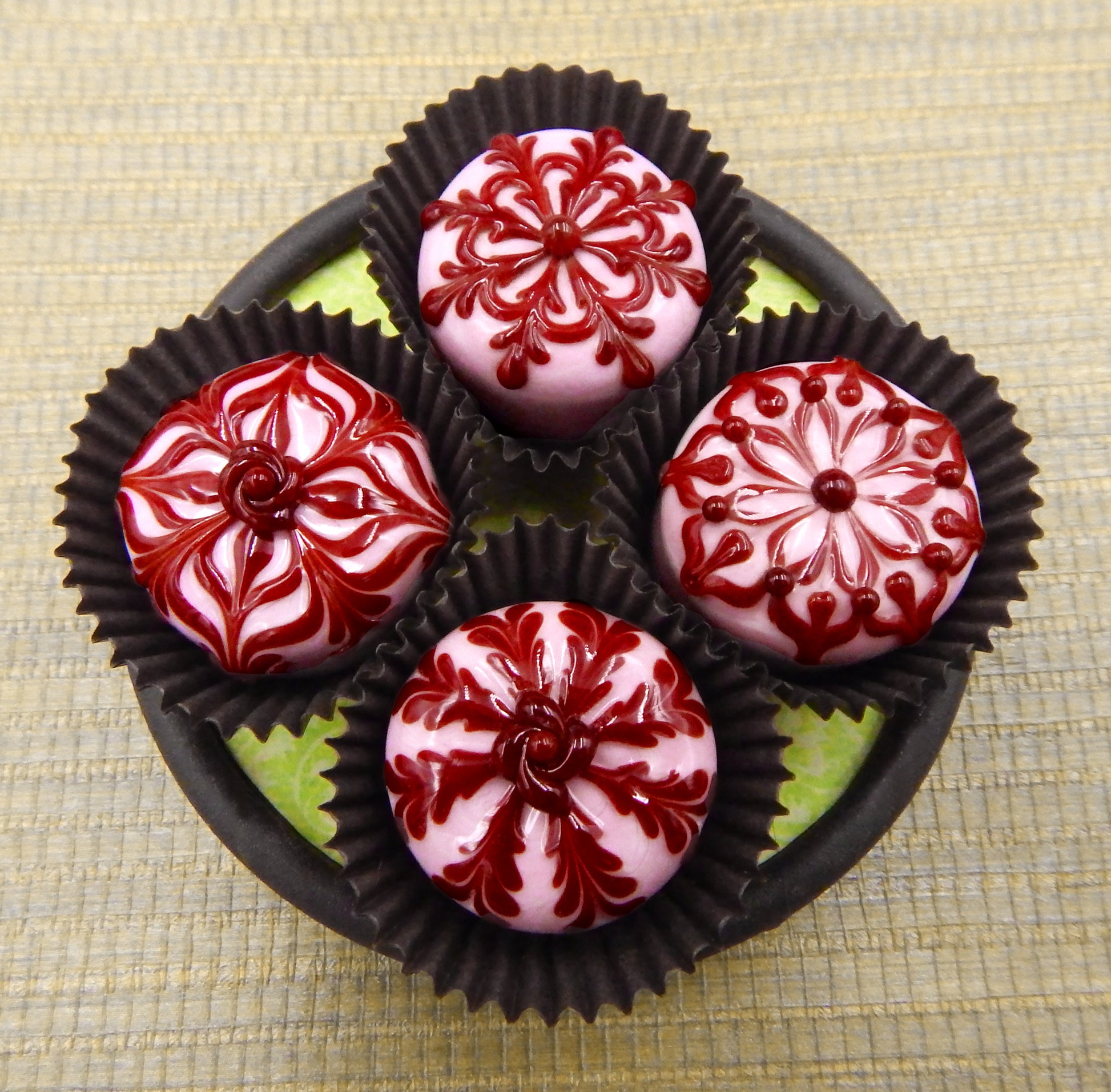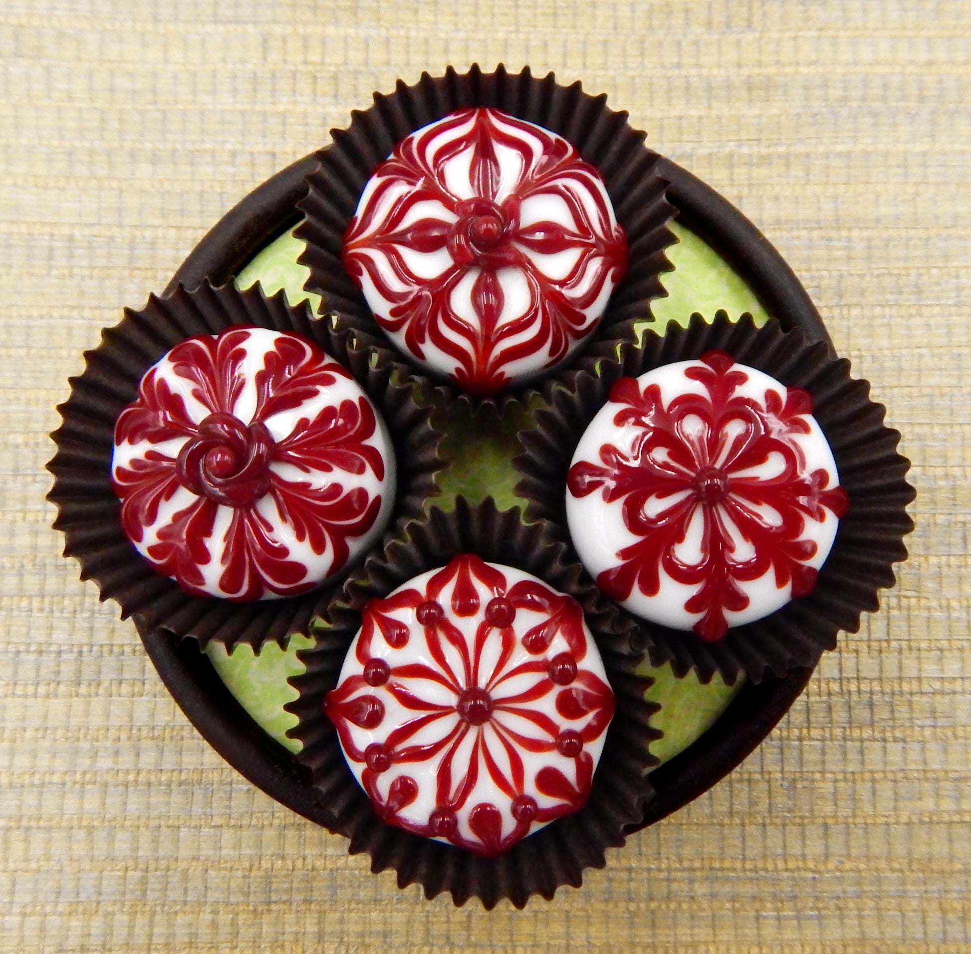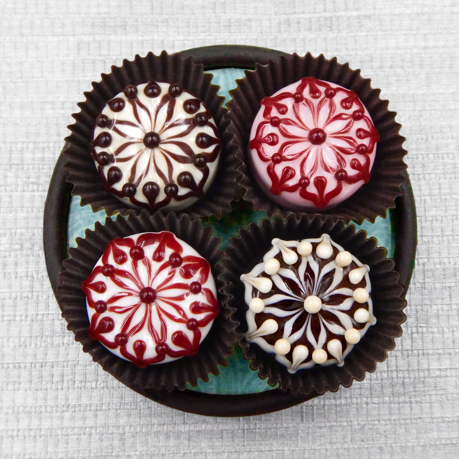 Handmade collectible solid art glass chocolates in four color combinations, each with a creamy embellishment on top, created from colorful glass utilizing flameworking techniques. Meticulous attention to detail has gone into the construction of each of our pieces to enhance its appeal and collectibility.