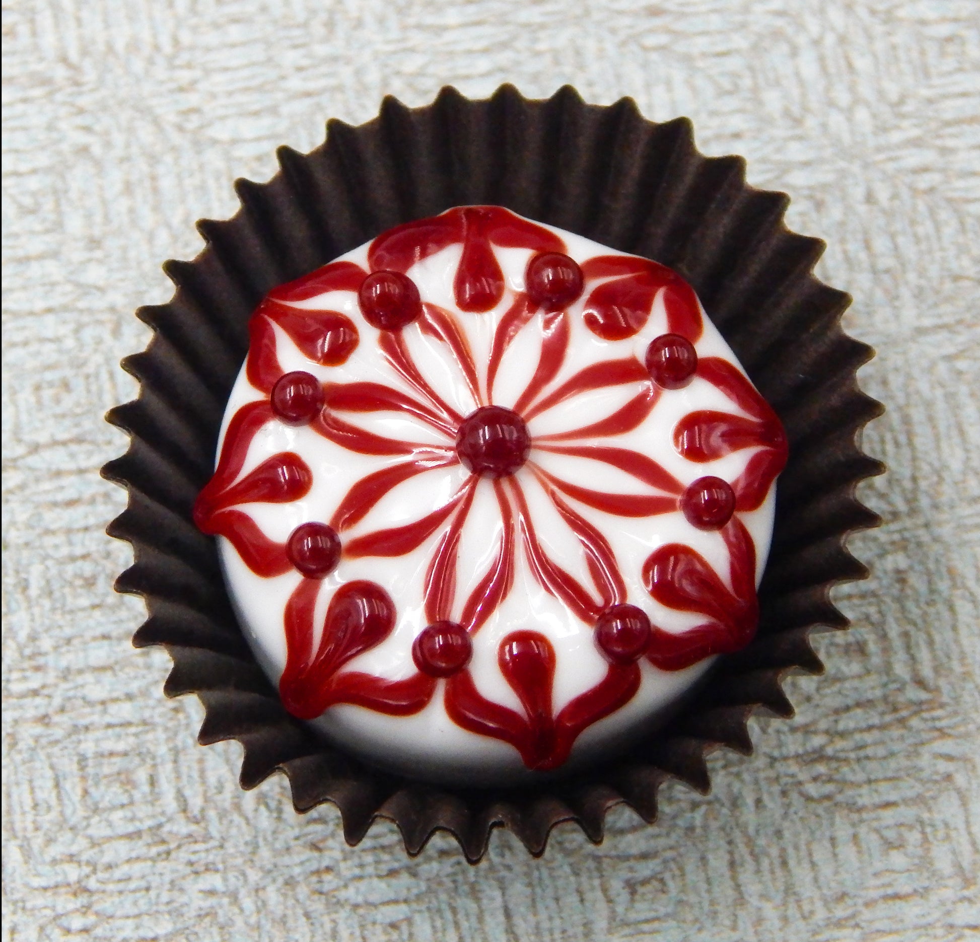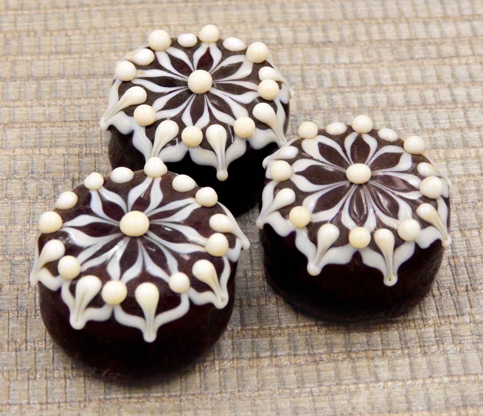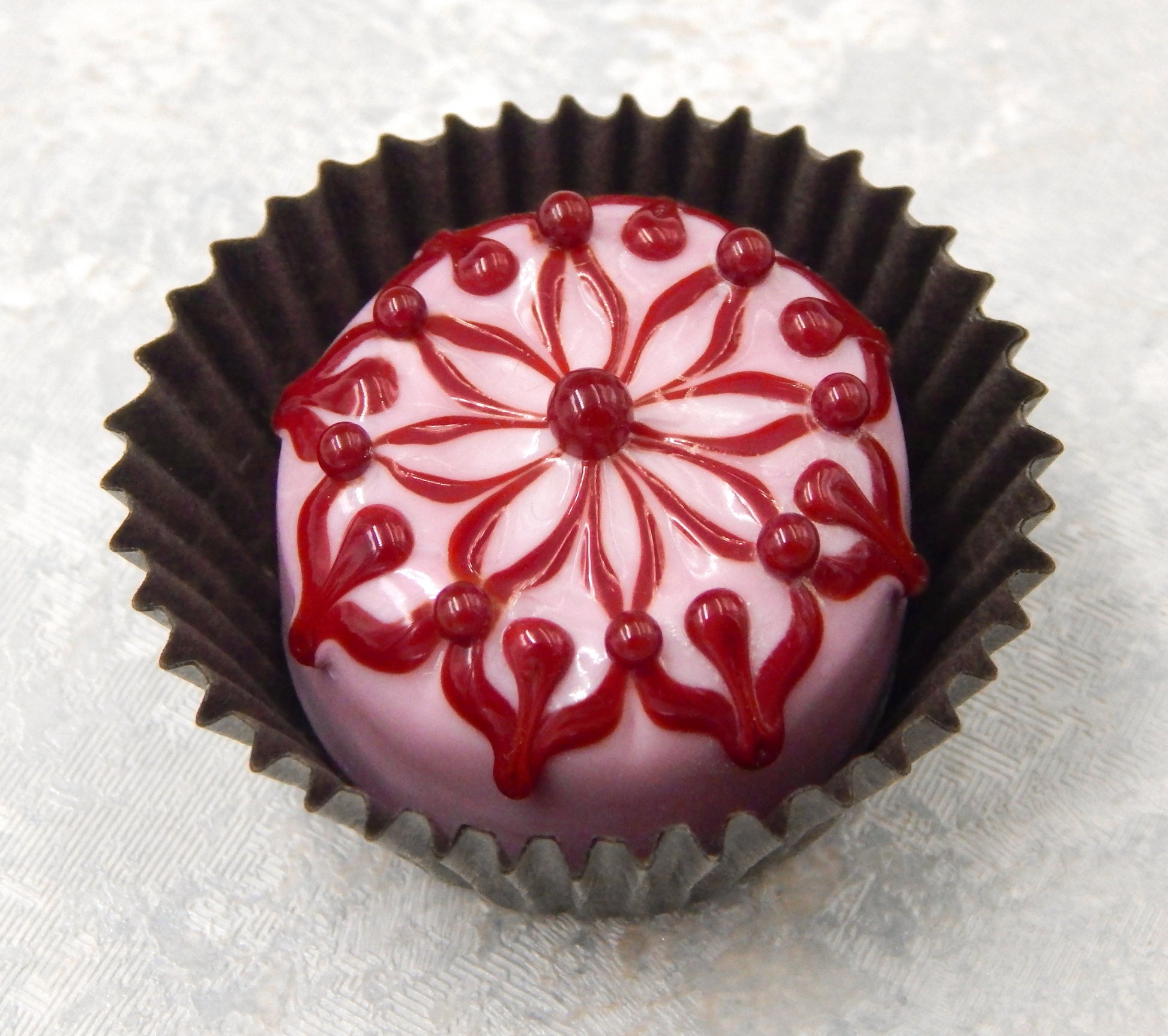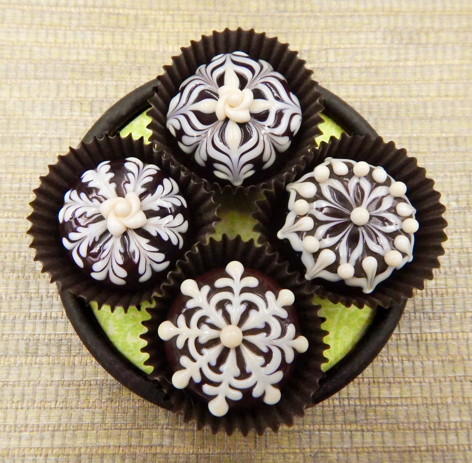 Handmade collectible solid art glass chocolates in four color combinations, each with a creamy embellishment on top, created from colorful glass utilizing flameworking techniques. Meticulous attention to detail has gone into the construction of each of our pieces to enhance its appeal and collectibility.