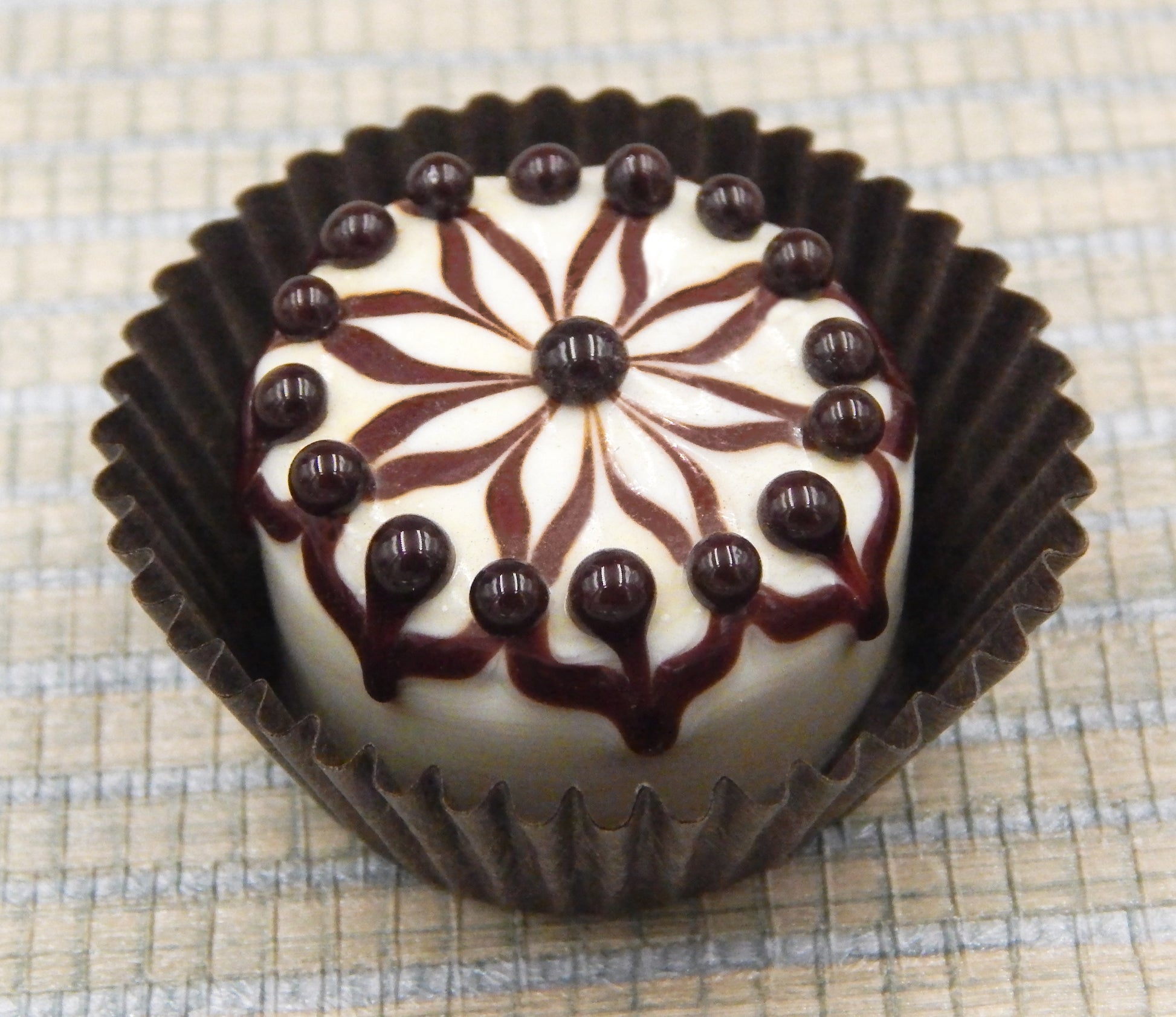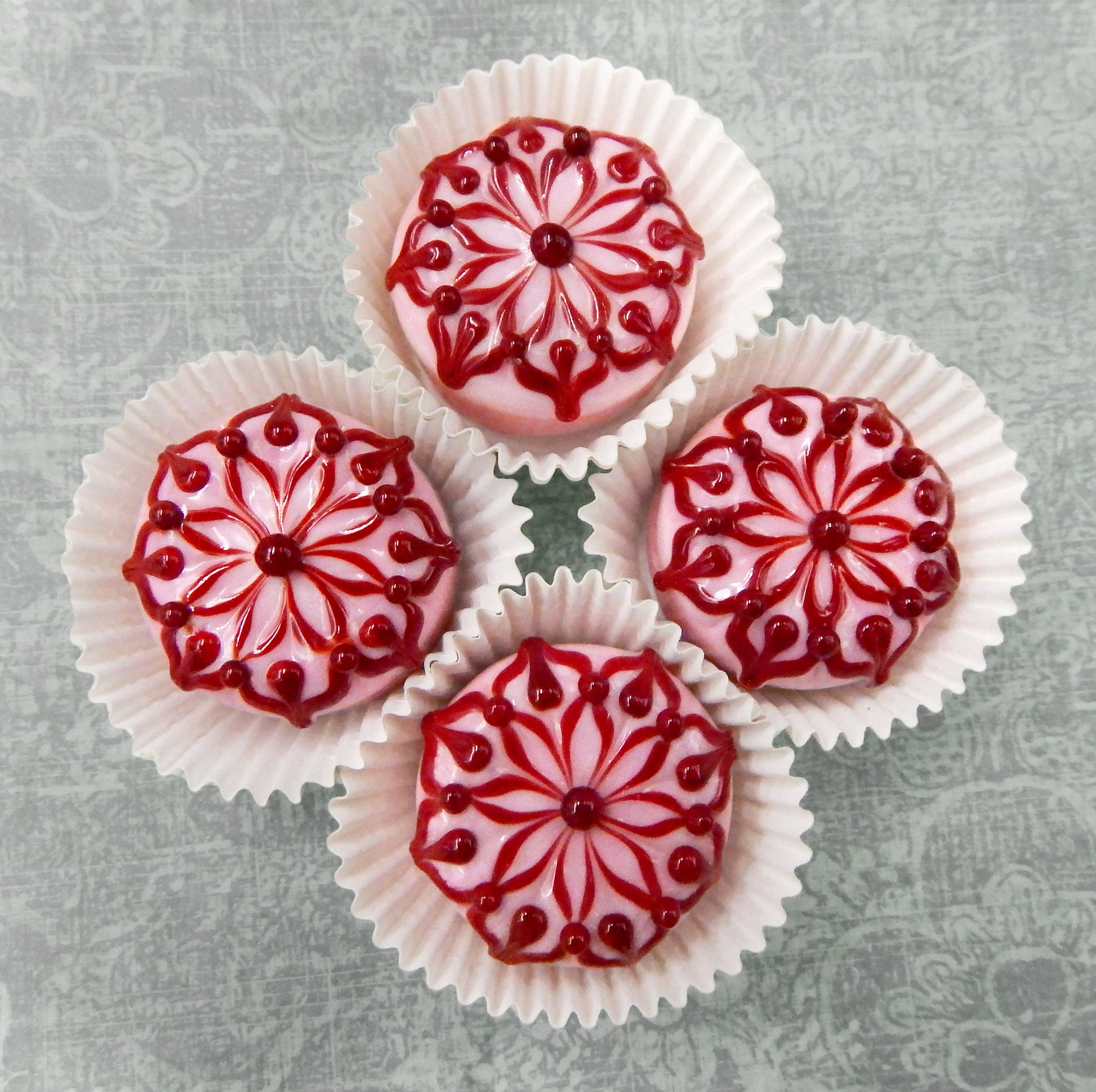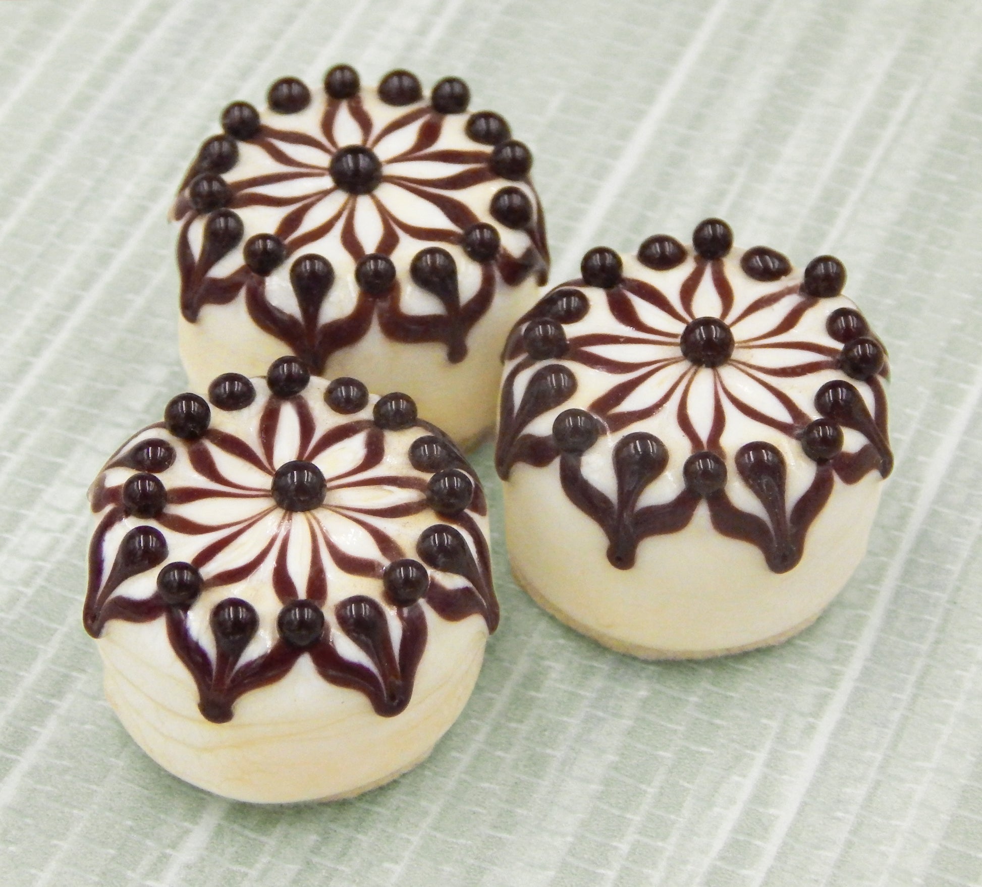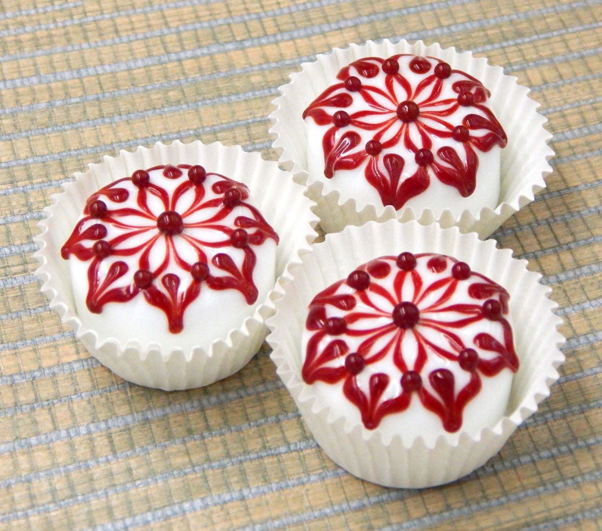 Handmade collectible solid art glass chocolates in four color combinations, each with a creamy embellishment on top, created from colorful glass utilizing flameworking techniques. Meticulous attention to detail has gone into the construction of each of our pieces to enhance its appeal and collectibility.