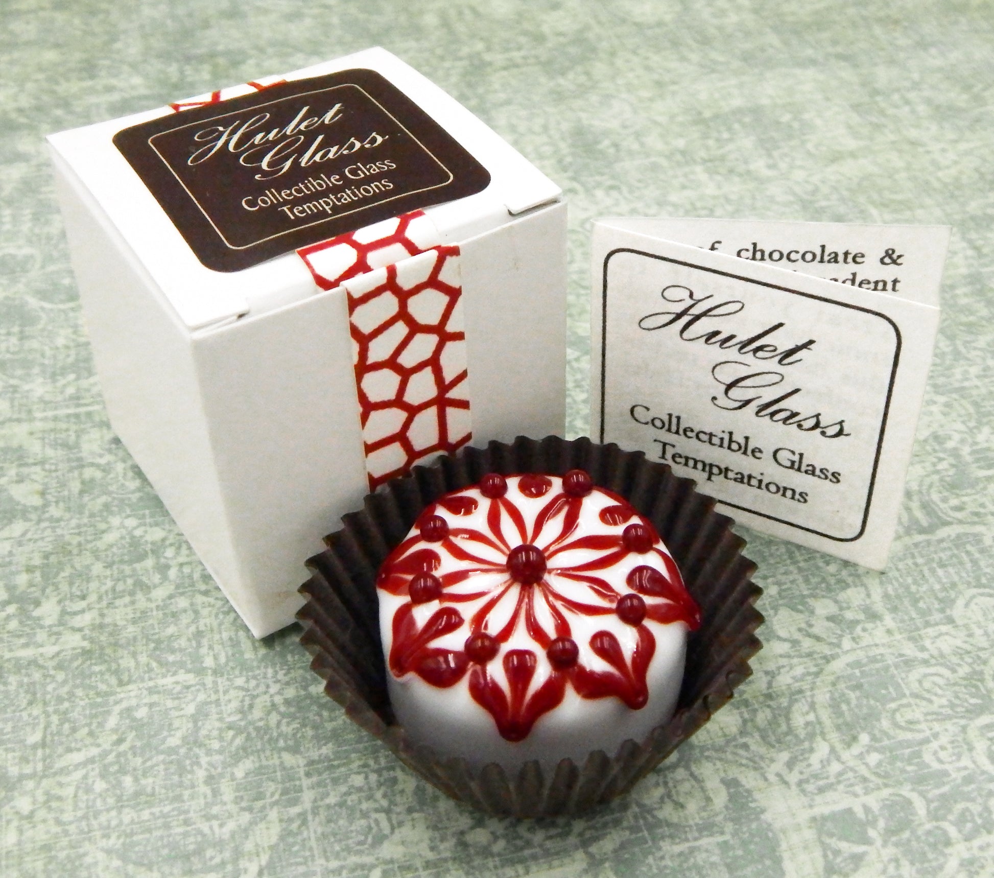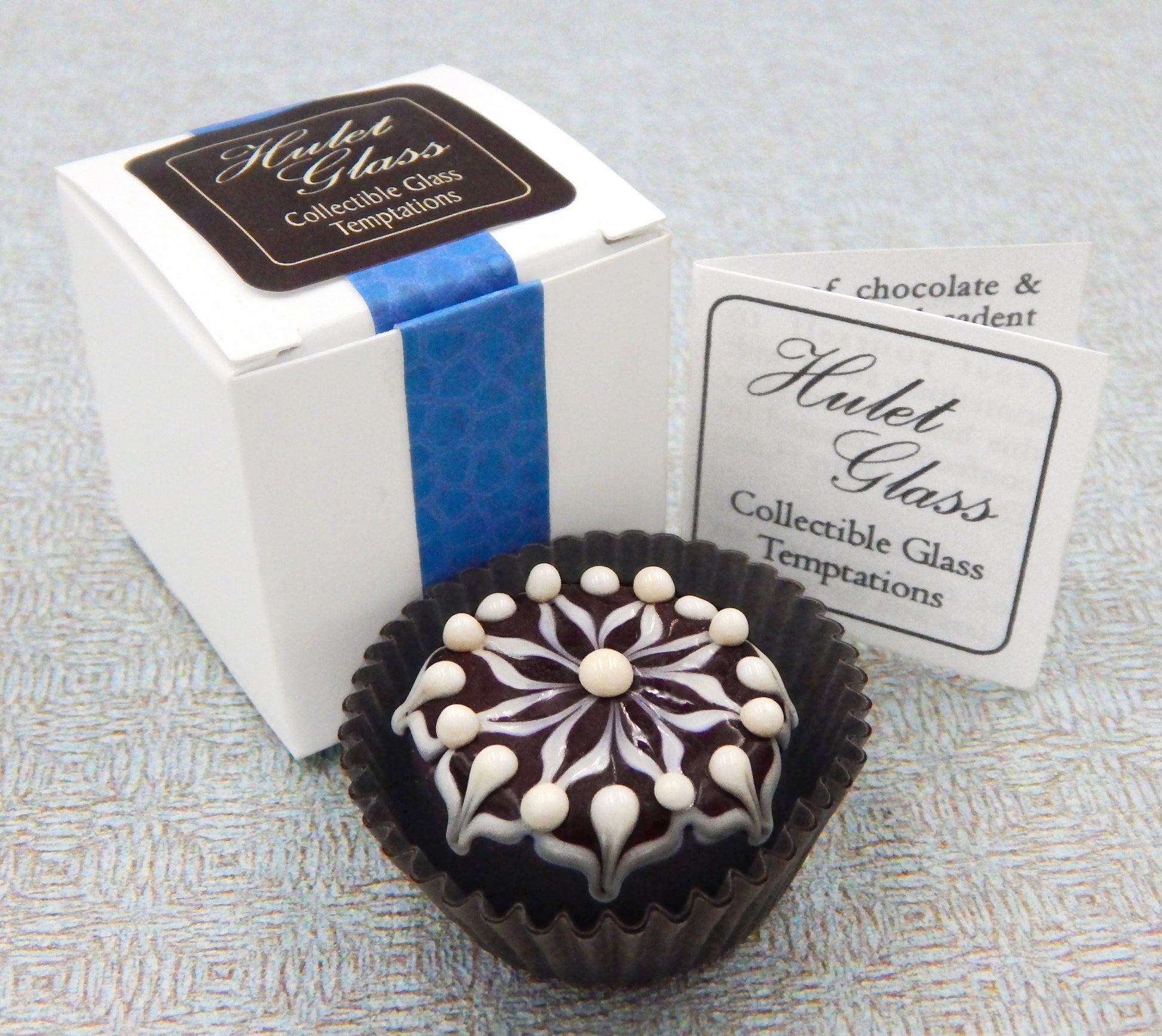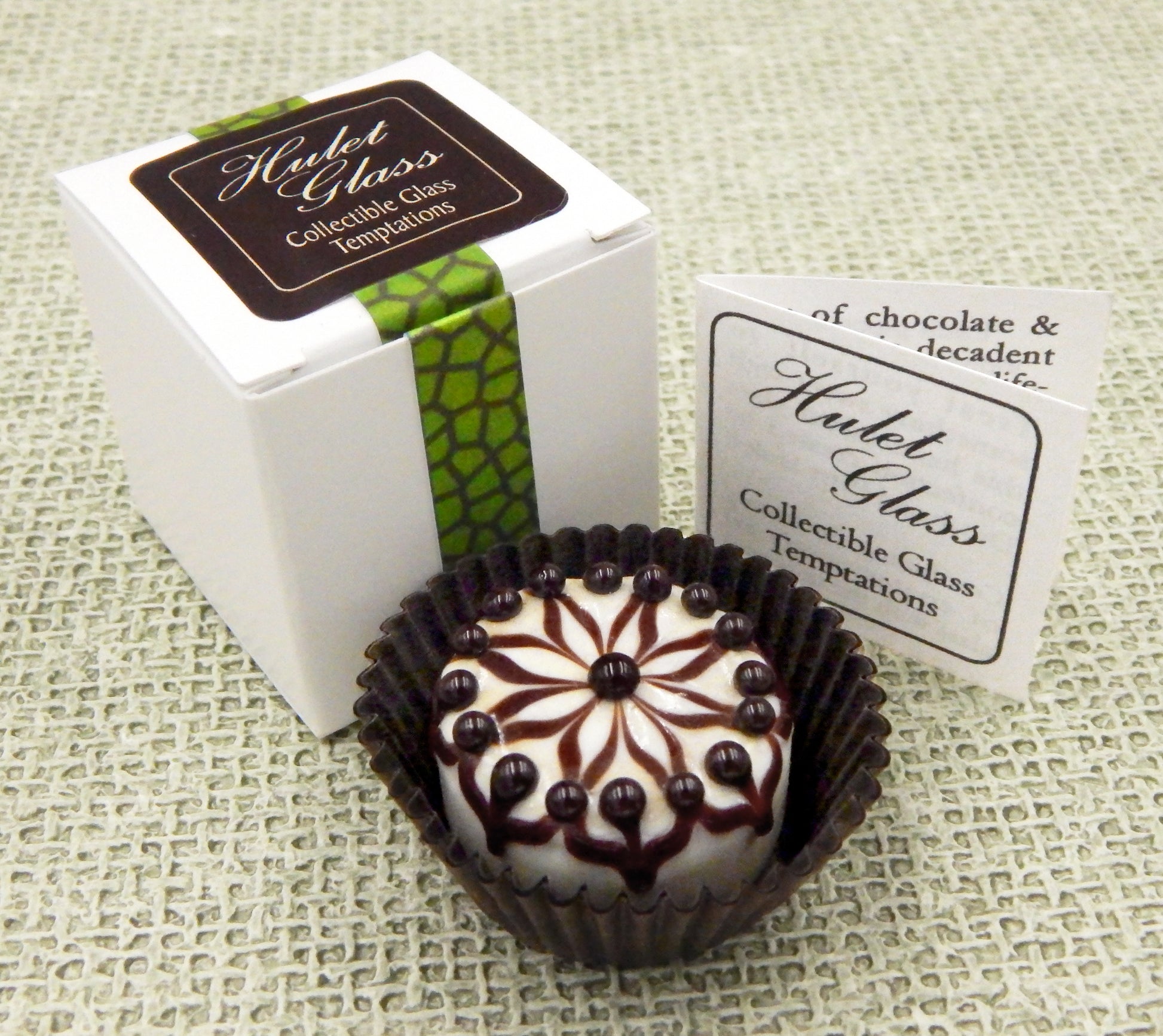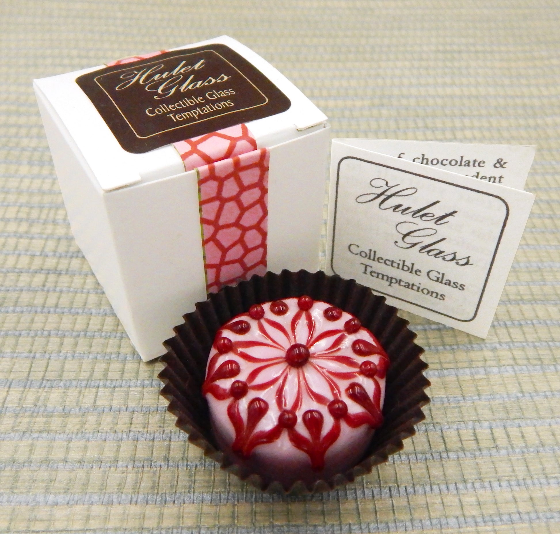 Each of these glass chocolate measures 1.25" x .75" (slightly larger than an actual chocolate candy) and sits in a fluted glassine paper candy cup. The bottom of the chocolate is covered in felt to protect the surface it will sit upon. Each beautiful glass chocolate is signed (Hulet), dated and comes to you in a colorful gift box with an enclosure card telling a bit about the piece.