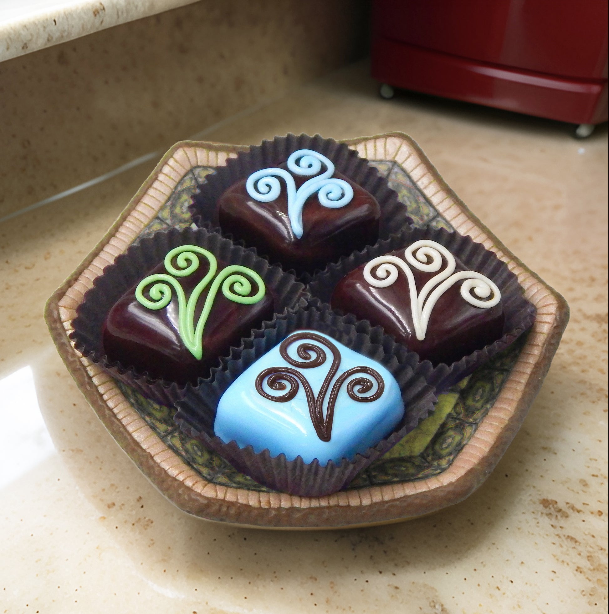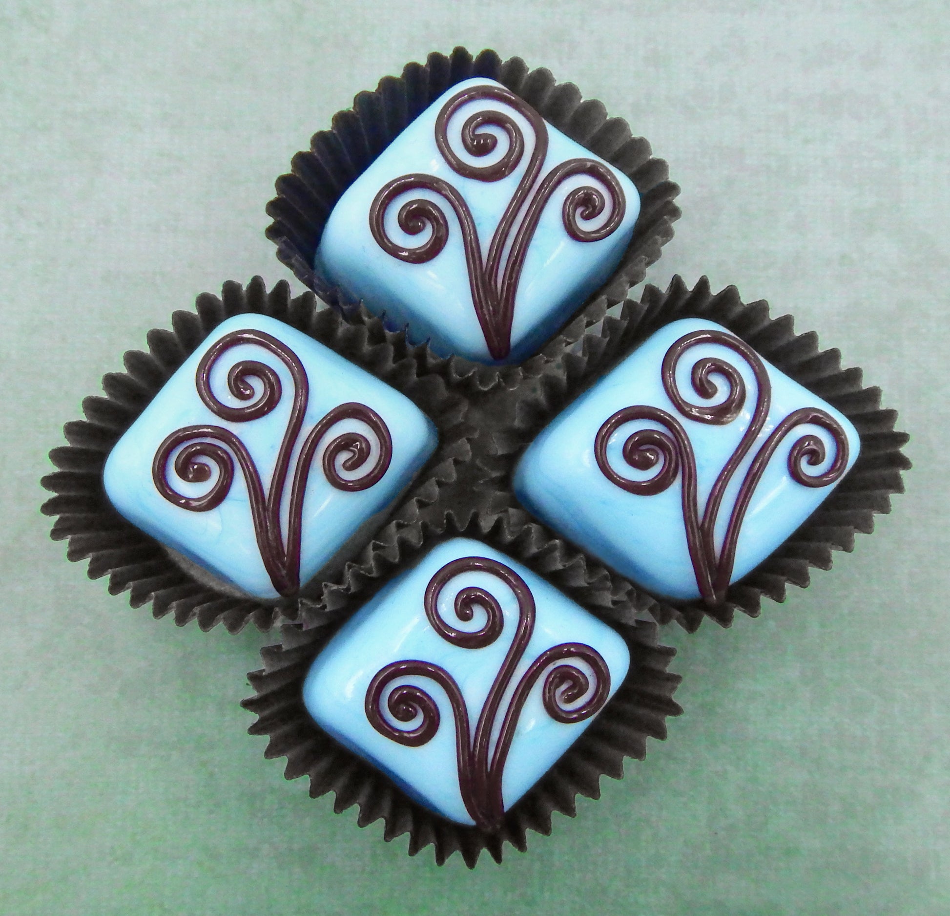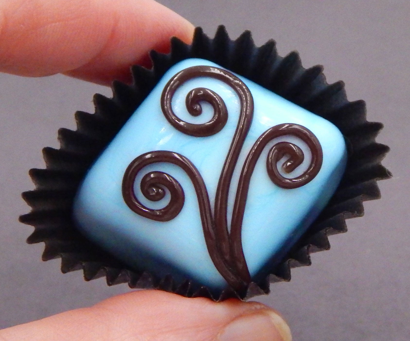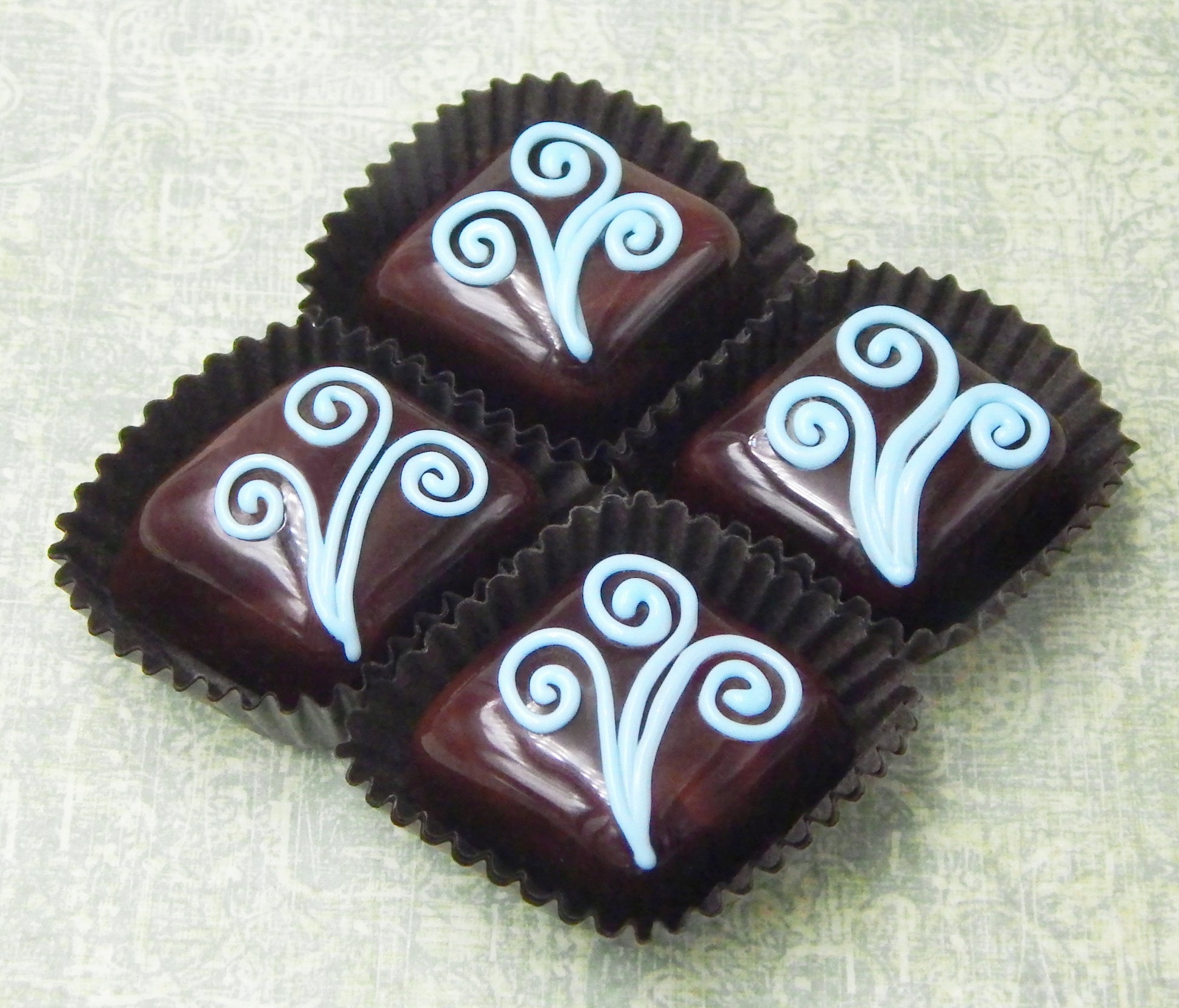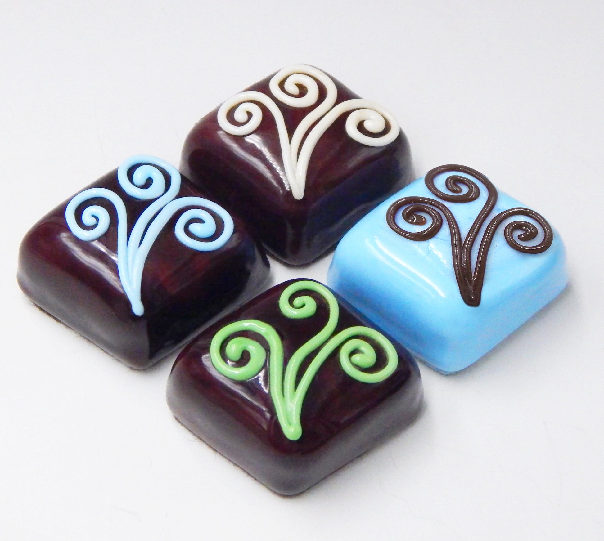 Handmade collectible solid glass chocolates with creamy swirl designs on top created from colorful glass utilizing ancient lampworking techniques. Meticulous attention to detail has gone into the construction of each of our pieces to enhance its appeal and collectibility.
