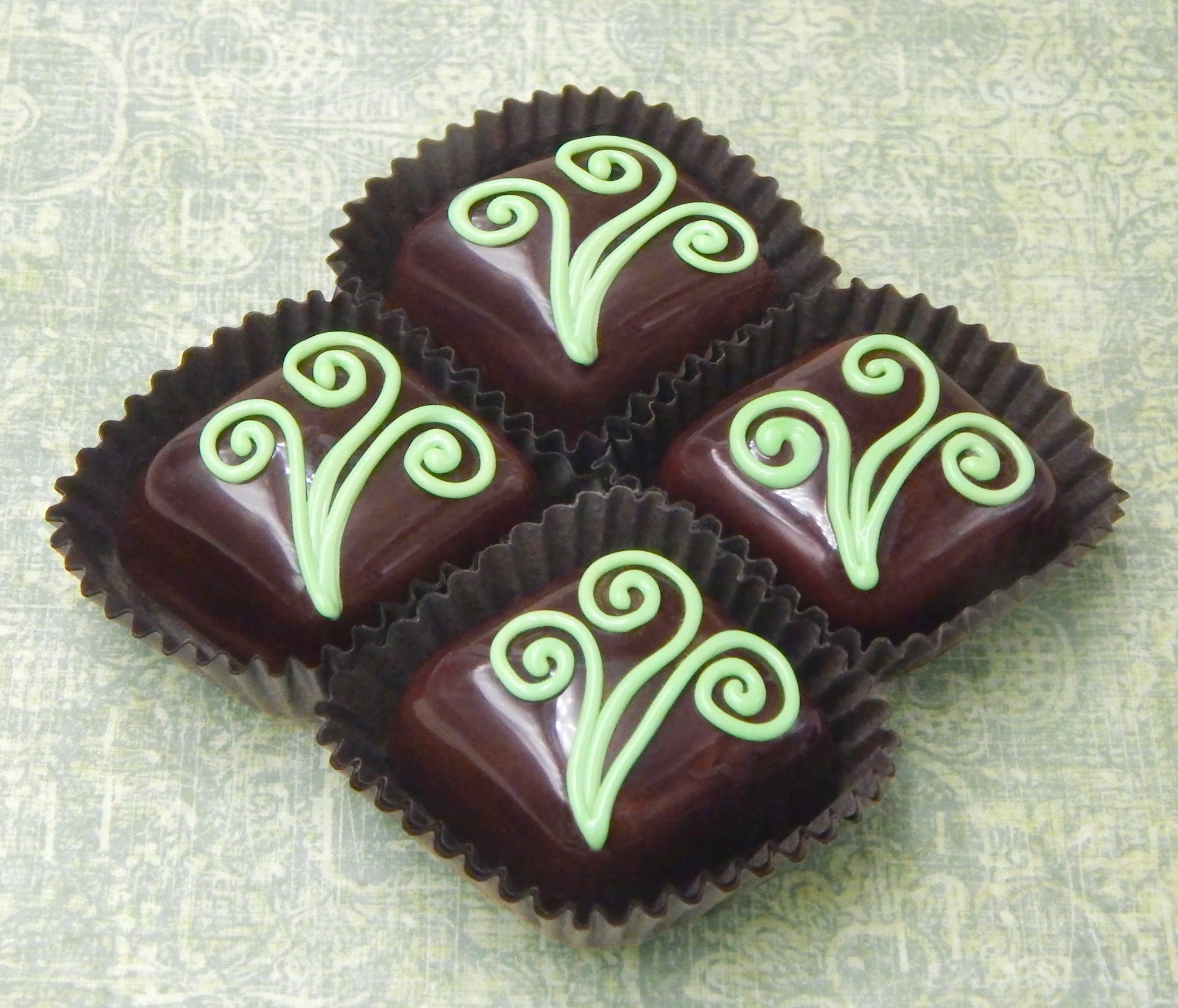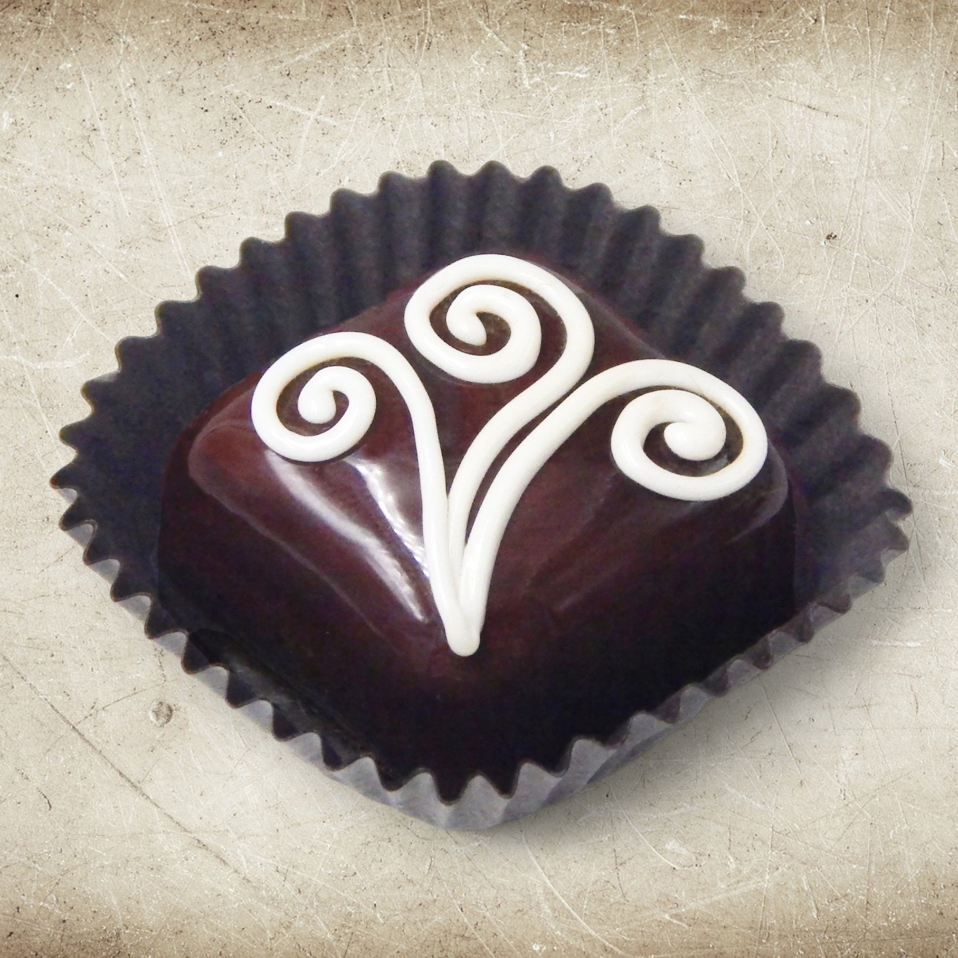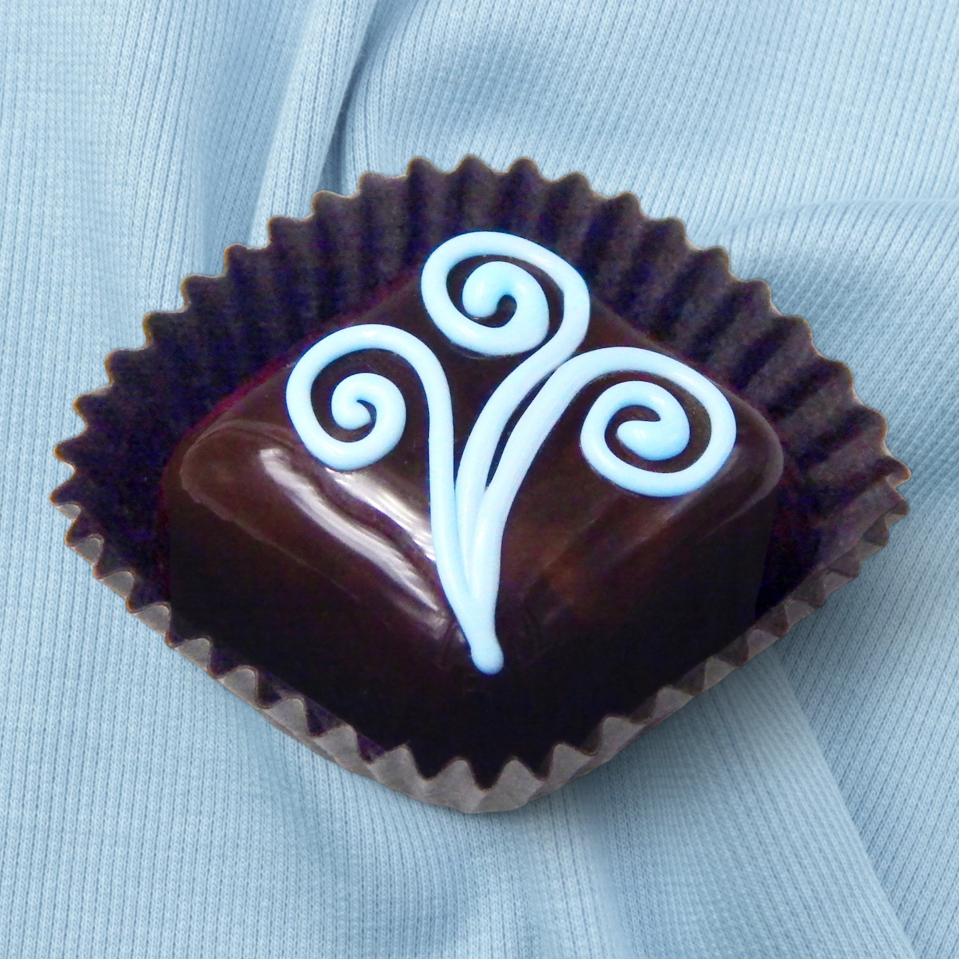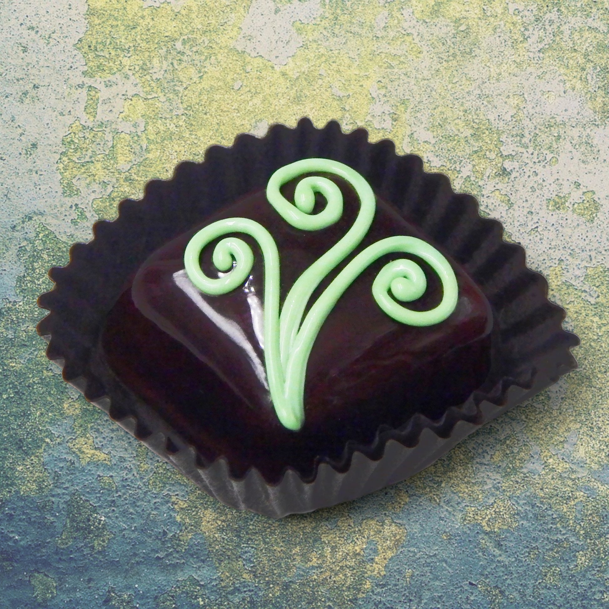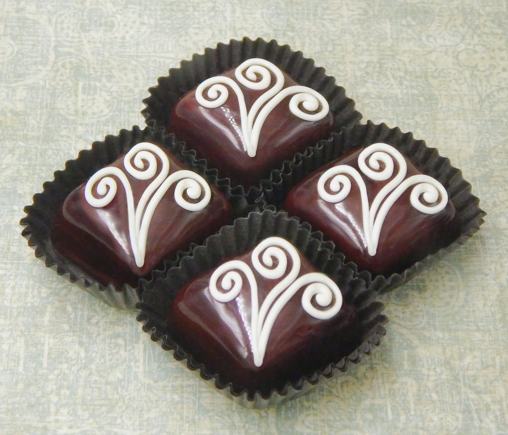 Handmade collectible solid glass chocolates with creamy swirl designs on top created from colorful glass utilizing ancient lampworking techniques. Meticulous attention to detail has gone into the construction of each of our pieces to enhance its appeal and collectibility.