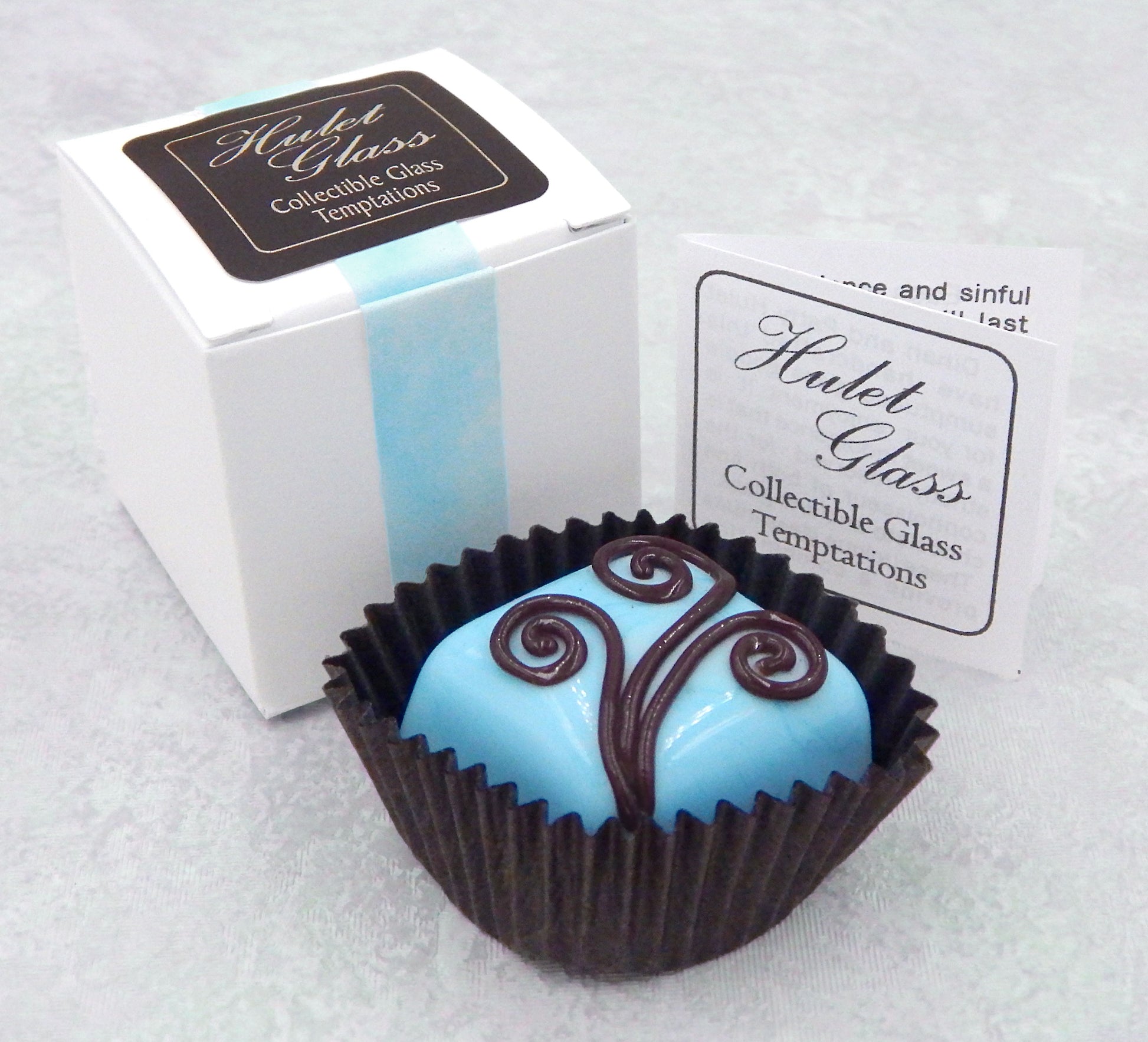 The glass chocolate measures approximately 1.75" x 1.25" x 1" (slightly larger than an actual chocolate candy) and sits in a fluted glassine paper candy cup. The bottom of the chocolate is covered in felt to protect the surface it will sit upon. Each beautiful glass chocolate is signed (Hulet), dated and comes to you in a small gift box with an enclosure card telling a bit about the piece.