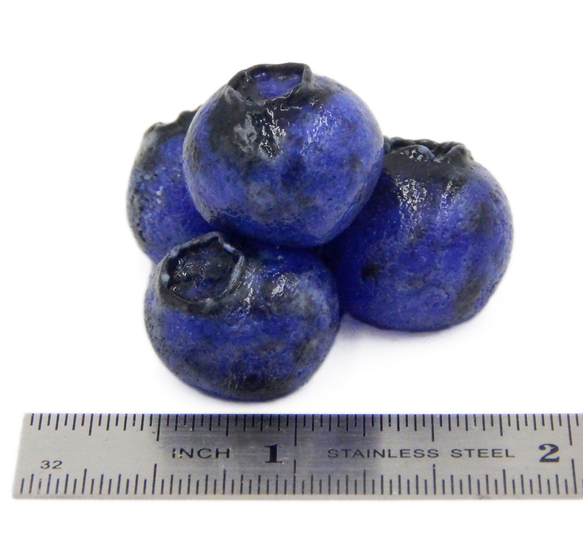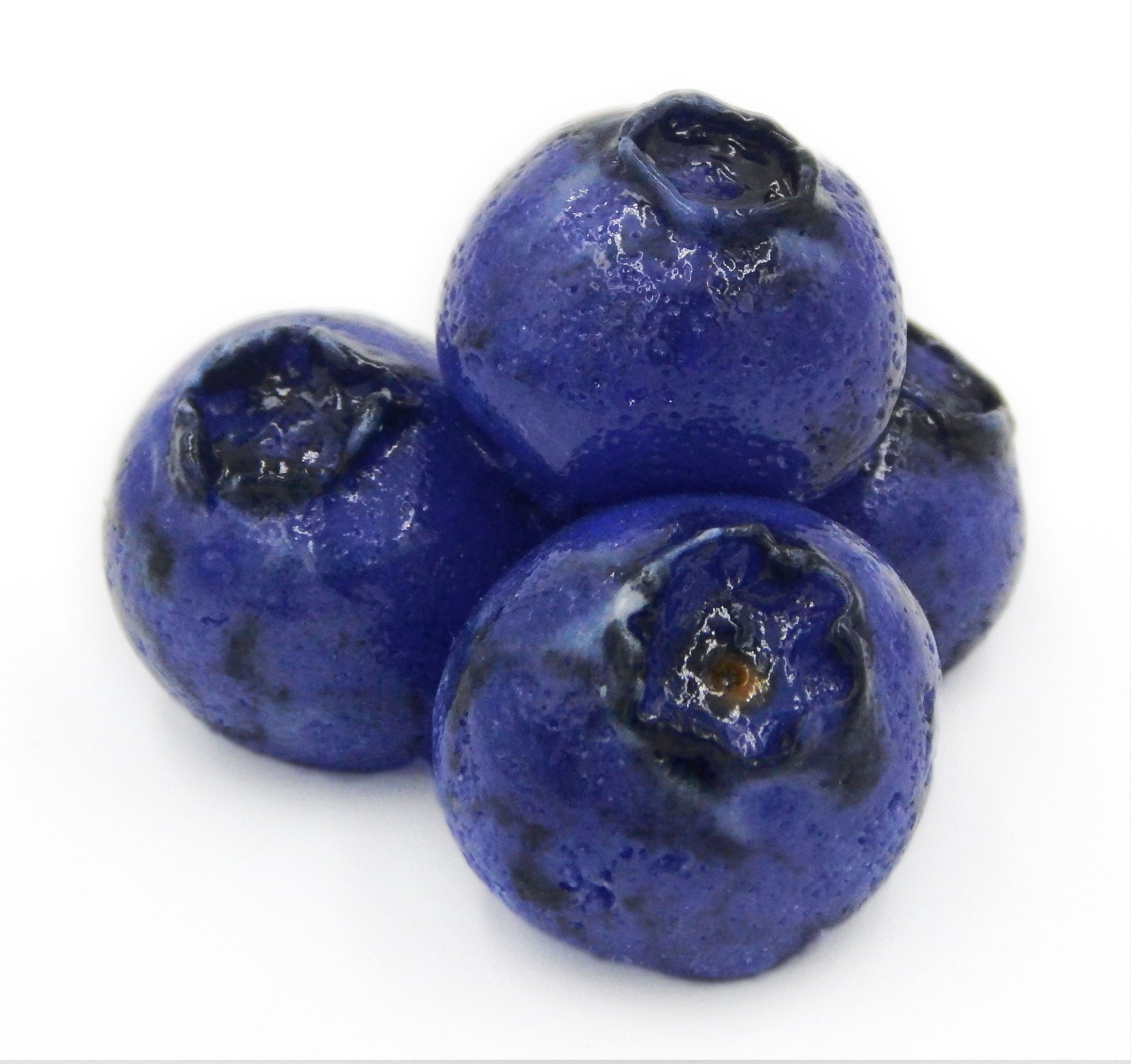 This collectible solid glass cluster of 4 marzipan blueberries is created from finely ground colored glass powders using variations of the centuries old technique of pate de verre. Meticulous attention to detail has gone into the construction of each of our pieces to enhance its appeal and collectibility.