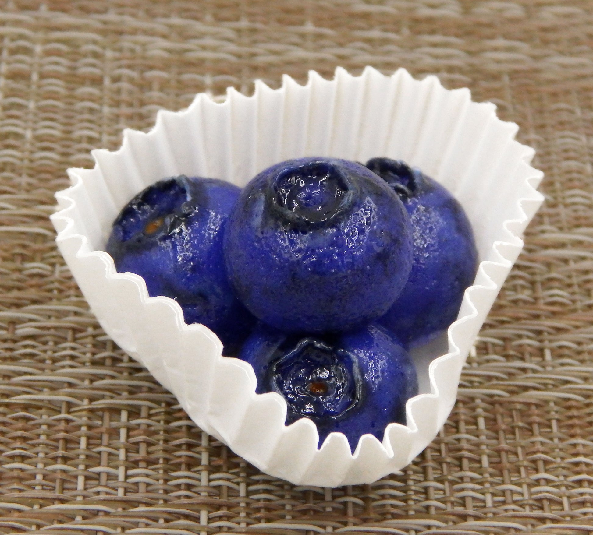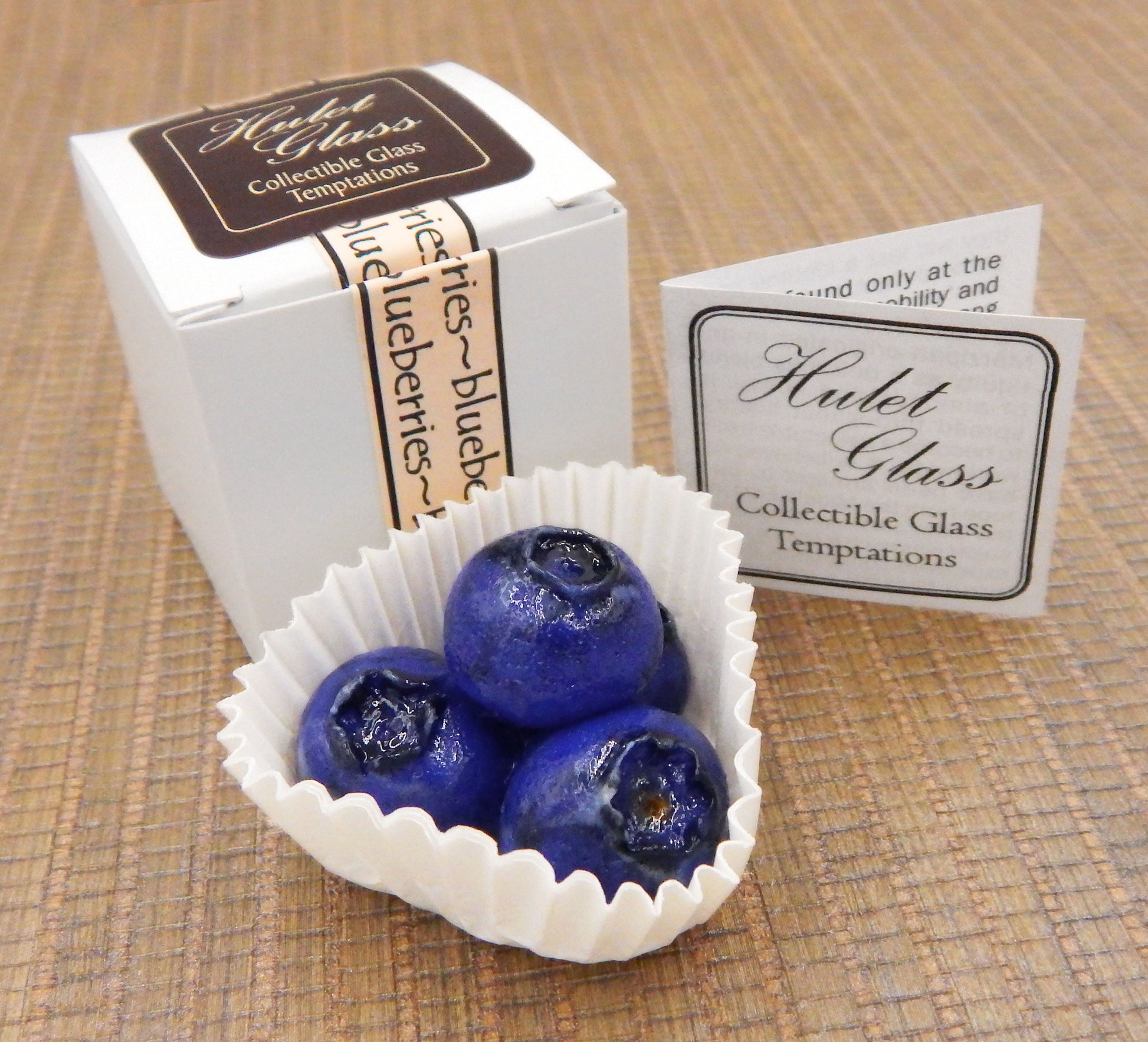 This glass marzipan blueberry cluster measures approx. 1.5" x 1.5" x 1" and sits in a fluted glassine paper candy cup. The bottom of the marzipan is covered in felt to protect the surface it will sit upon. Each of our beautiful glass treats is signed (Hulet), dated and comes to you in a small gift box with an enclosure card telling a bit about the piece.