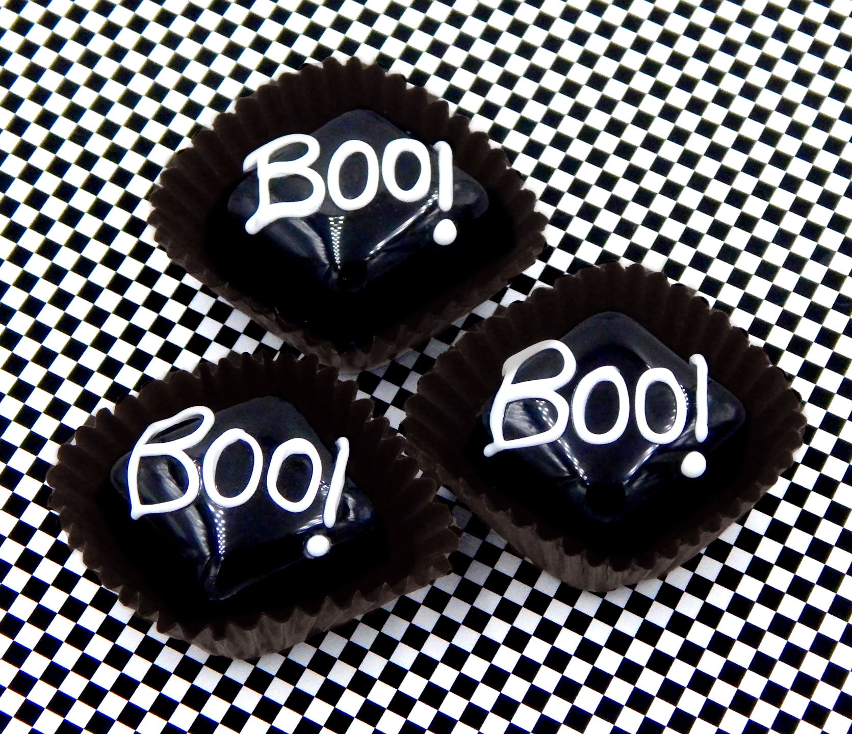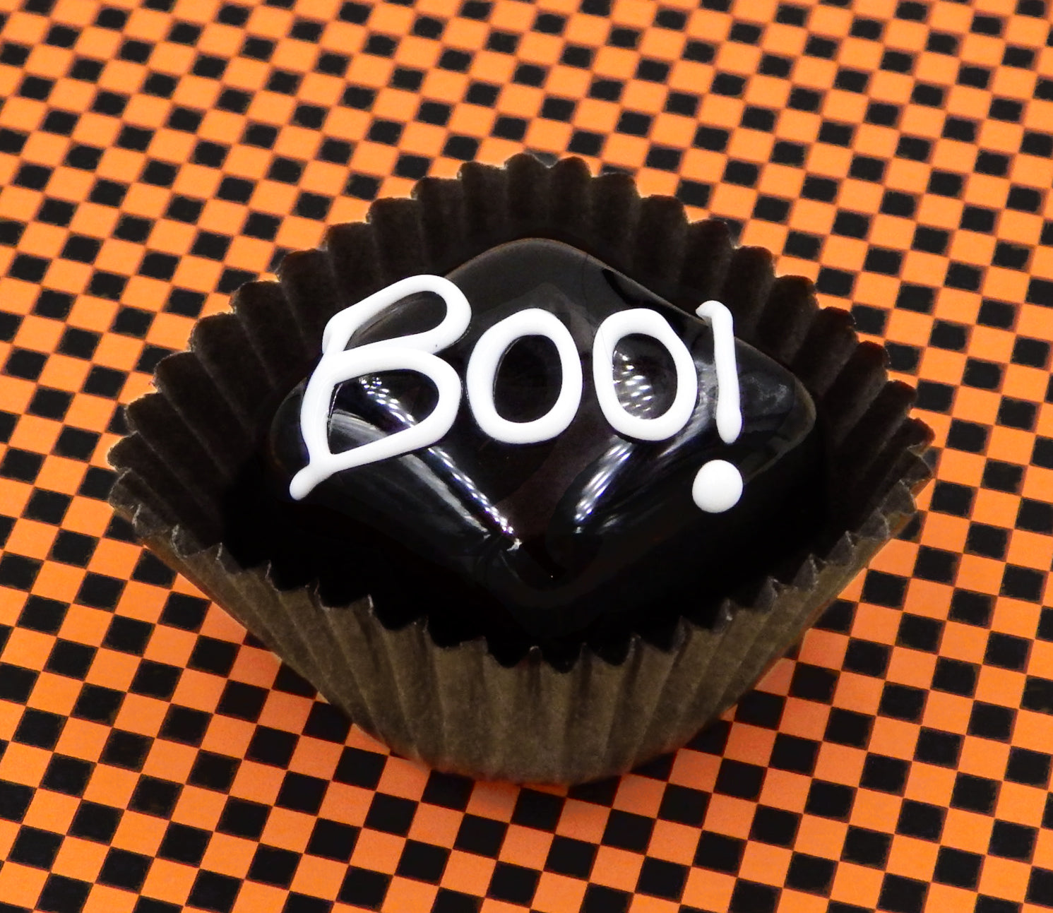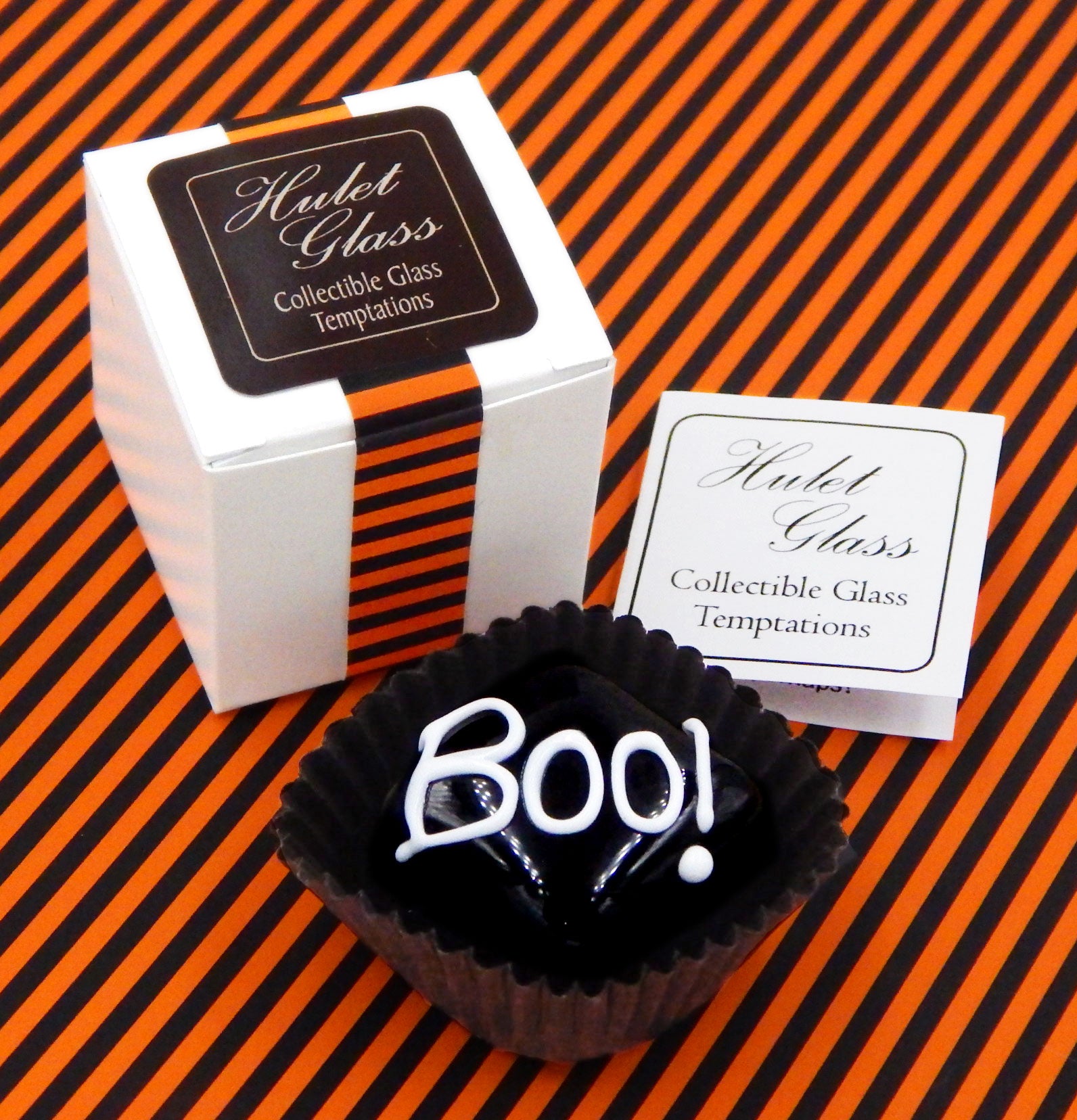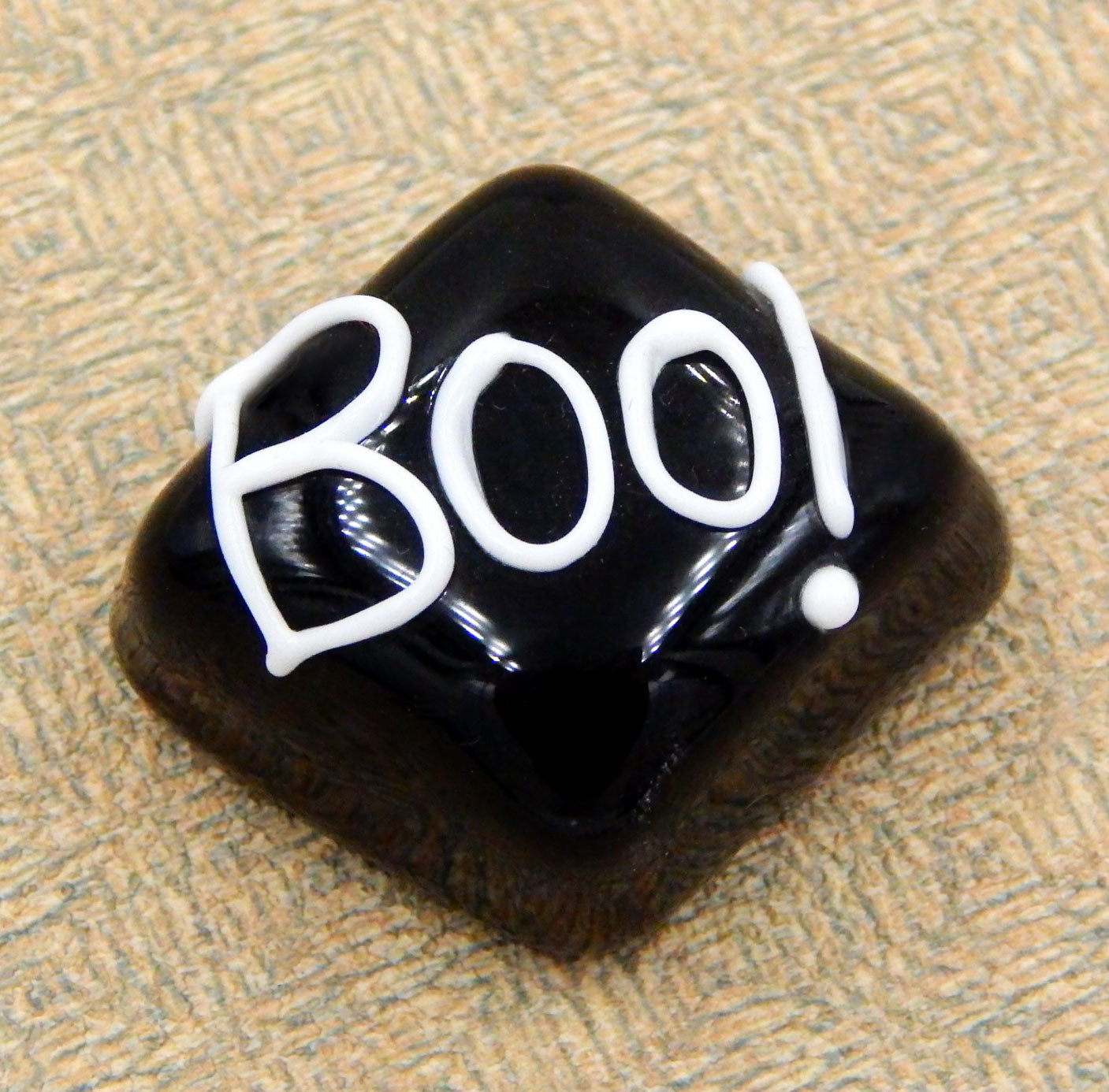 A handmade collectible solid glass licorice chocolate with a spooky white 'Boo!' on top created from colorful glass utilizing flameworking techniques. Meticulous attention to detail has gone into the construction of each of our pieces to enhance its appeal and collectibility.