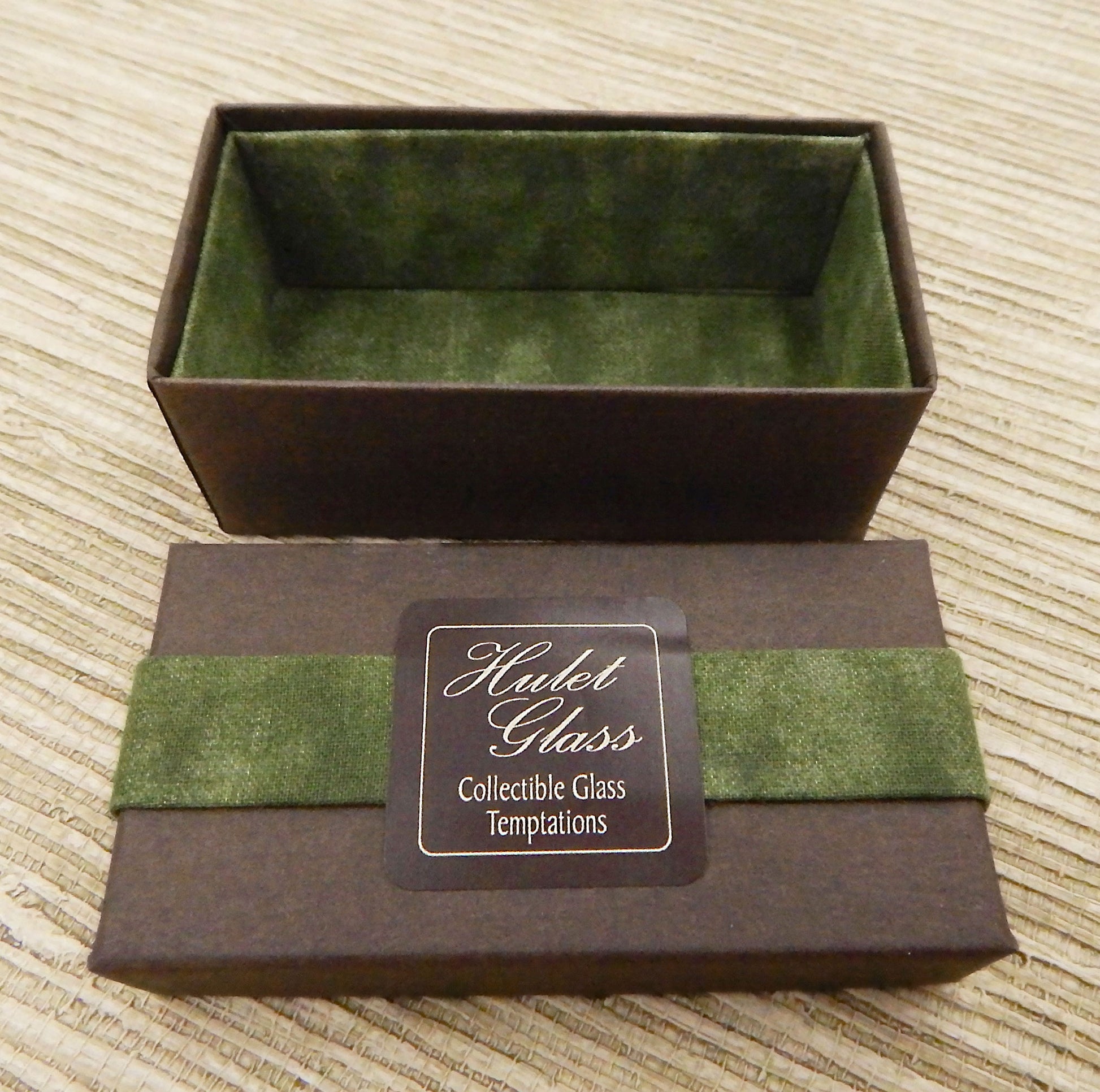 This small box holds 2 of our glass chocolates and measures 3.25" x 1.75" x 1.25". It is constructed of deep brown rigid double-wall paperboard with a matte finish. It is lined with 100% cotton fabric that is deep olive green in color.