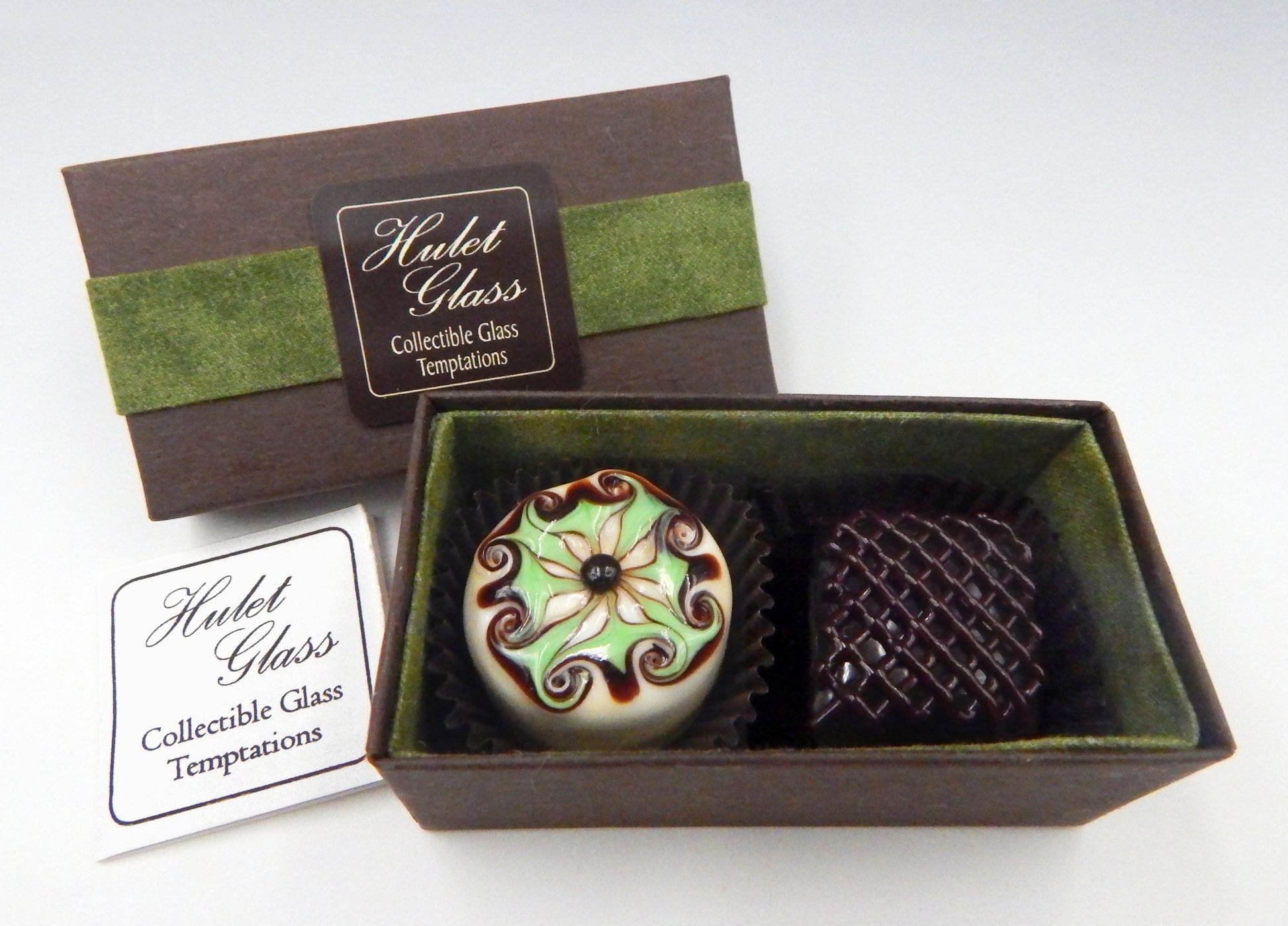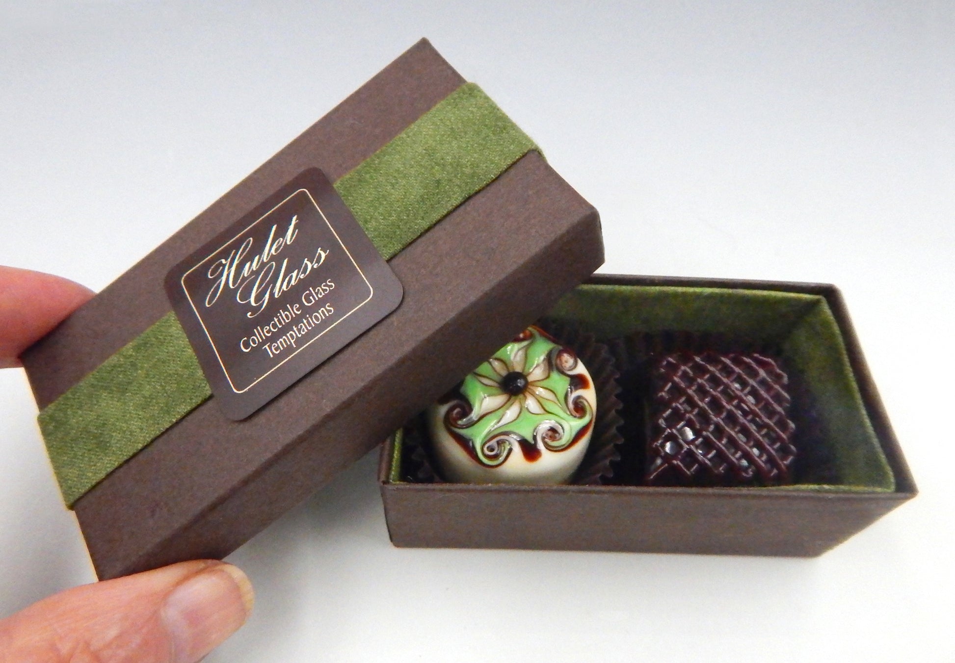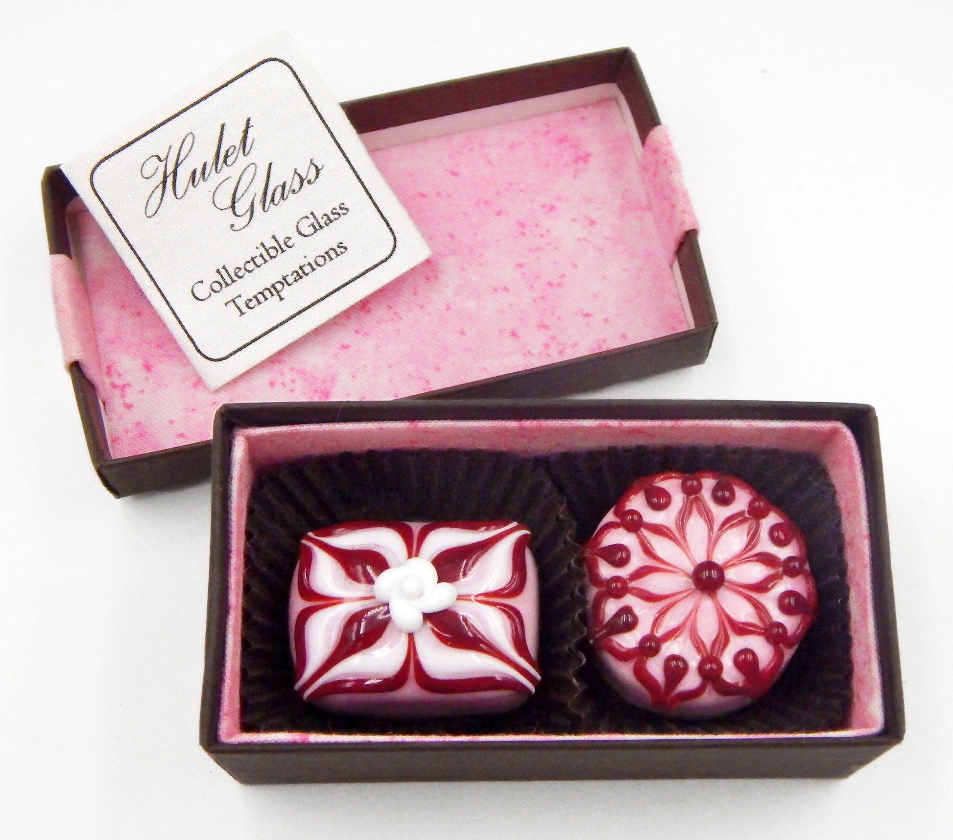 Your choice of a handmade box of 2 collectible solid glass chocolates. Each box is created by the Hulet sisters to frame the glass chocolates and securely protect them for years to come.