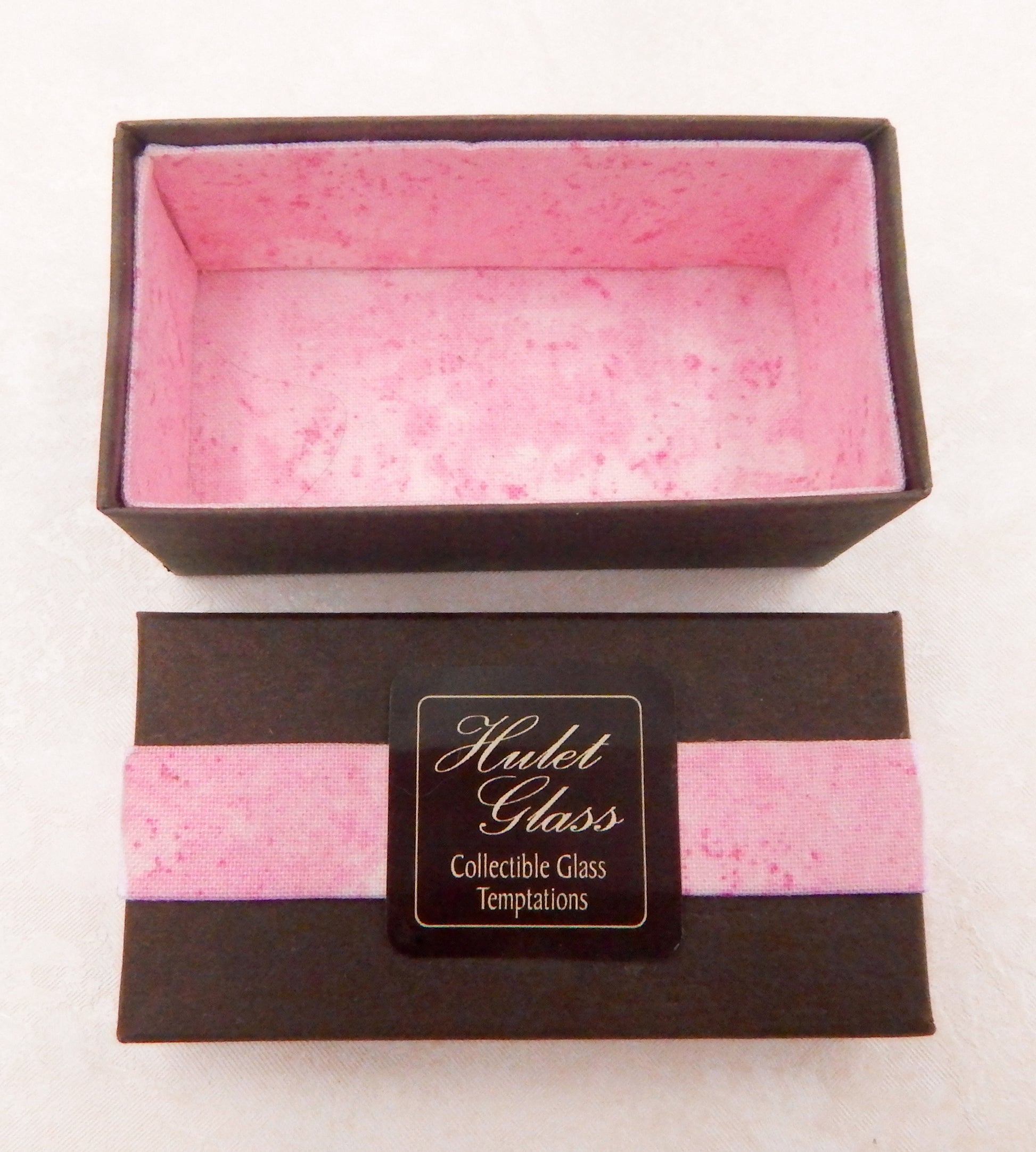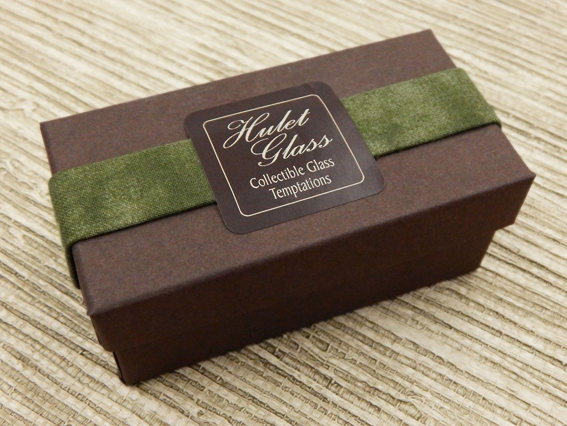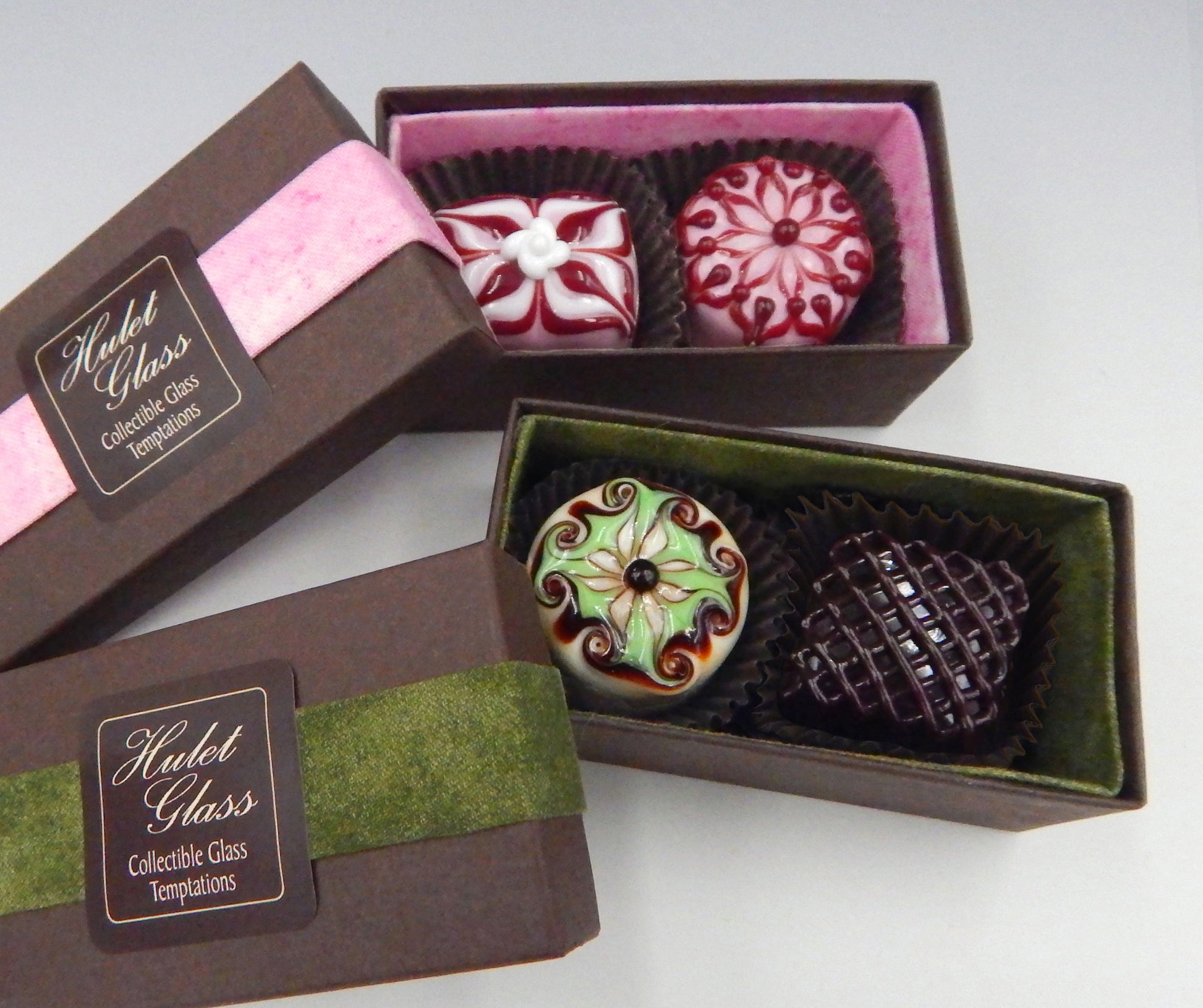 Your choice of a handmade box of 2 collectible solid glass chocolates. Each box is created by the Hulet sisters to frame the glass chocolates and securely protect them for years to come.