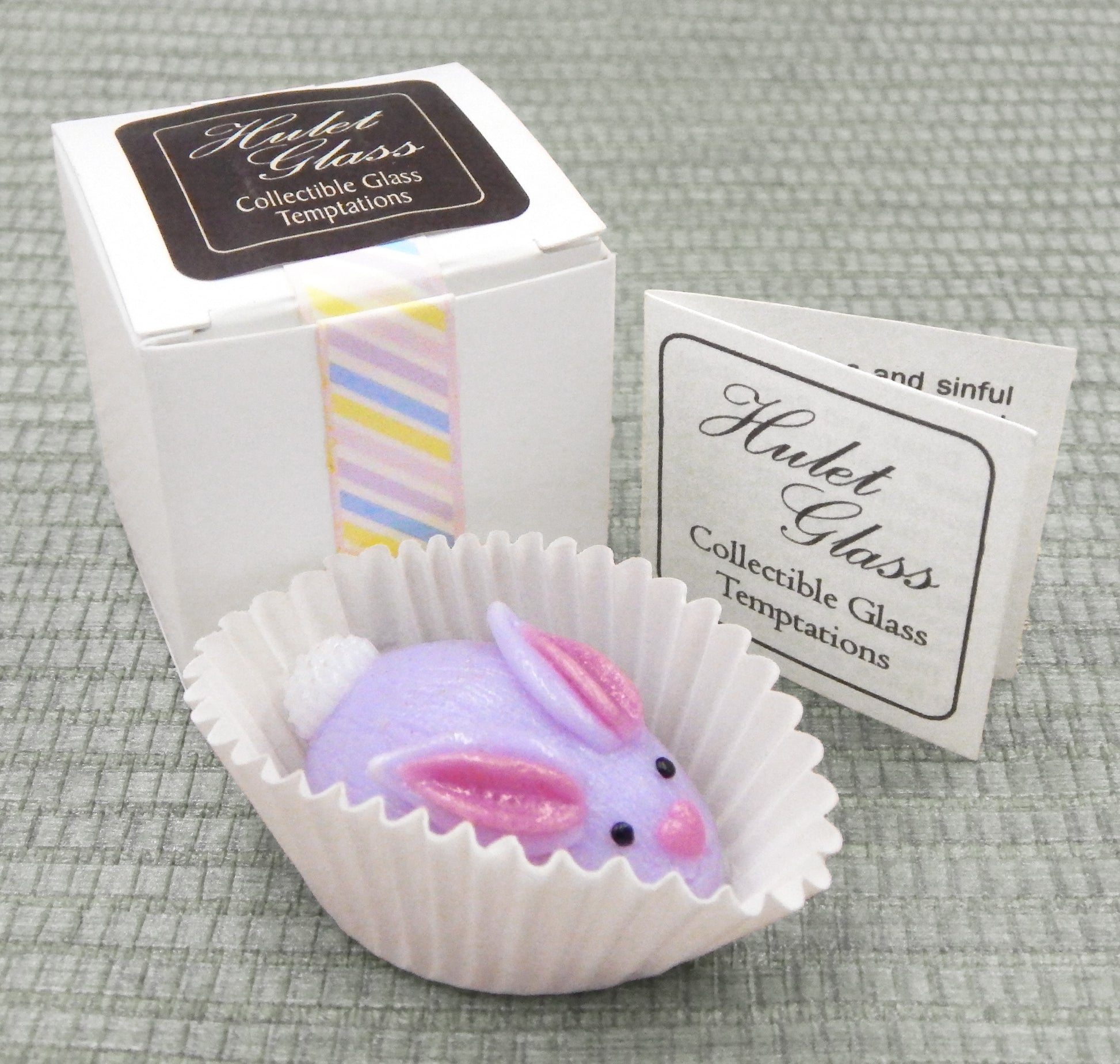 The glass bunny measures 1.75" x 1.25" x 1" (slightly larger than an actual chocolate candy) and sits in a fluted glassine paper candy cup. The bottom of the chocolate is covered in felt to protect the surface it will sit upon. Each beautiful glass bunny is signed (Hulet), dated and comes to you in a colorful gift box with an enclosure card telling a bit about the piece.
