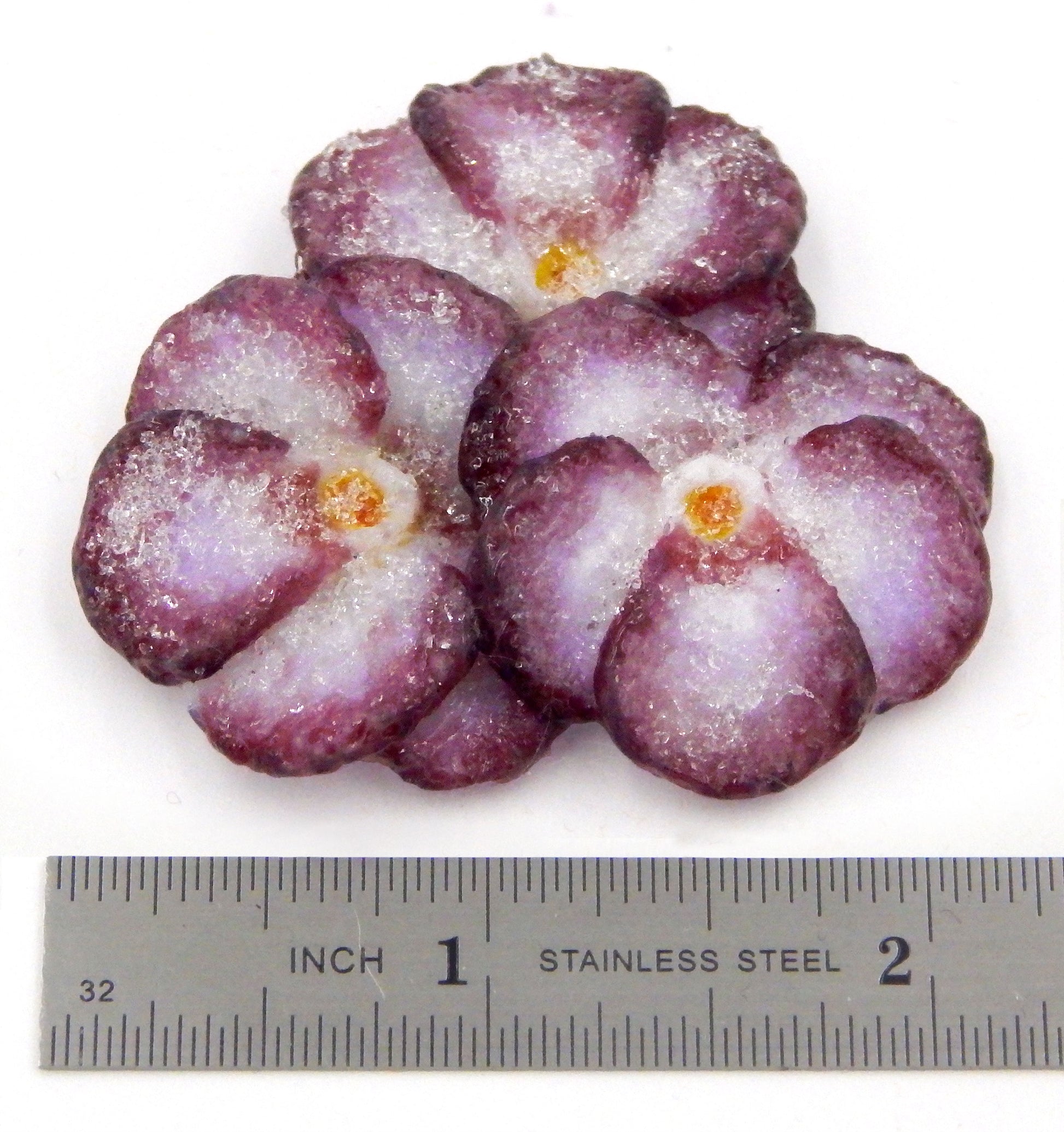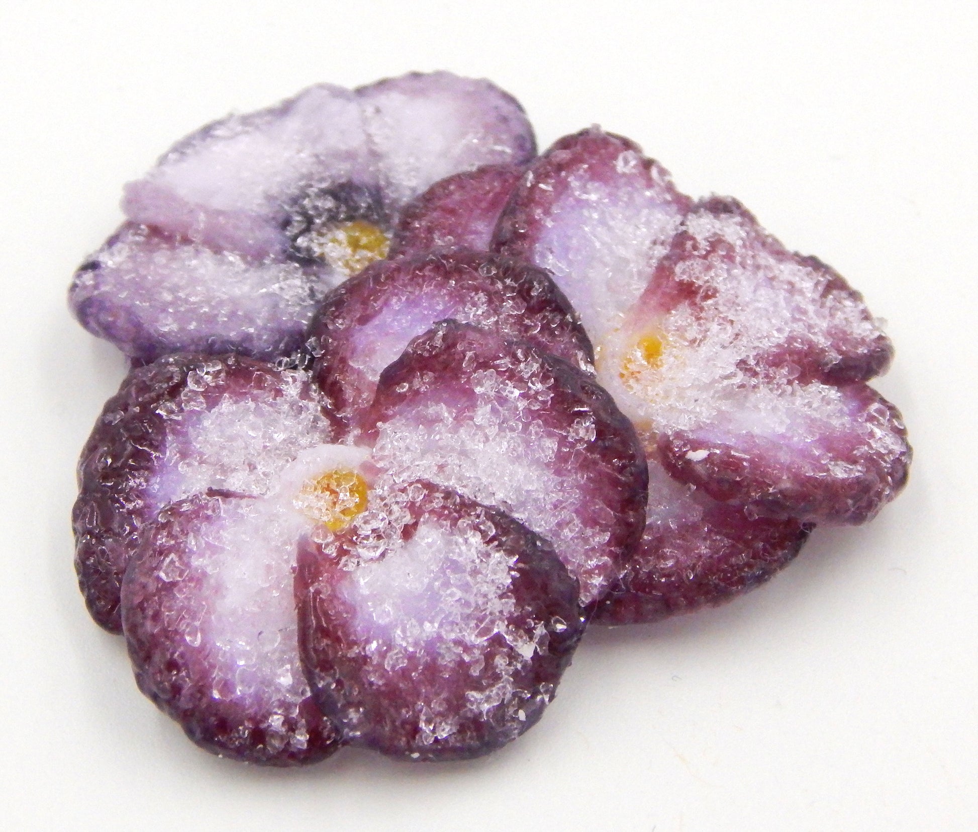 This collectible solid glass cluster of 3 crystallized sugared violets is created from finely ground colored glass powders using variations of the centuries old technique of pate de verre. Meticulous attention to detail has gone into the construction of each of our pieces to enhance its appeal and collectibility.