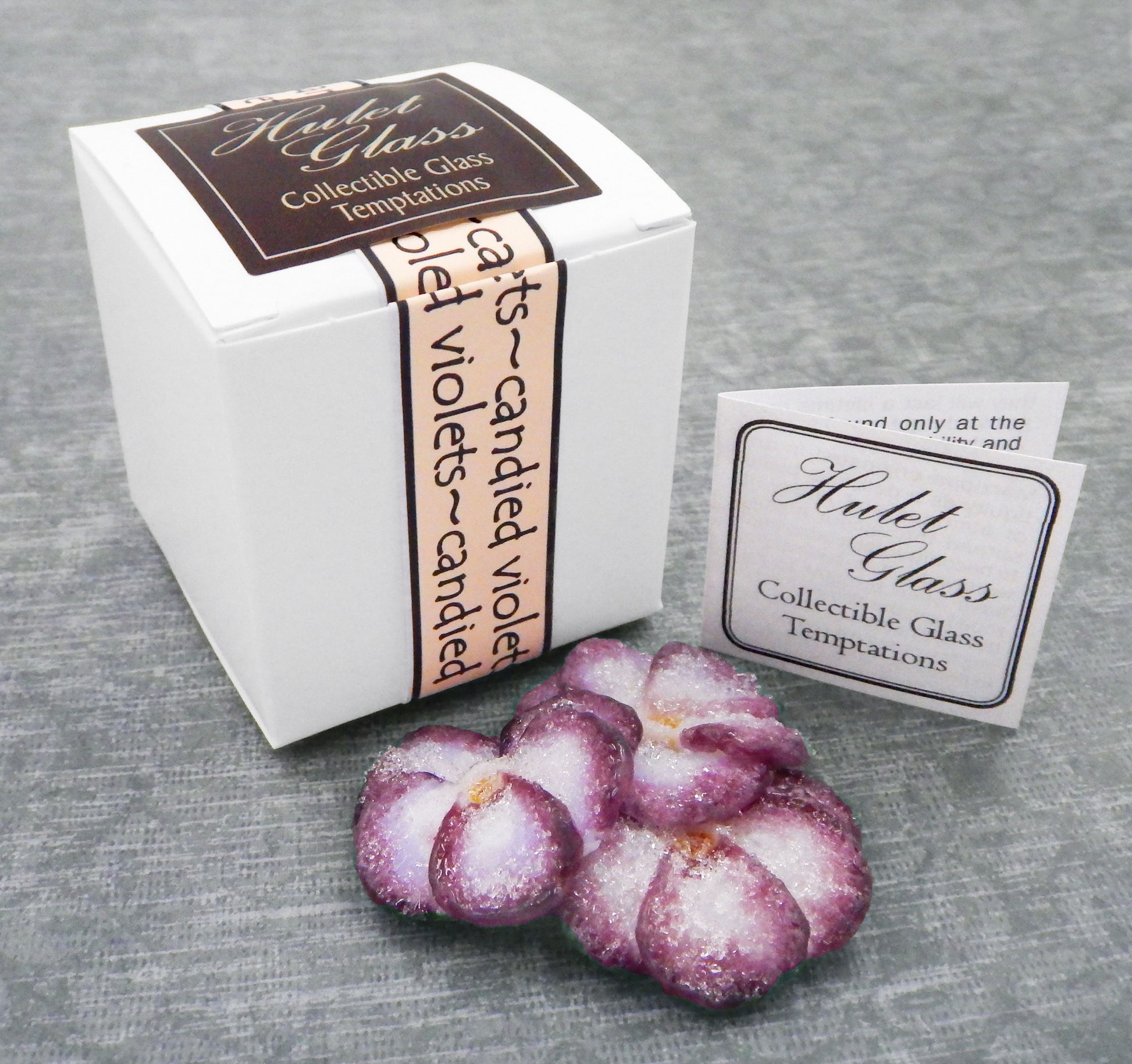 This glass cluster of sugared violets measures approx. 2" x 2" x .5" and sits in a fluted glassine paper candy cup. The bottom of the grouping is covered in felt to protect the surface it will sit upon. Each of our beautiful glass treats is signed (Hulet), dated and comes to you in a small gift box with an enclosure card telling a bit about the piece.