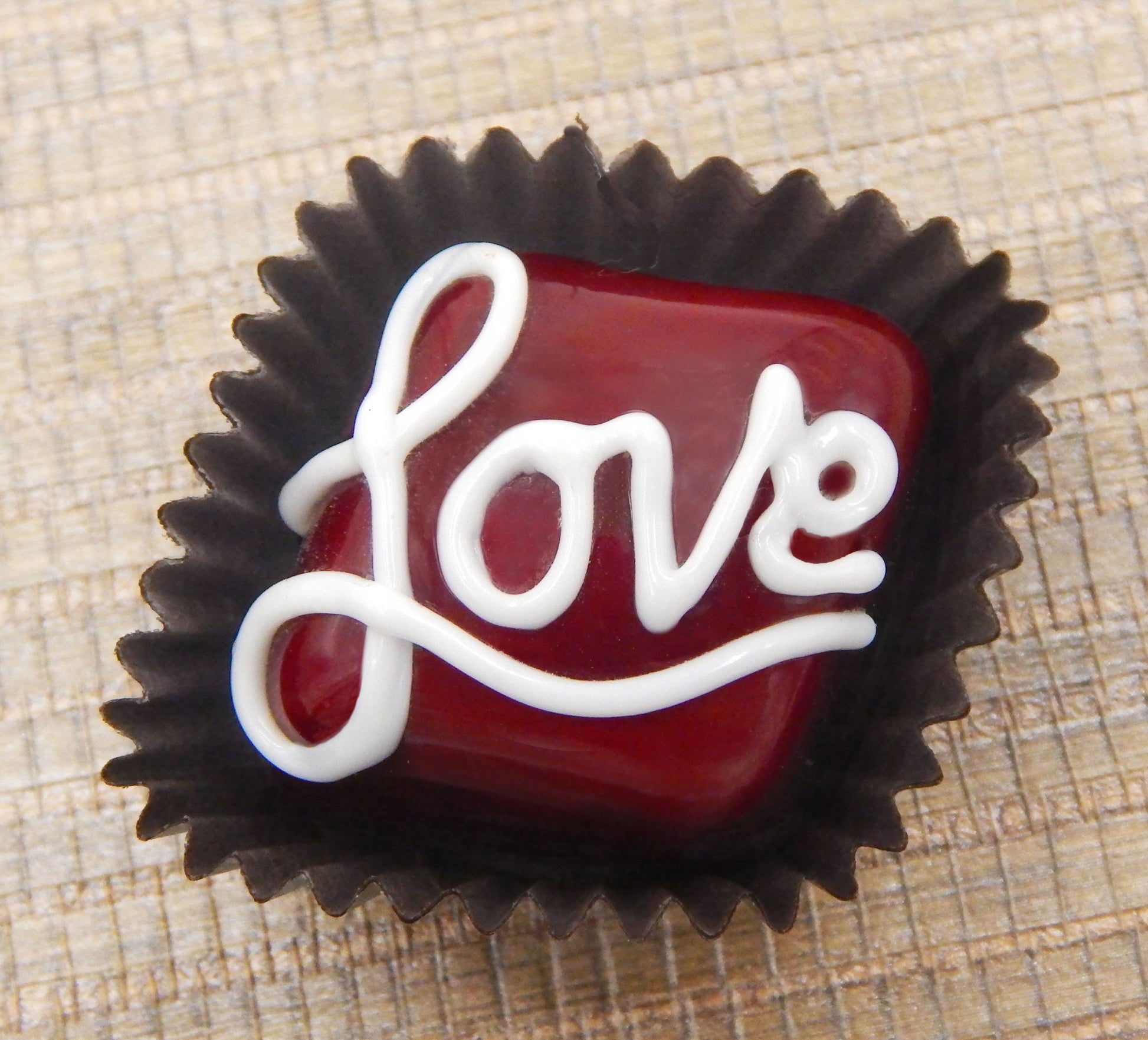 A handmade collectible solid glass cherry chocolate with a creamy white chocolate 'Love" design on top created from colorful glass utilizing ancient lampworking techniques. Meticulous attention to detail has gone into the construction of each of our pieces to enhance its appeal and collectibility.