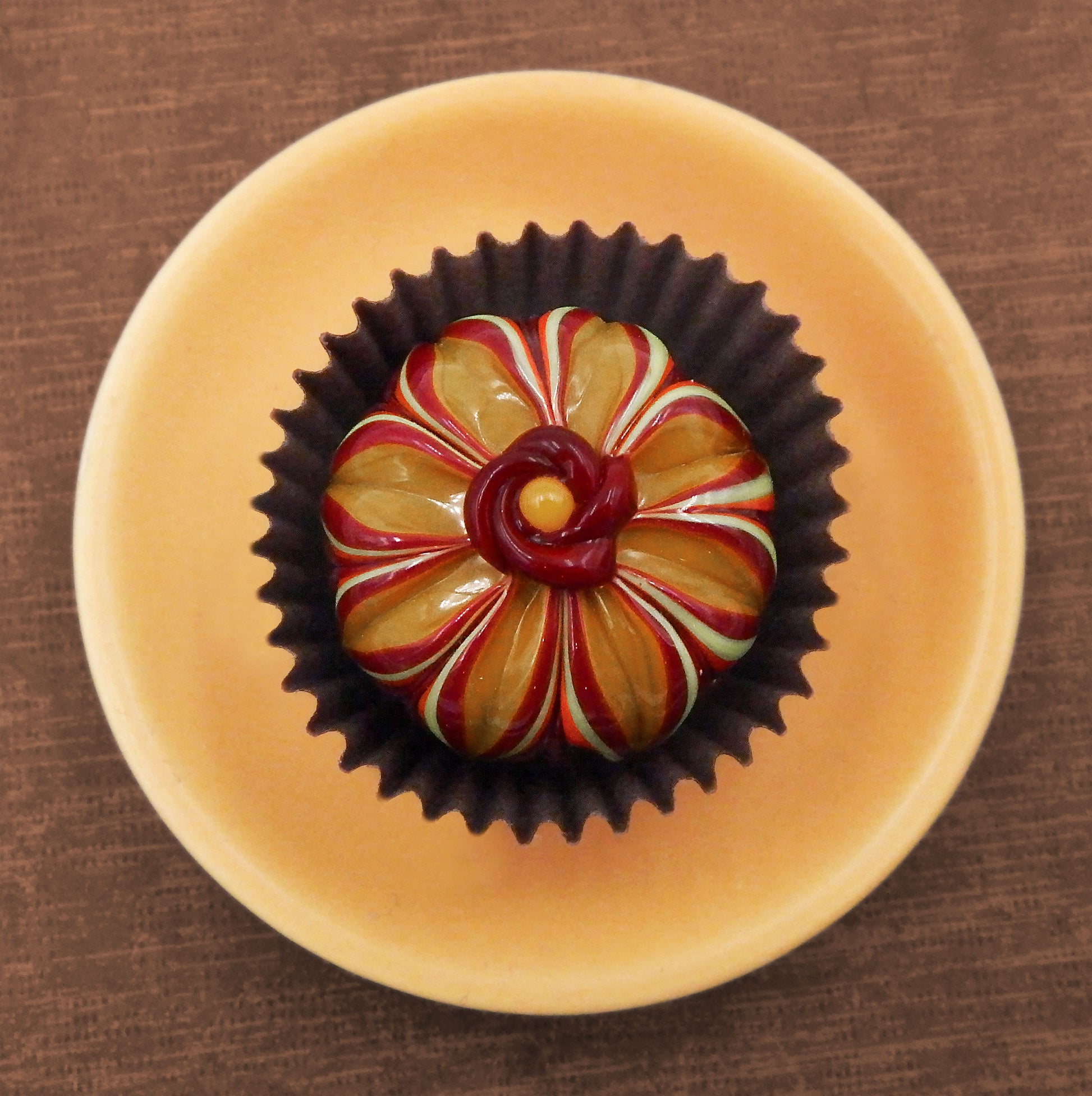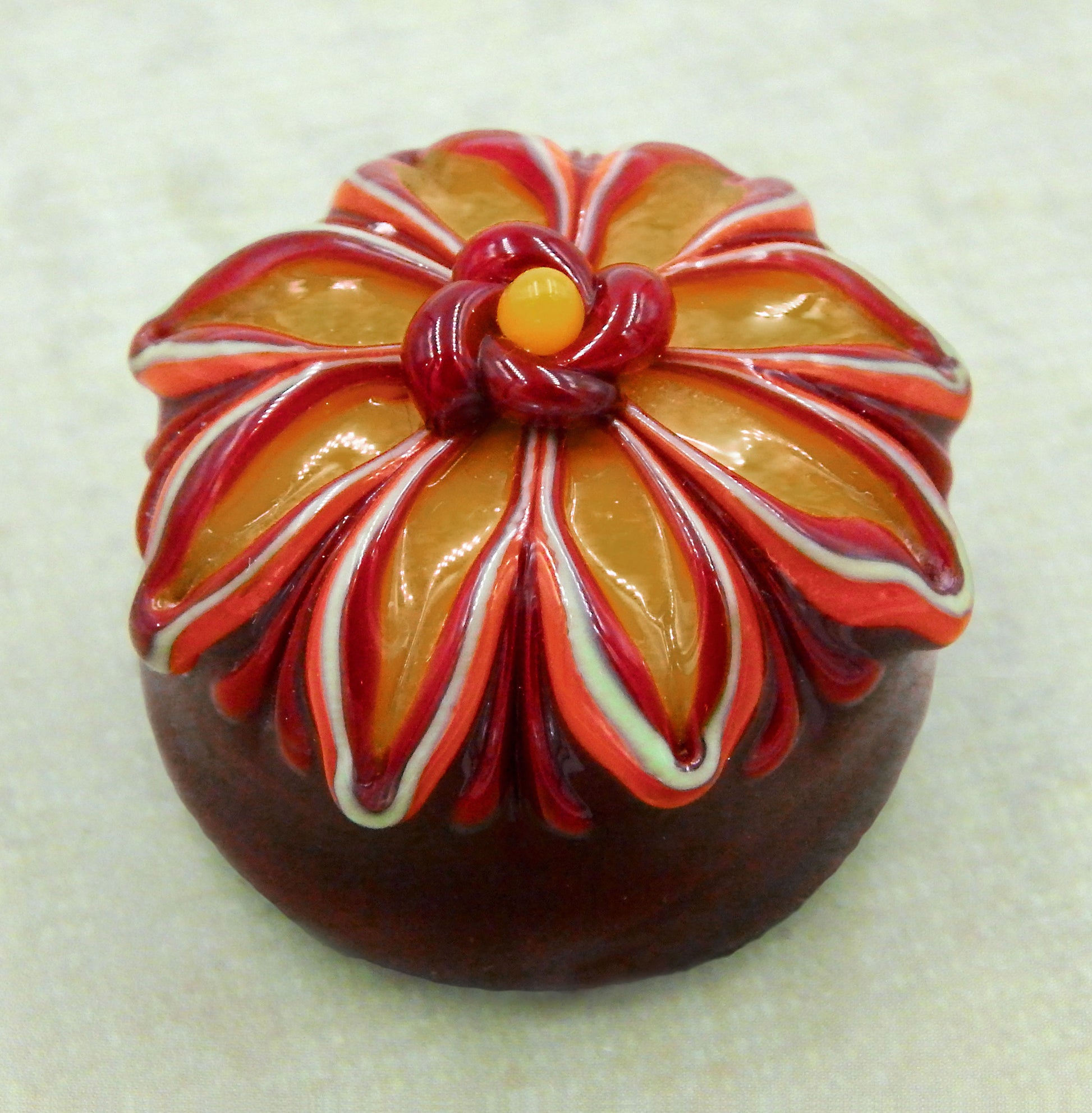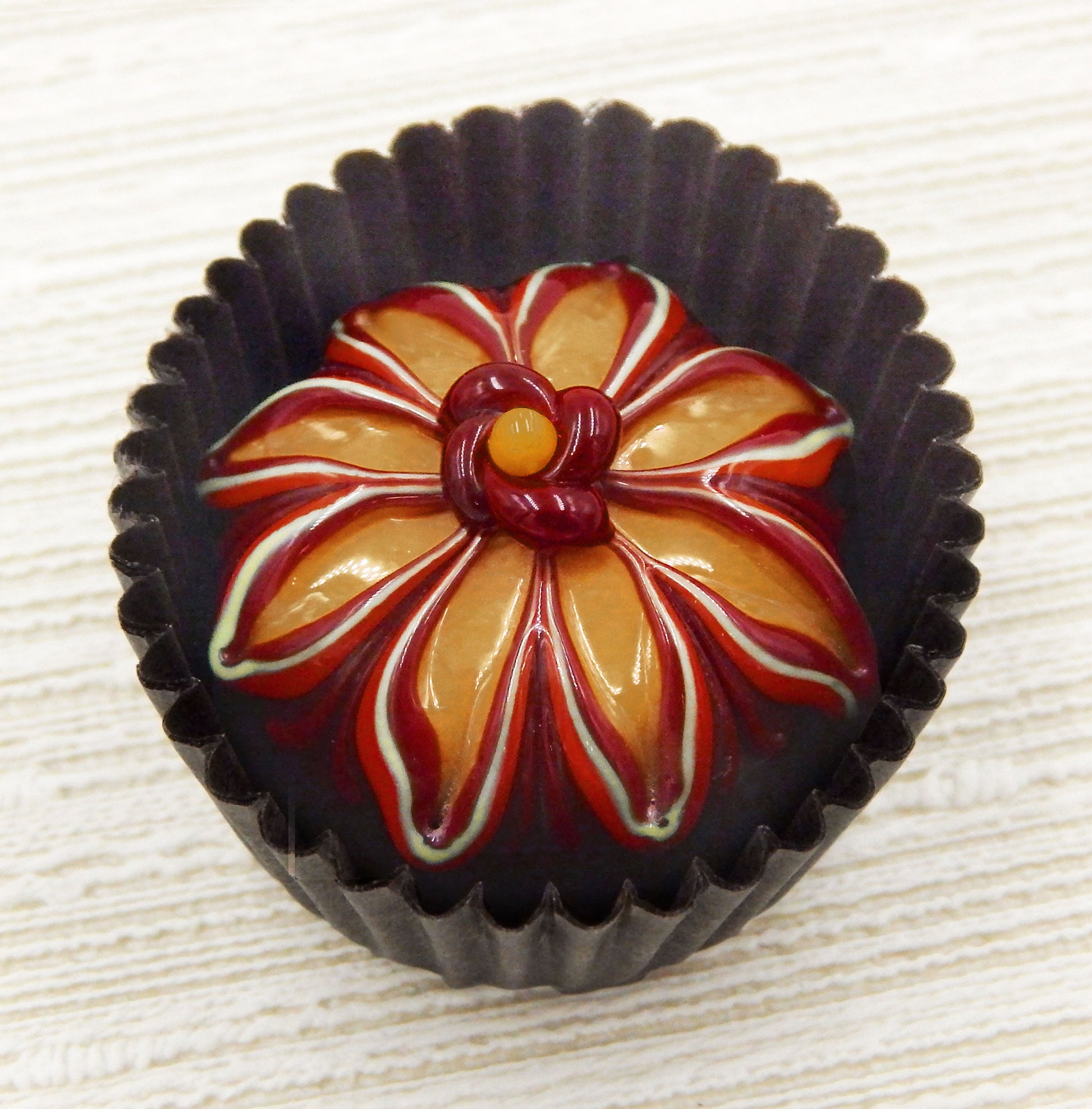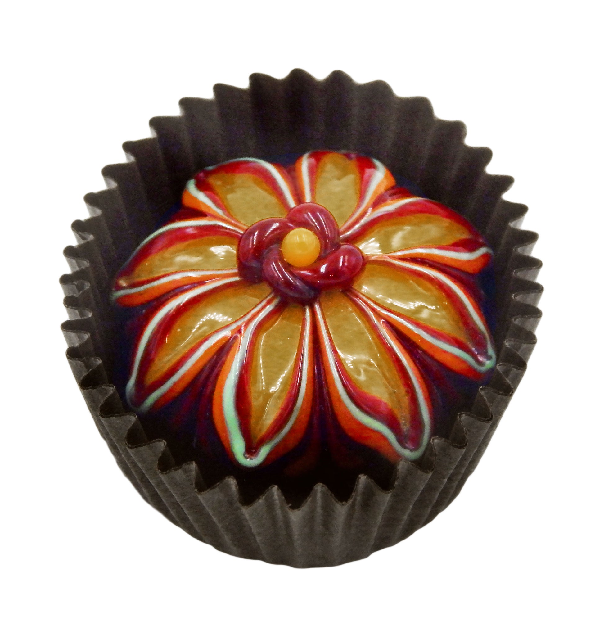 A handmade collectible solid glass chocolate treat with a floral aster design created from colorful glass utilizing flameworking techniques. Meticulous attention to detail has gone into the construction of each of our pieces to enhance its appeal and collectibility.