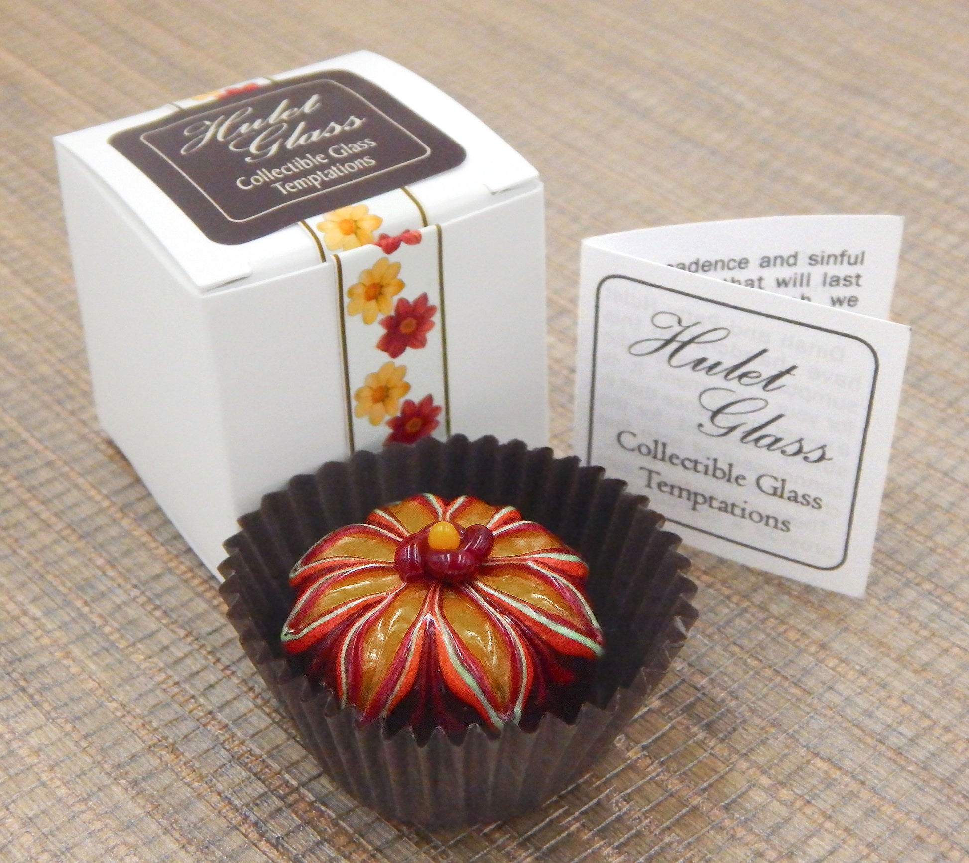 The glass chocolate measures approximately 1.25" x 1" (slightly larger than an actual chocolate candy) and sits in a fluted glassine paper candy cup. The bottom of the chocolate is covered in felt to protect the surface it will sit upon. Each beautiful glass chocolate is signed (Hulet), dated and comes to you in a colorful gift box with an enclosure card telling a bit about the piece.