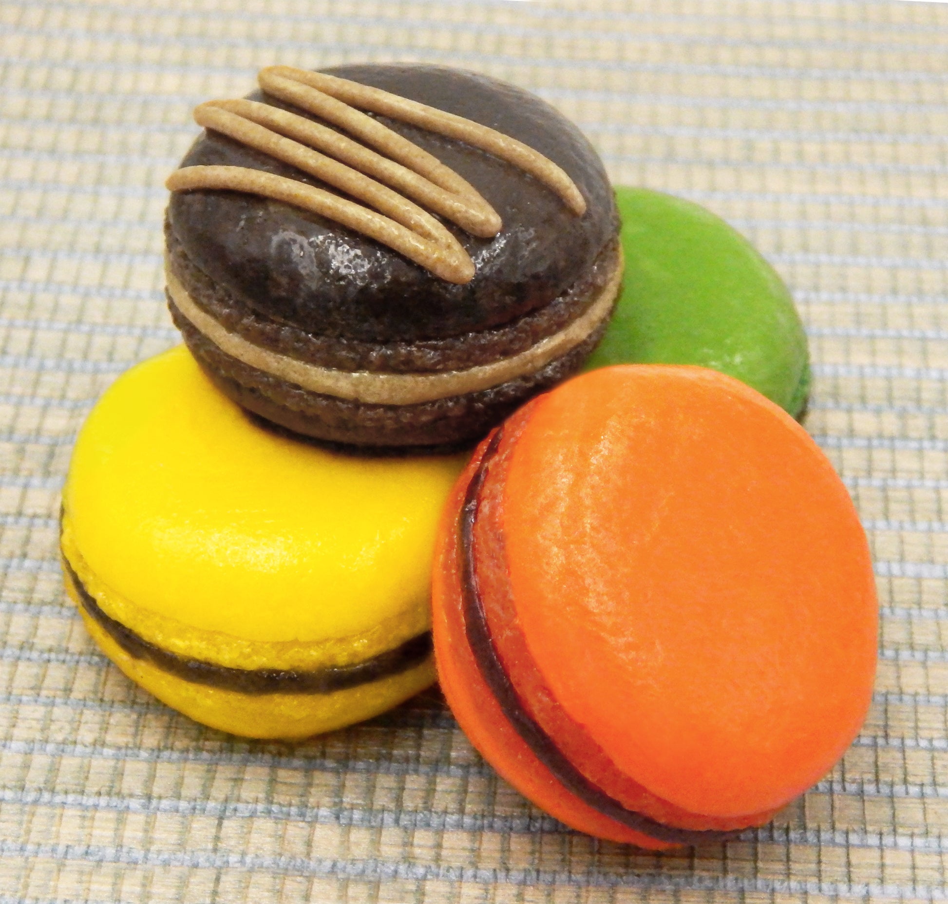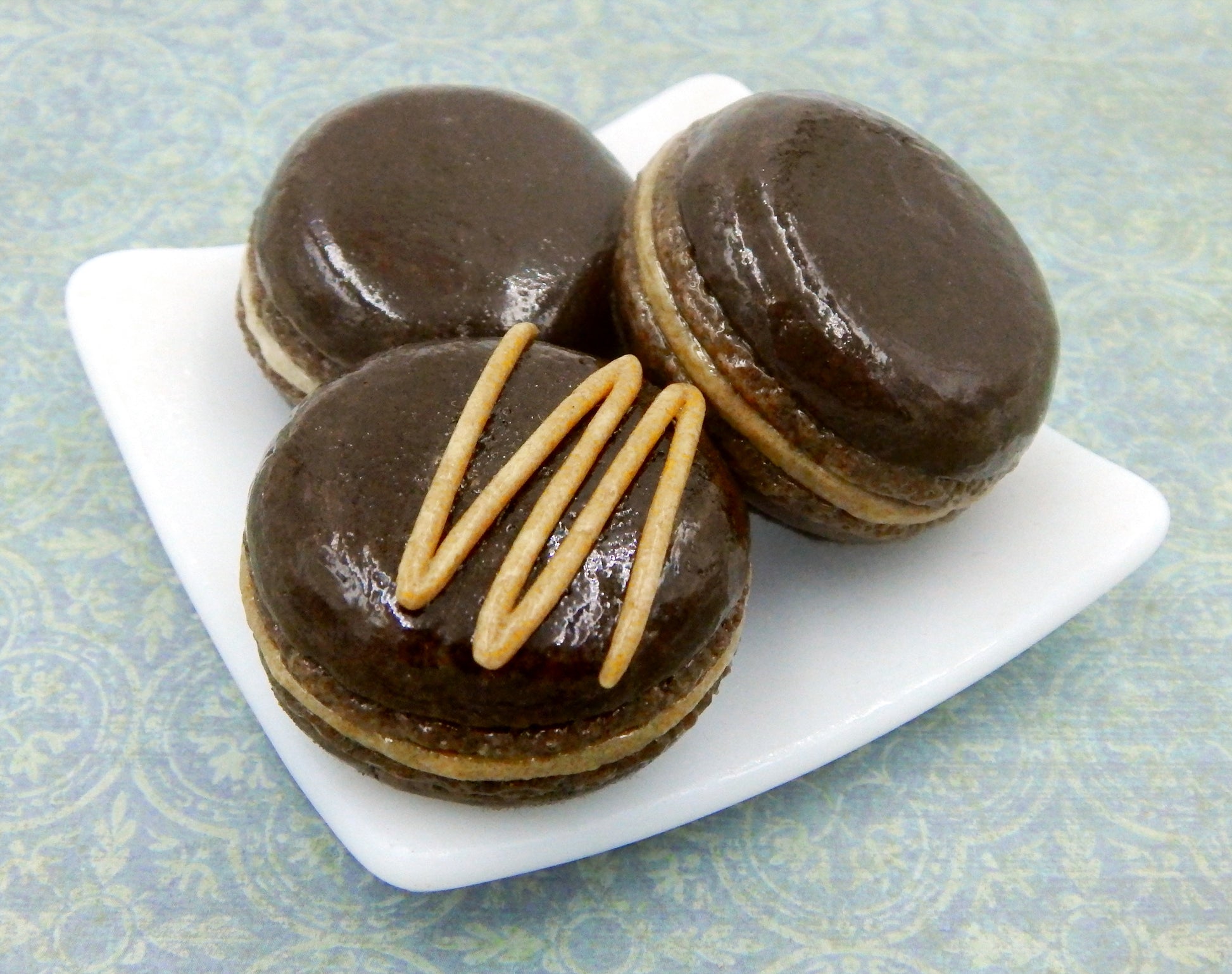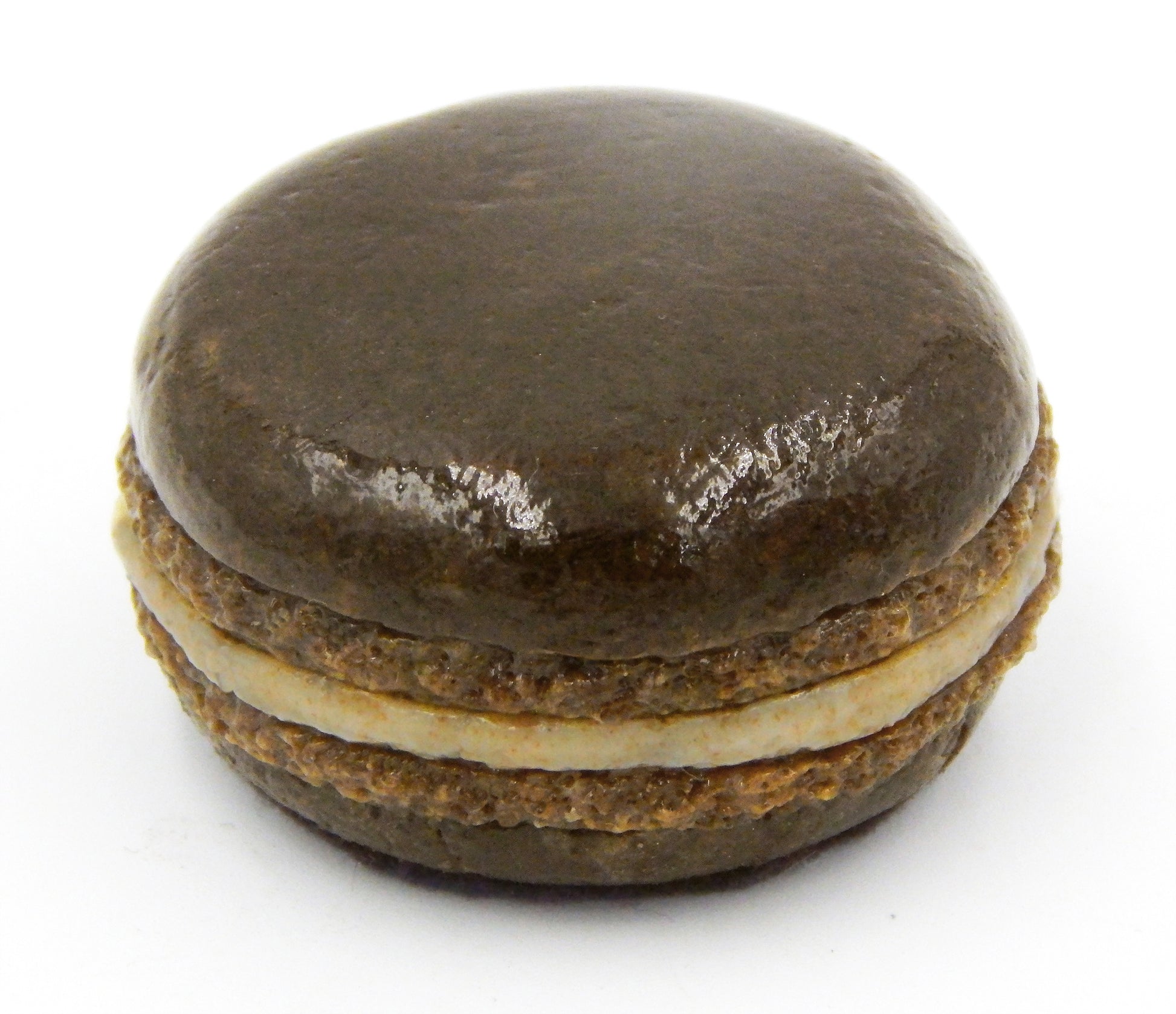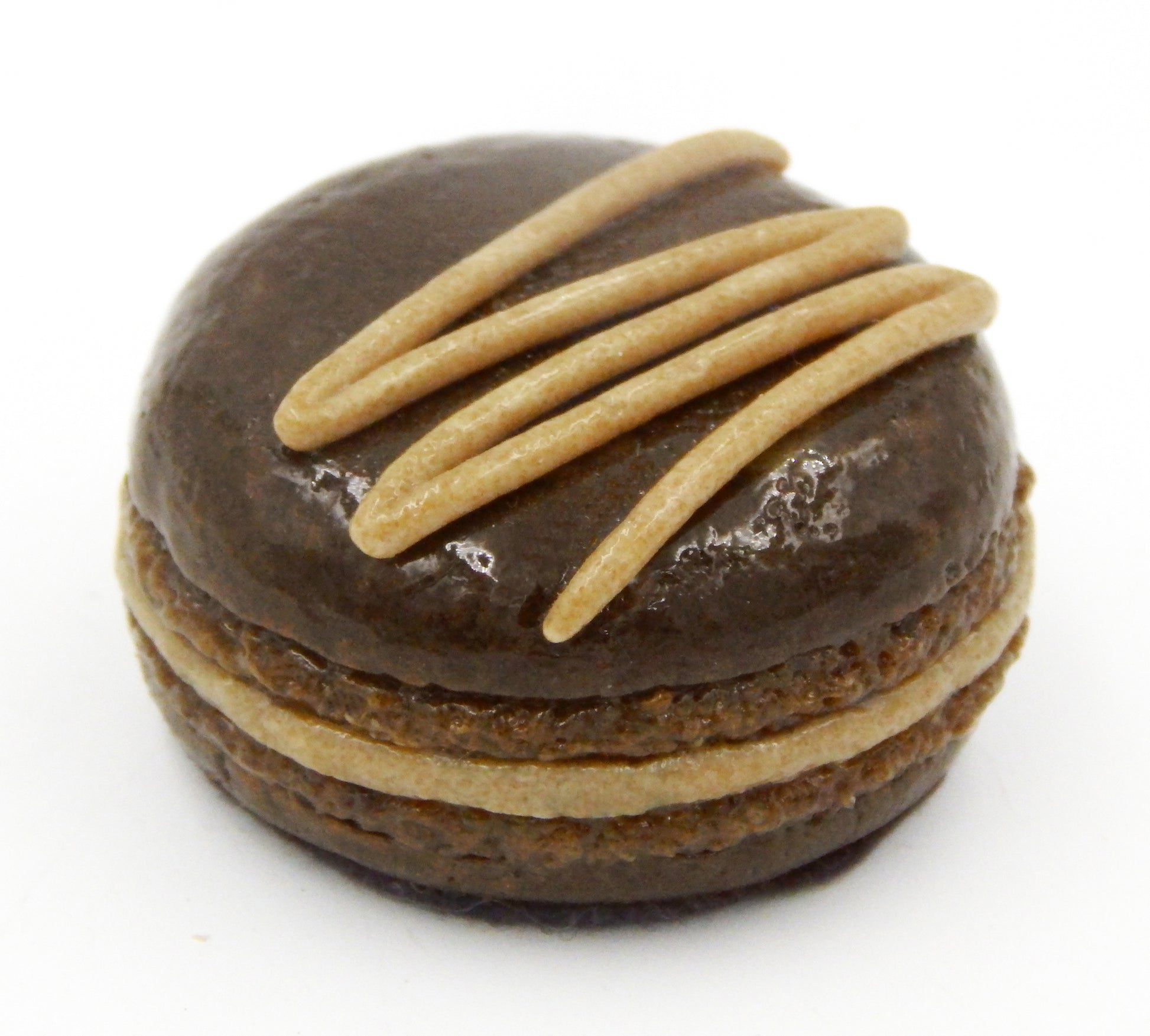 Collectible solid glass chocolate macarons with creamy peanut butter fillings are created from finely ground colored glass powders using variations of the centuries old technique of pate de verre. Meticulous attention to detail has gone into the construction of each of our pieces to enhance its appeal and collectibility. We offer these macarons either plain or with a drizzle of the peanut butter filling on top.