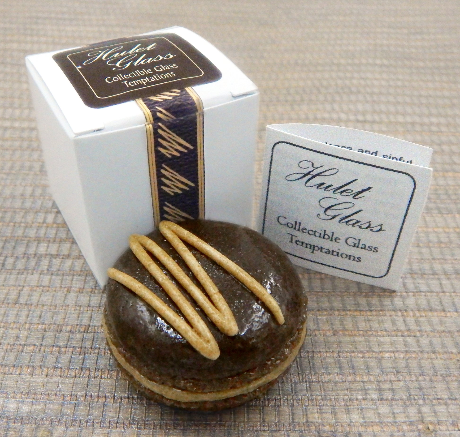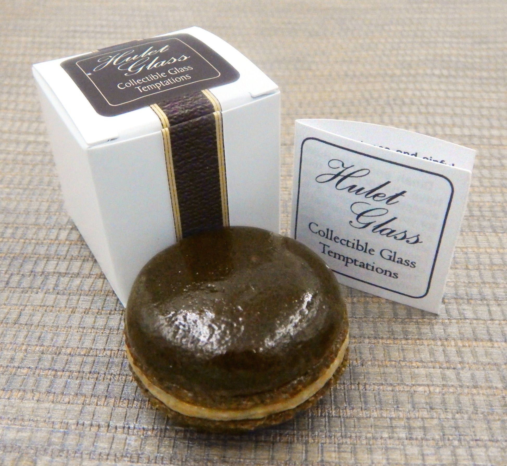 Each glass chocolate macaron measures approx. 1.75" diameter x 1" high. The bottom of the macaron is covered in felt to protect the surface it will sit upon. All of our beautiful glass treats are signed (Hulet), dated and come to you in a small gift box with an enclosure card telling a bit about the piece.