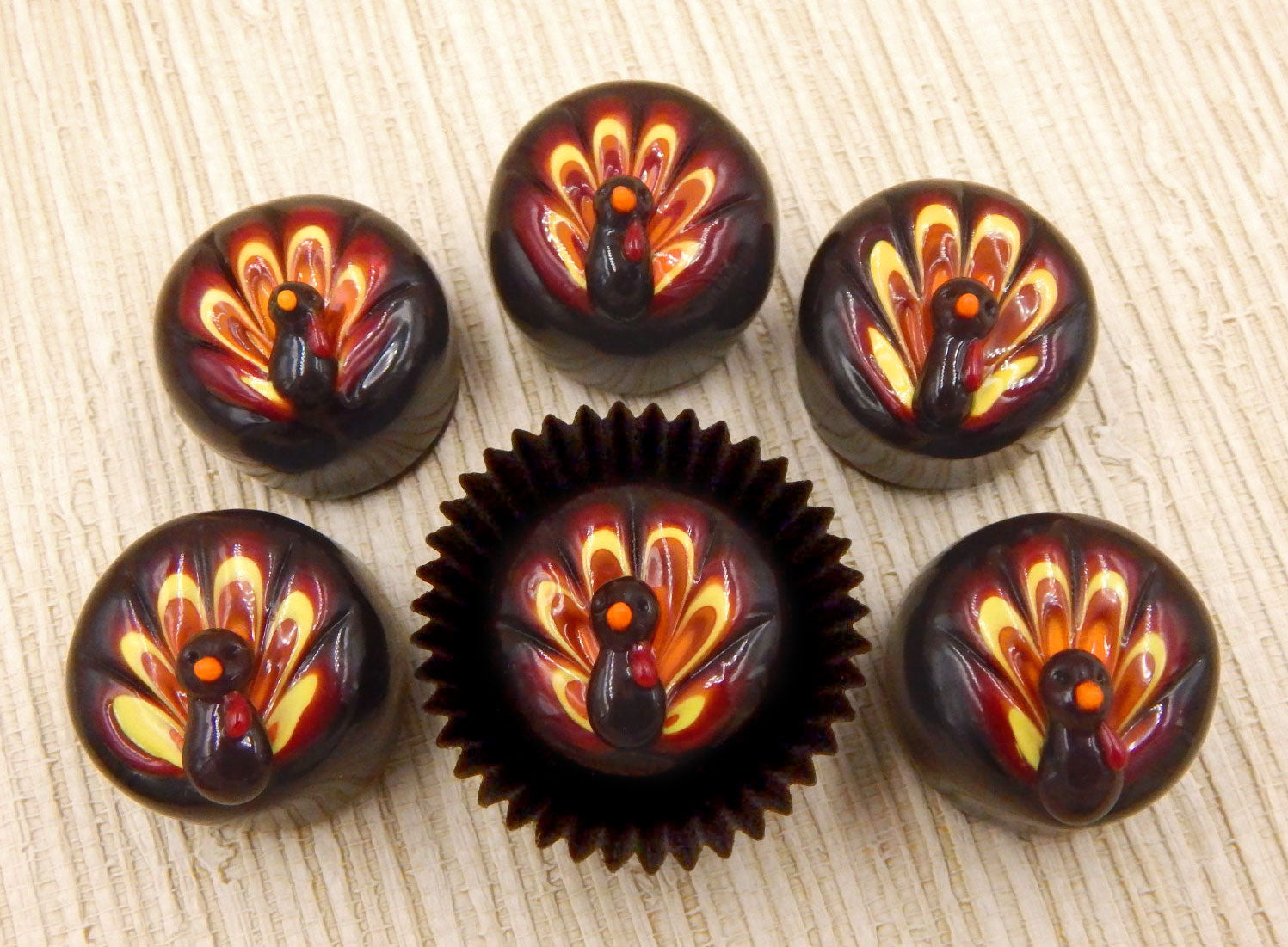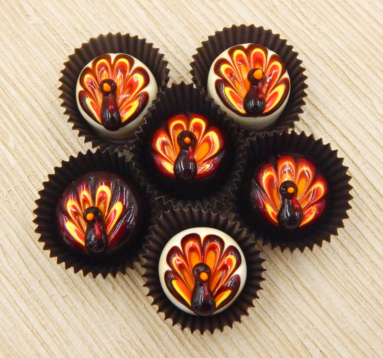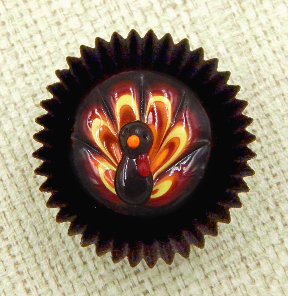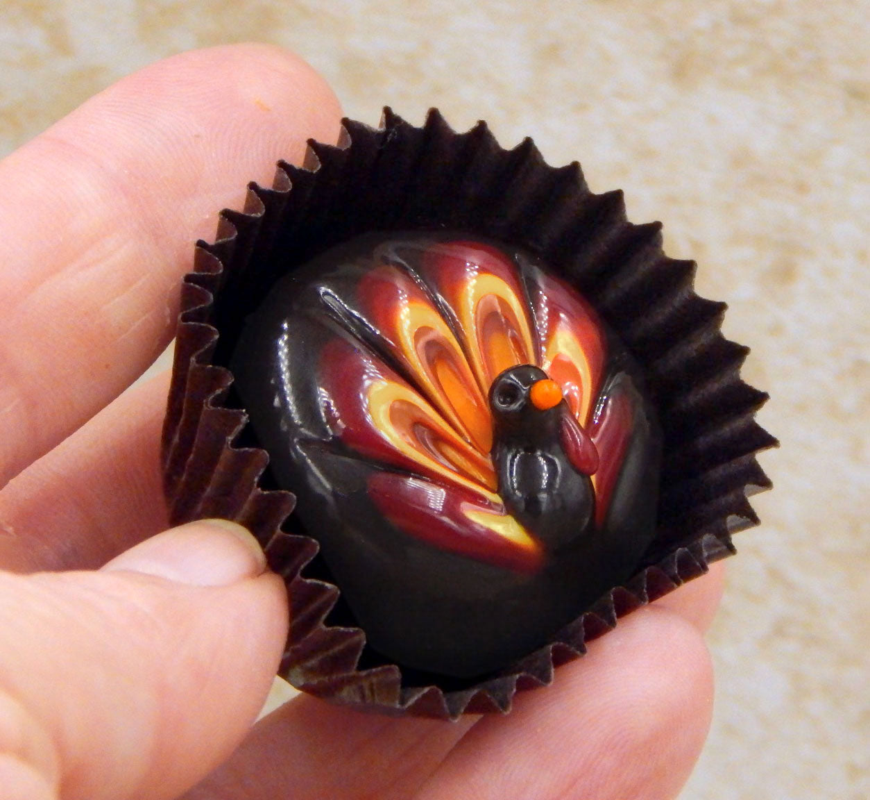A handmade collectible solid glass chocolate with a glorious turkey on top created from colorful glass utilizing ancient pate de verre and lampworking techniques. Meticulous attention to detail has gone into the construction of each of our pieces to enhance its appeal and collectibility.