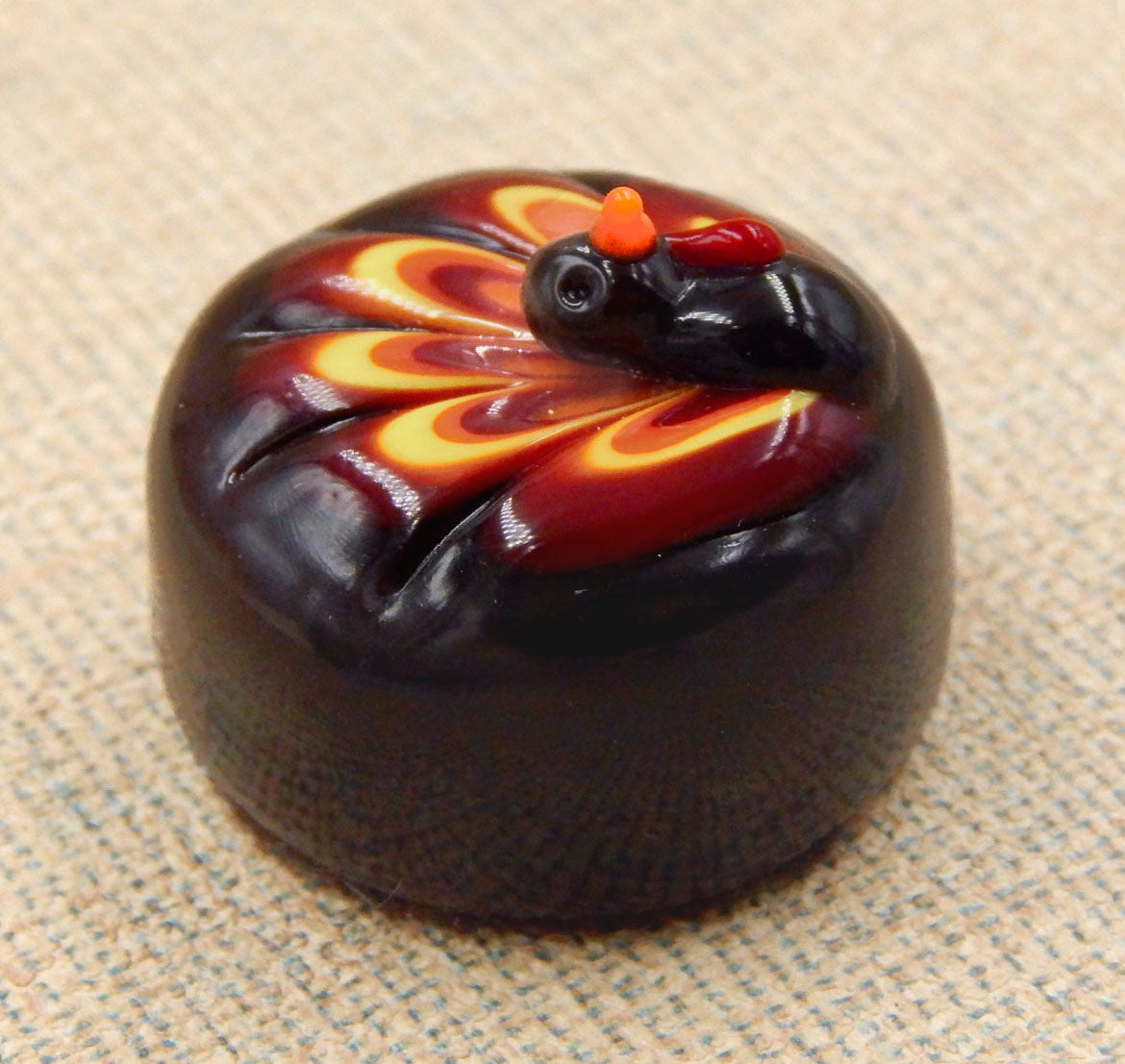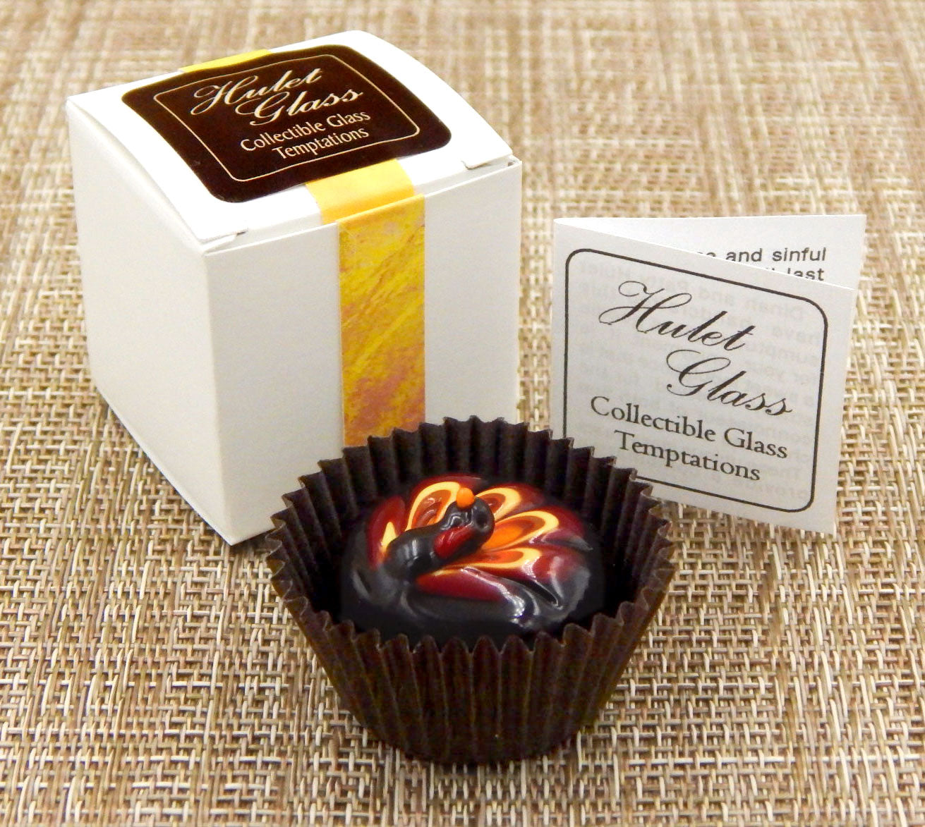 The glass chocolate measures 1.25" diameter x 1" high (slightly larger than an actual chocolate candy) and sits in a fluted glassine paper candy cup. The bottom of the chocolate is covered in felt to protect the surface it will sit upon. Each beautiful glass chocolate is signed (Hulet), dated and comes to you in a colorful gift box with an enclosure card telling a bit about the piece.