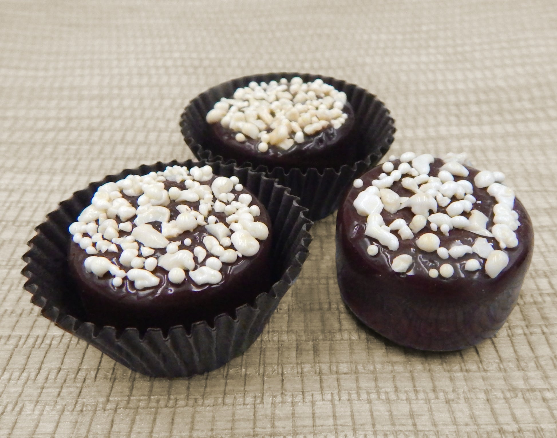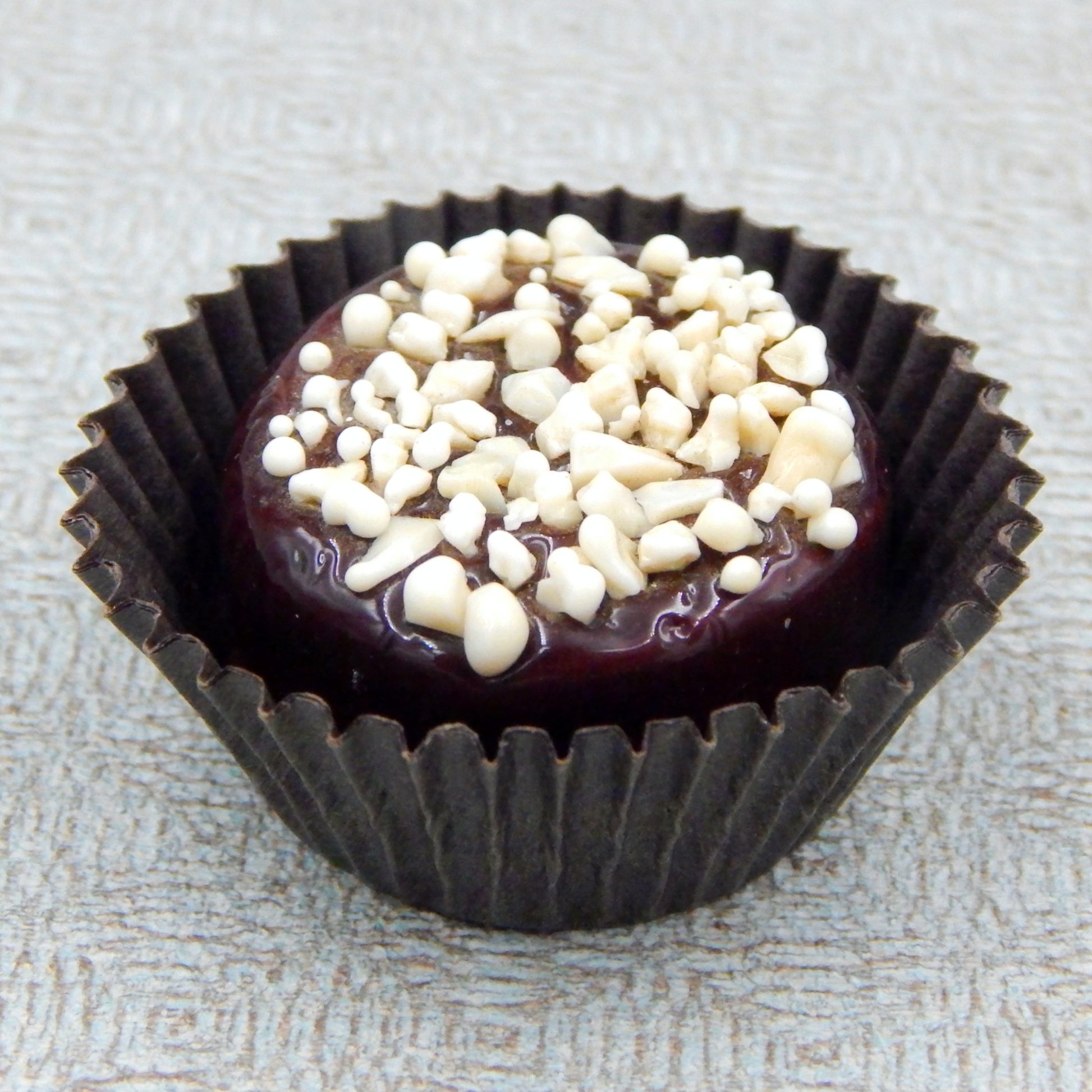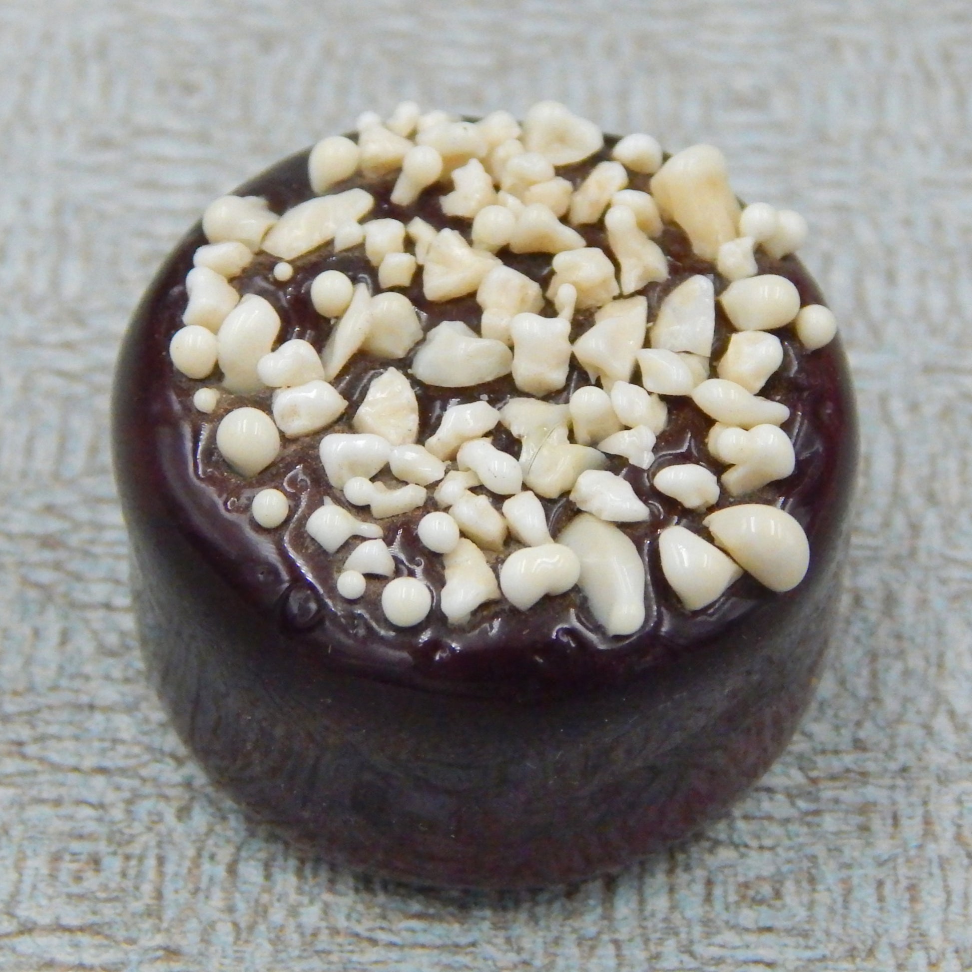 A handmade collectible solid glass chocolate with a sprinkle of nuts on top created from colorful glass utilizing flameworking techniques. Meticulous attention to detail has gone into the construction of each of our pieces to enhance its appeal and collectibility.