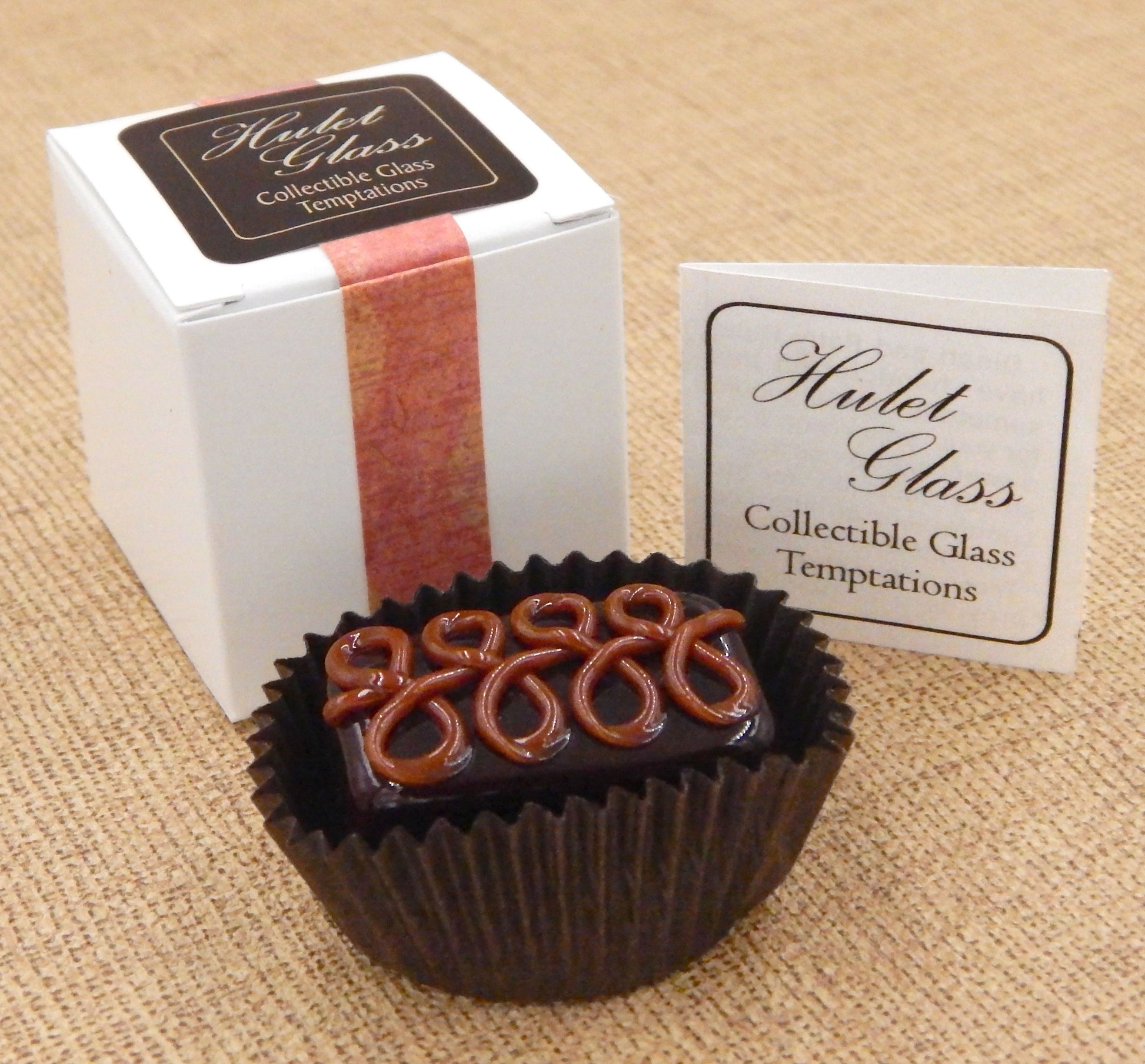 The glass chocolate measures 1.25" x 1" (slightly larger than an actual chocolate candy) and sits in a fluted glassine paper candy cup. The bottom of the chocolate is covered in felt to protect the surface it will sit upon. Each beautiful glass chocolate is signed (Hulet), dated and comes to you in a colorful gift box with an enclosure card telling a bit about the piece.