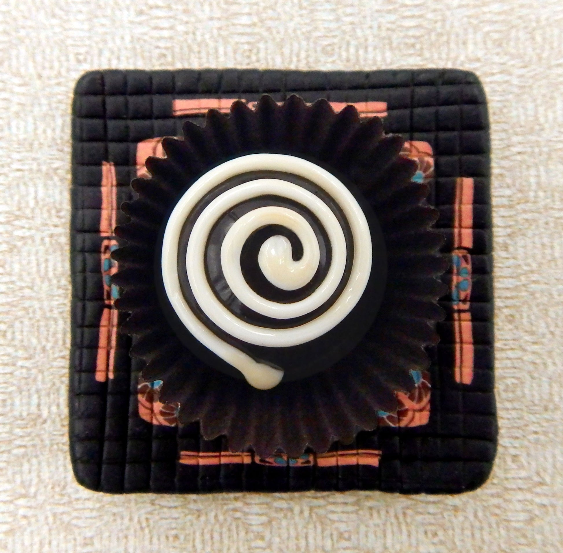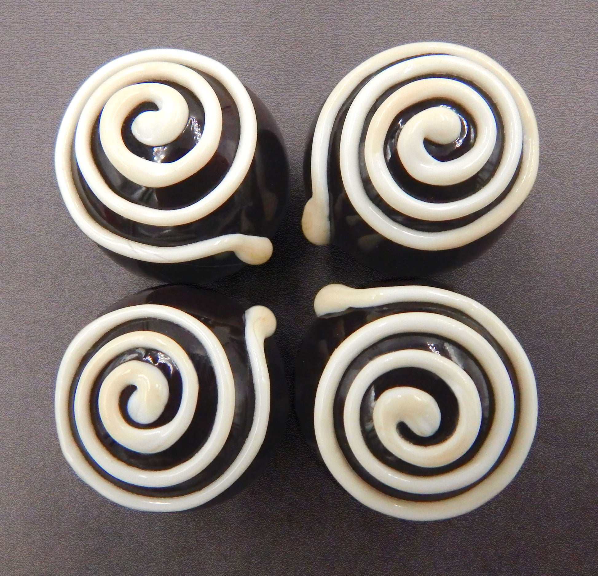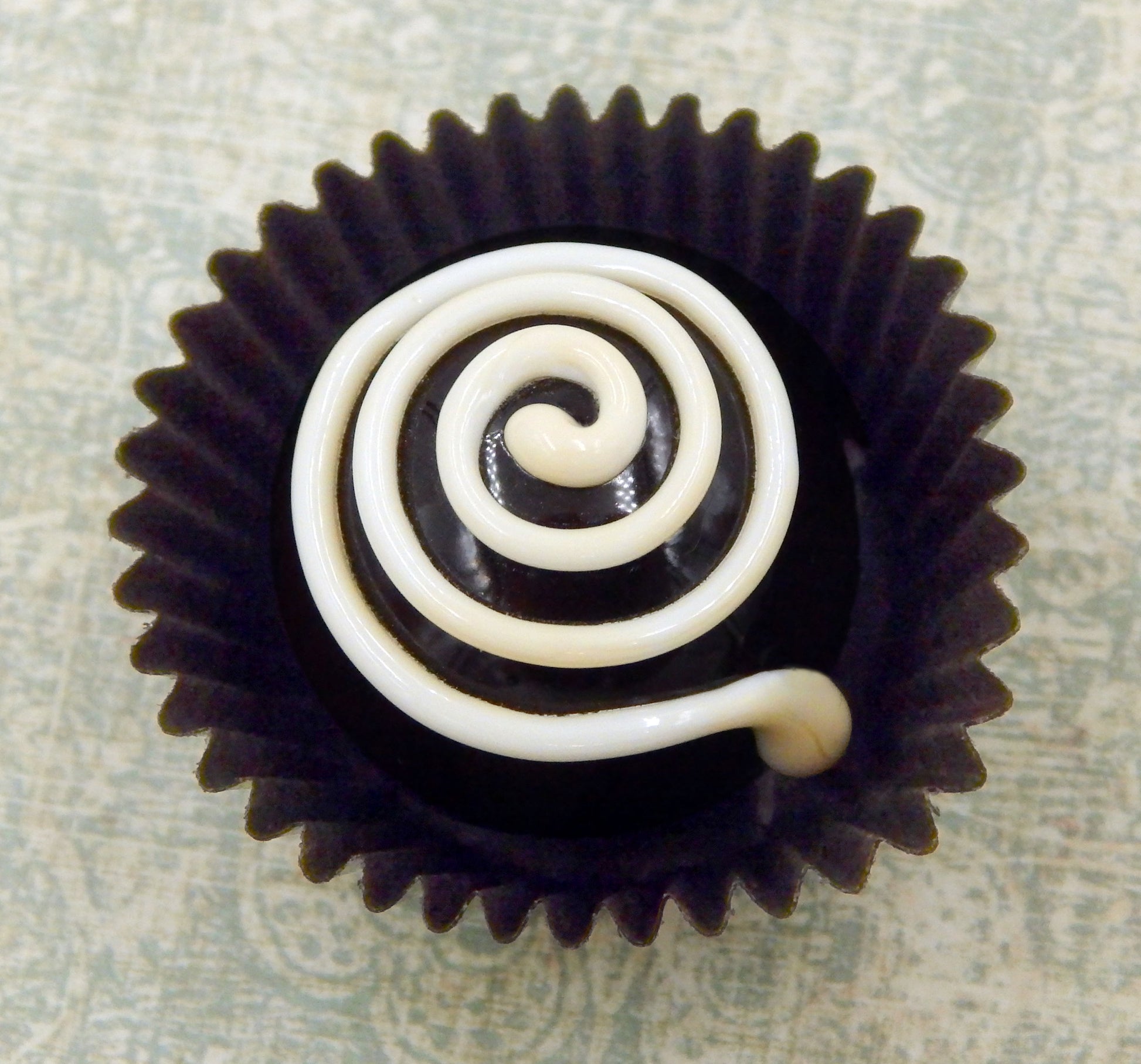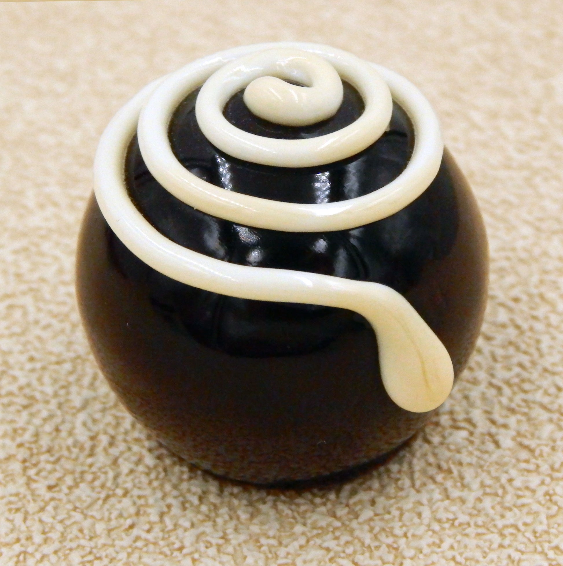 A handmade collectible solid glass chocolate with a creamy vanilla spiral on a dark chocolate ball created from colorful glass utilizing flameworking techniques. Meticulous attention to detail has gone into the construction of each of our pieces to enhance its appeal and collectibility.