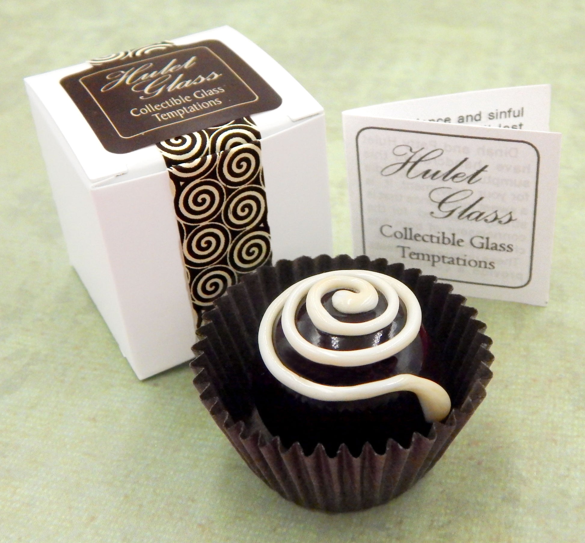 The glass chocolate measures 1.25" x 1.25" (slightly larger than an actual chocolate candy) and sits in a fluted glassine paper candy cup. The bottom of the chocolate is covered in felt to protect the surface it will sit upon. Each beautiful glass chocolate is signed (Hulet), dated and comes to you in a colorful gift box with an enclosure card telling a bit about the piece.