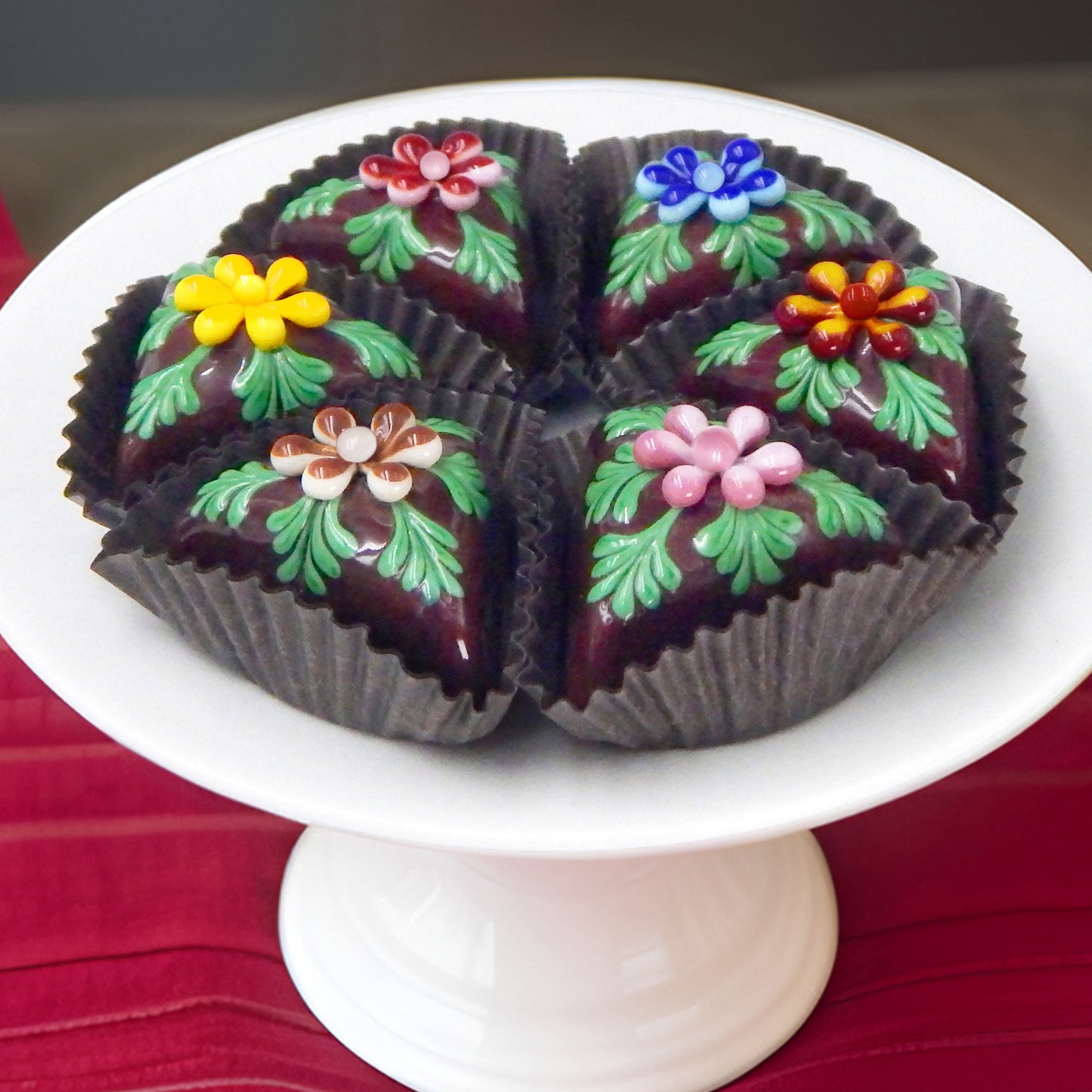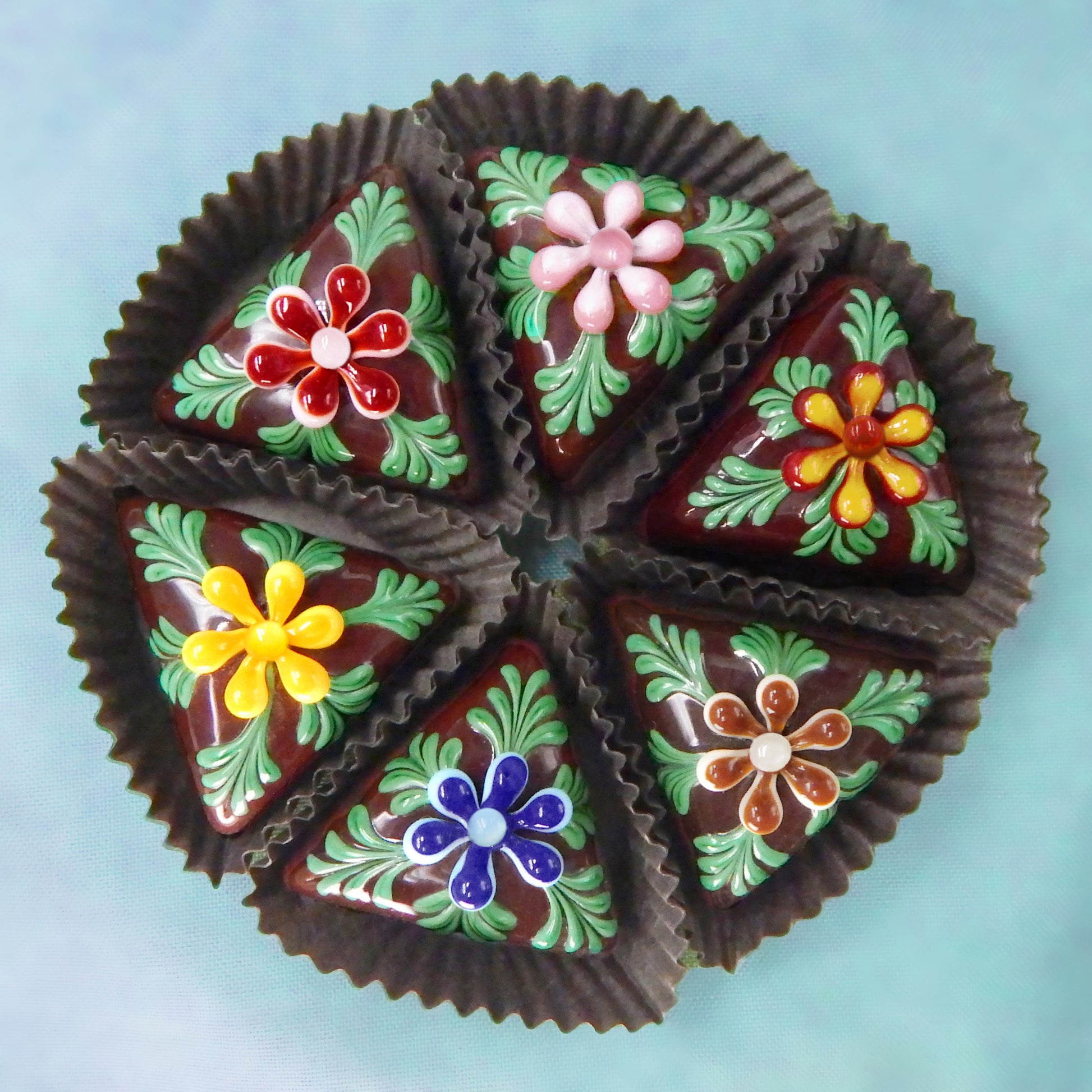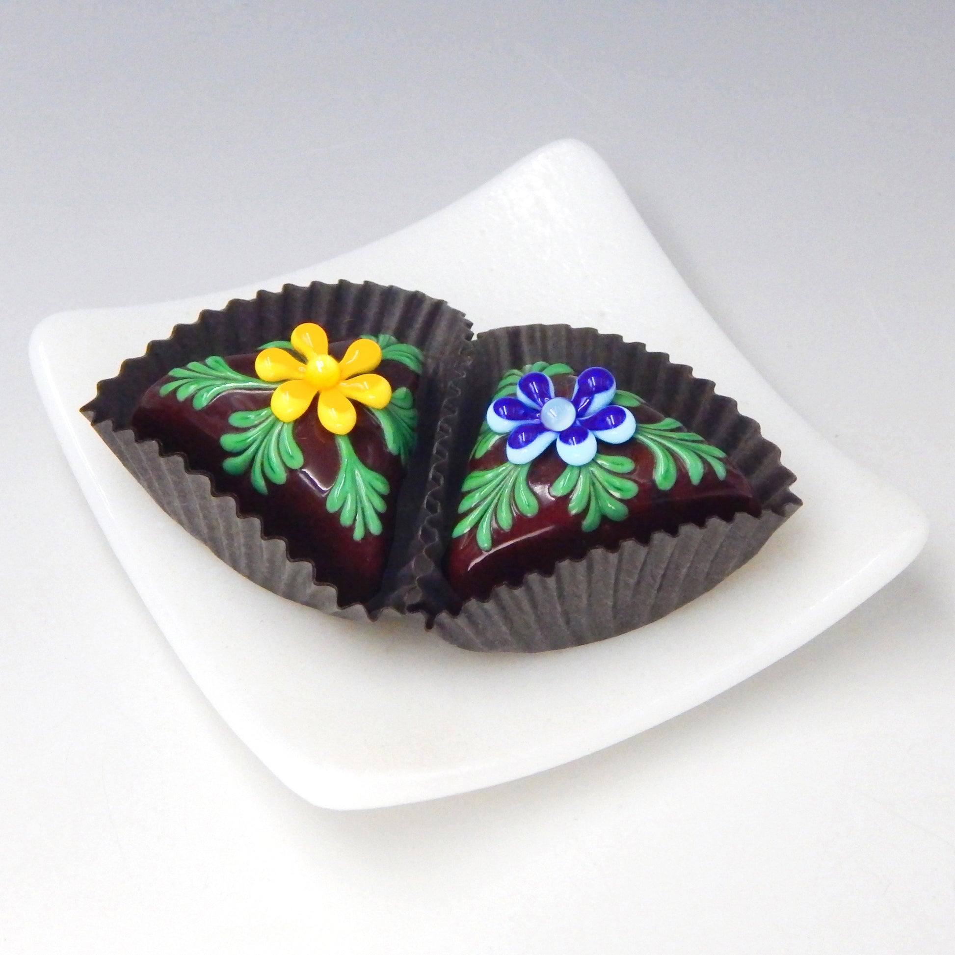 Handmade collectible solid glass chocolates with colorful flower designs on top created from colorful glass utilizing flameworking techniques. Meticulous attention to detail has gone into the construction of each of our pieces to enhance its appeal and collectibility.