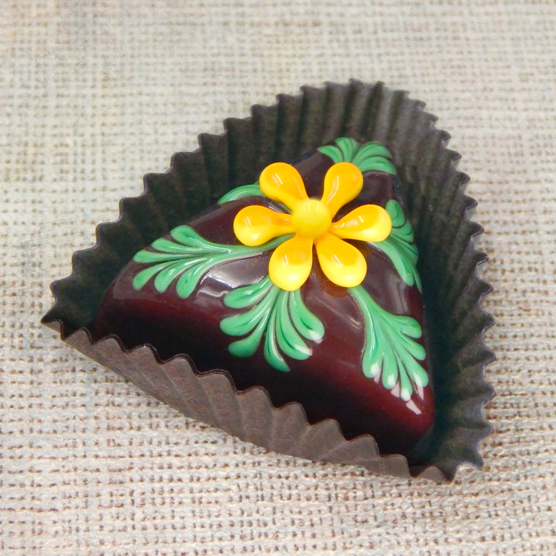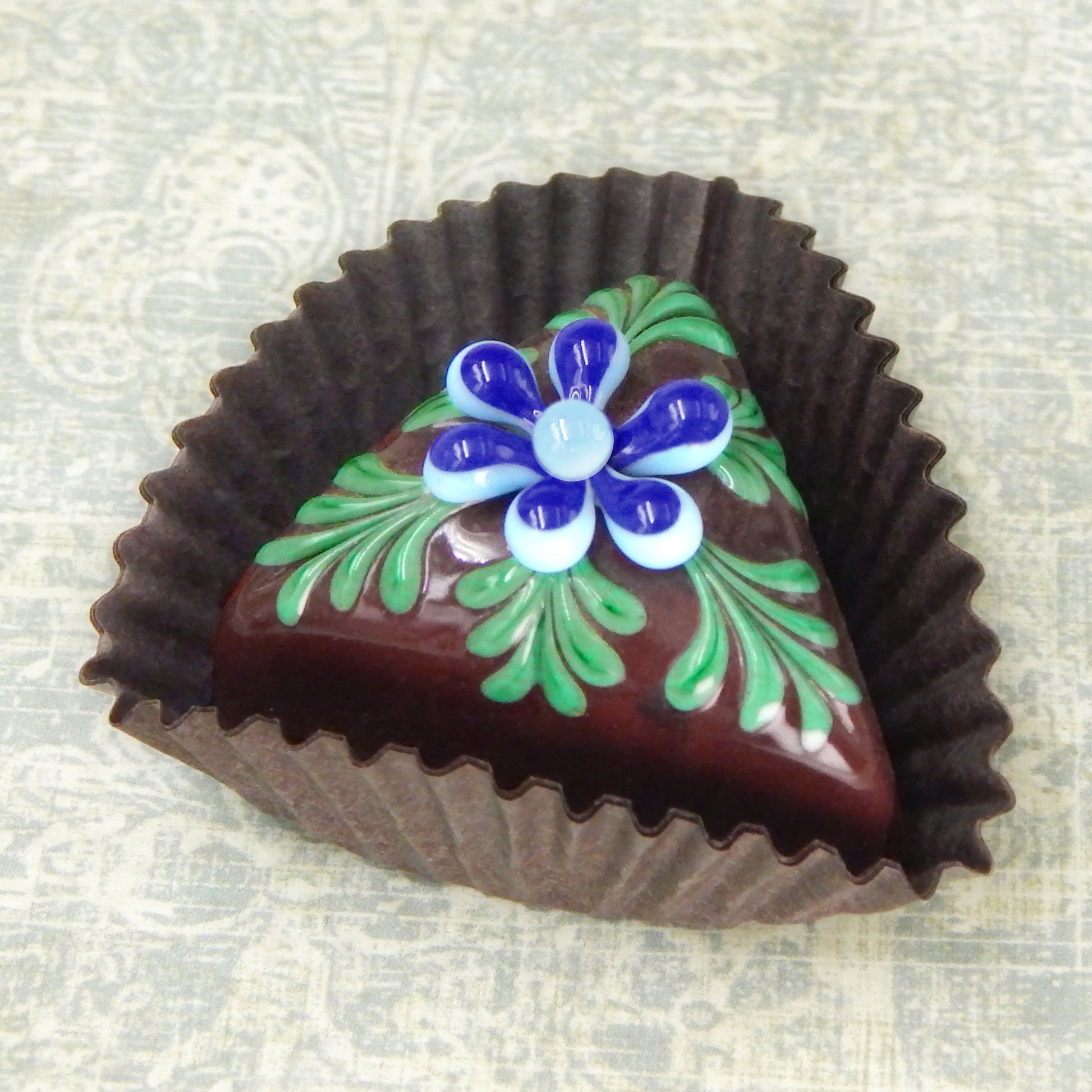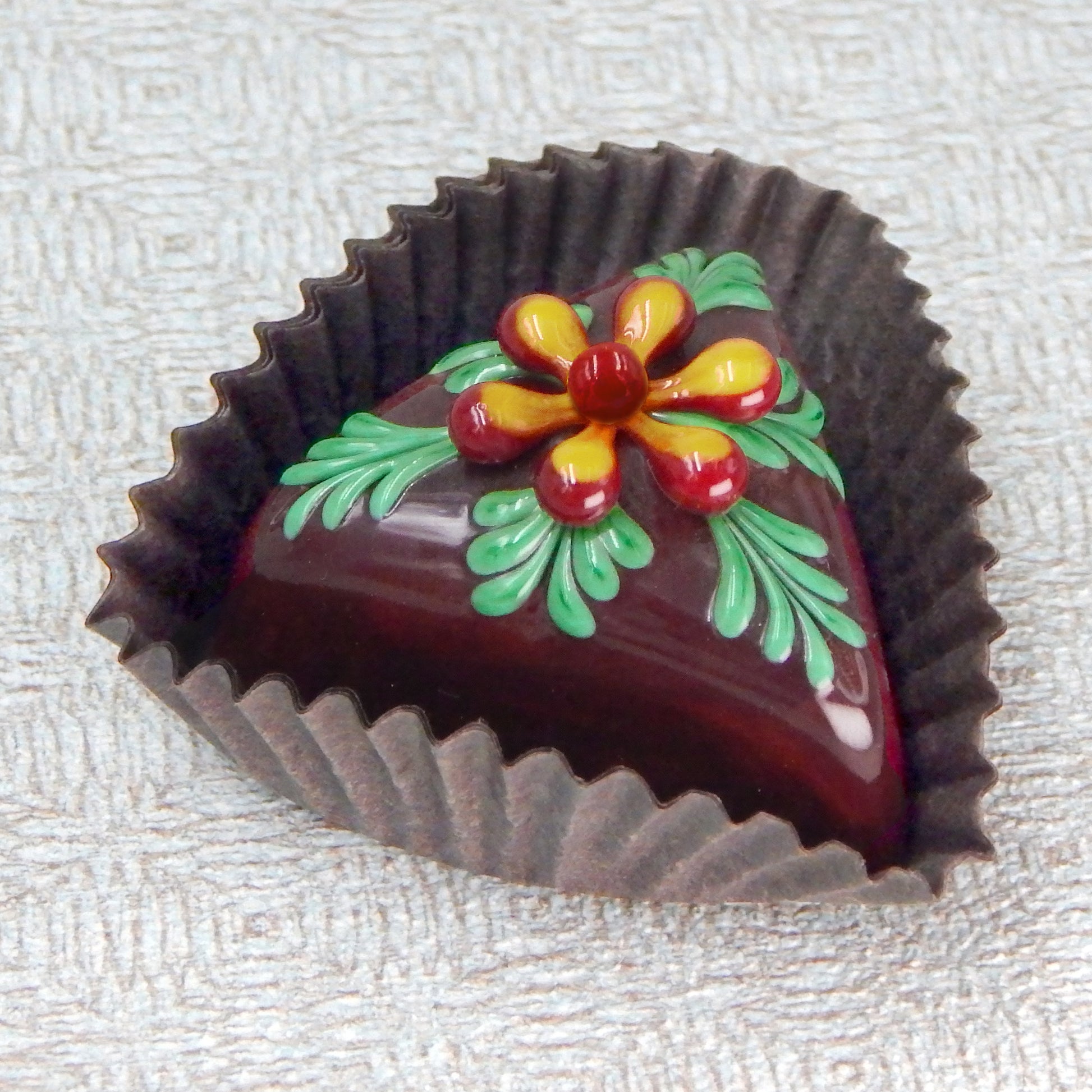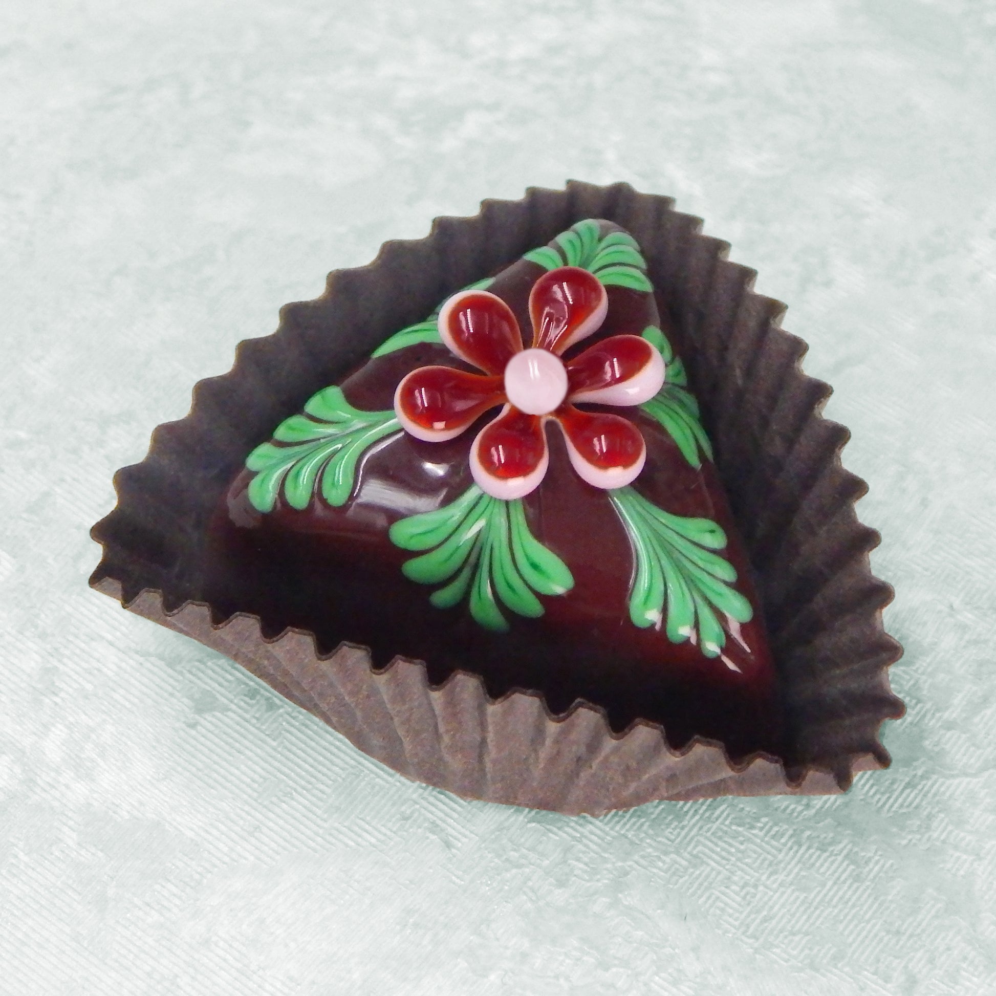 Handmade collectible solid glass chocolates with colorful flower designs on top created from colorful glass utilizing flameworking techniques. Meticulous attention to detail has gone into the construction of each of our pieces to enhance its appeal and collectibility.