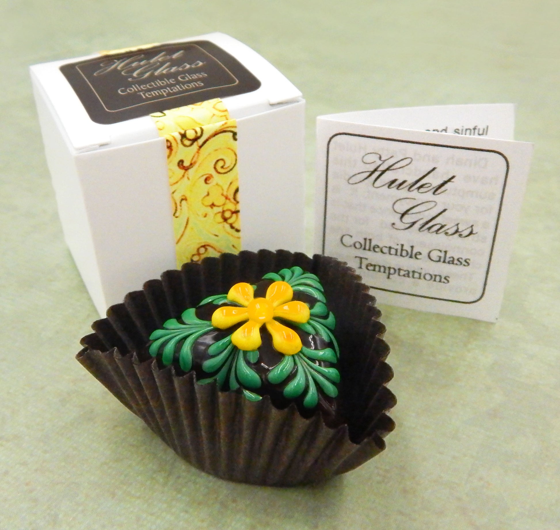 Each of these glass chocolates measures approximately 1.5" x 1" (slightly larger than an actual chocolate candy) and sits in a fluted glassine paper candy cup. The bottom of the chocolate is covered in felt to protect the surface it will sit upon. Each beautiful glass chocolate is signed (Hulet), dated and comes to you in a small gift box with an enclosure card telling a bit about the piece.