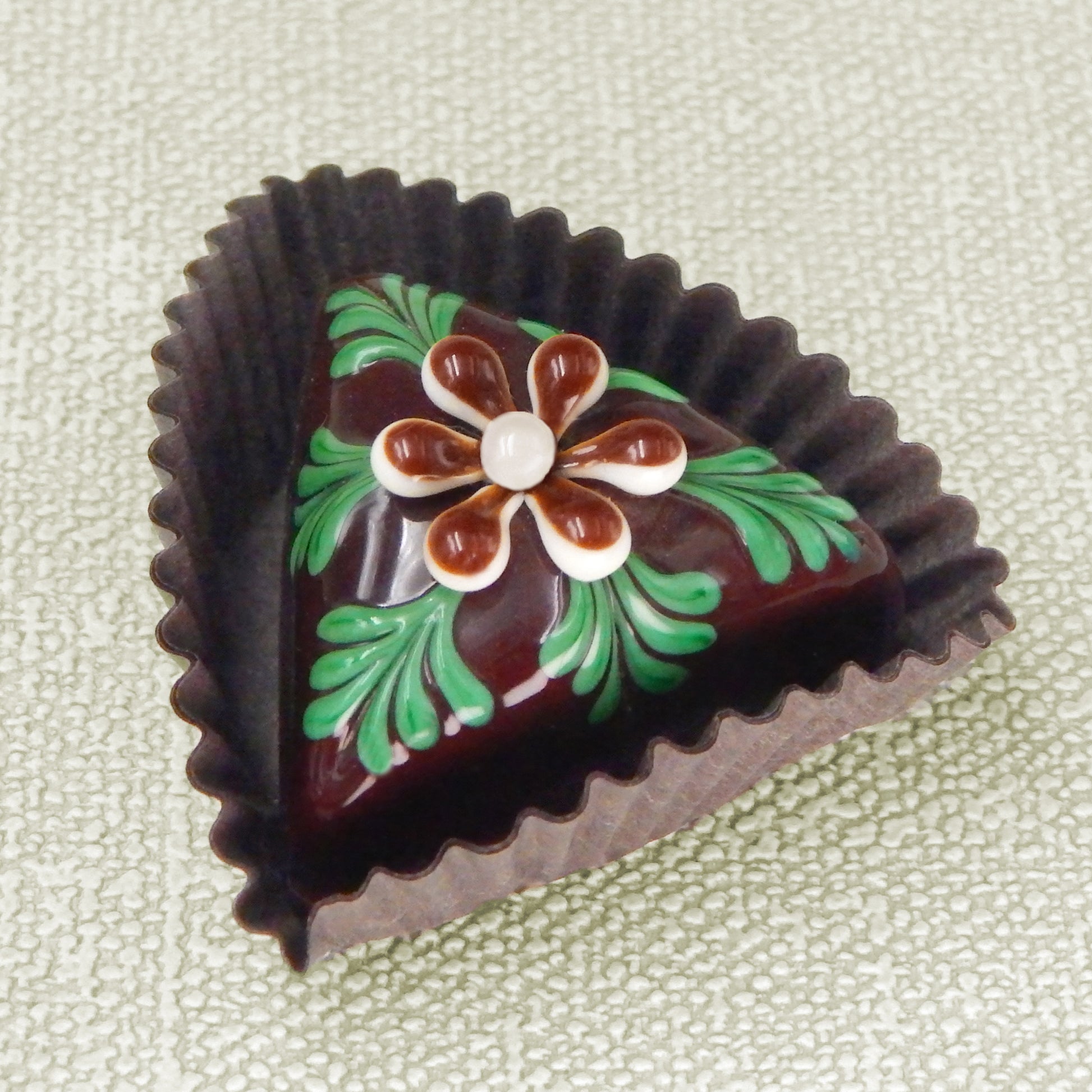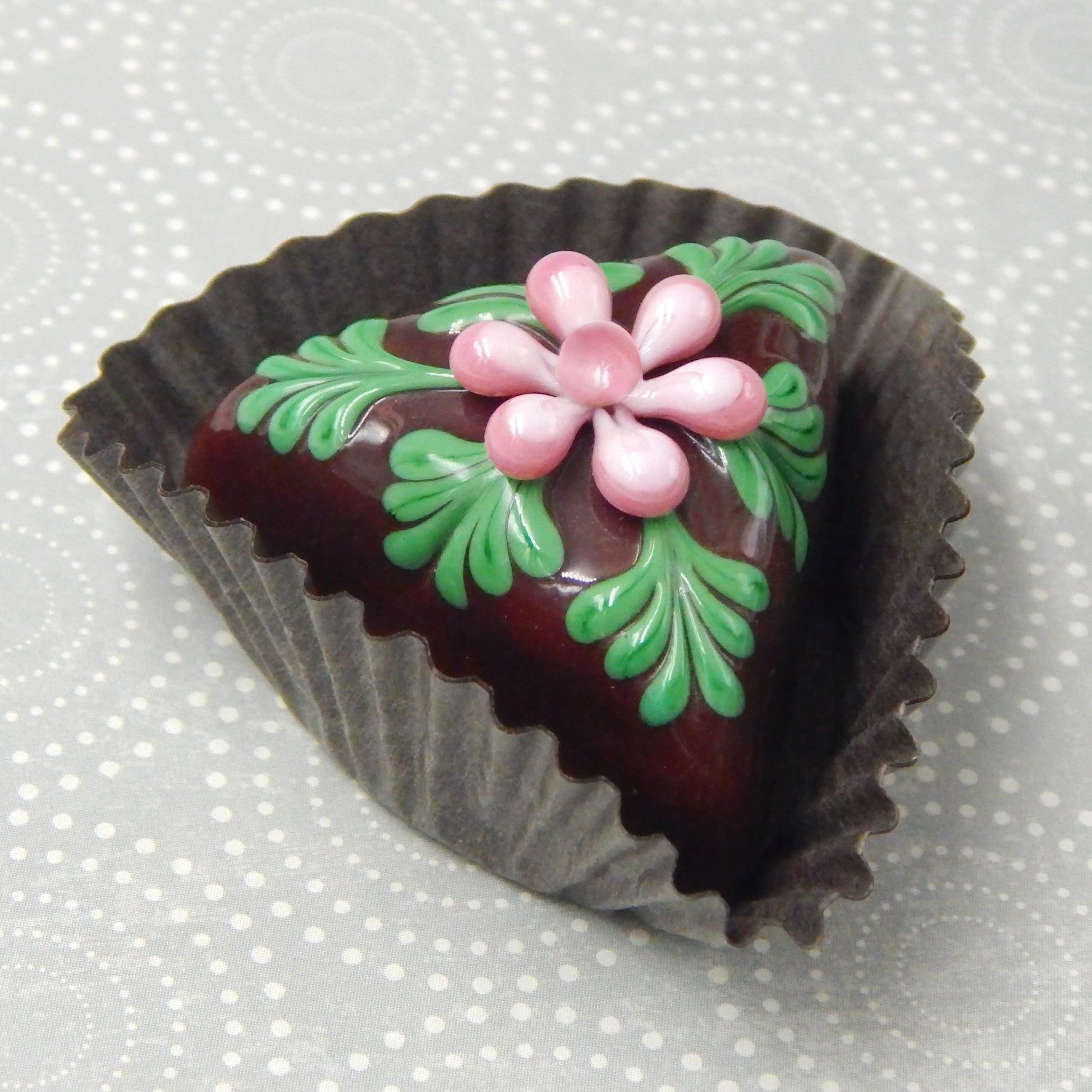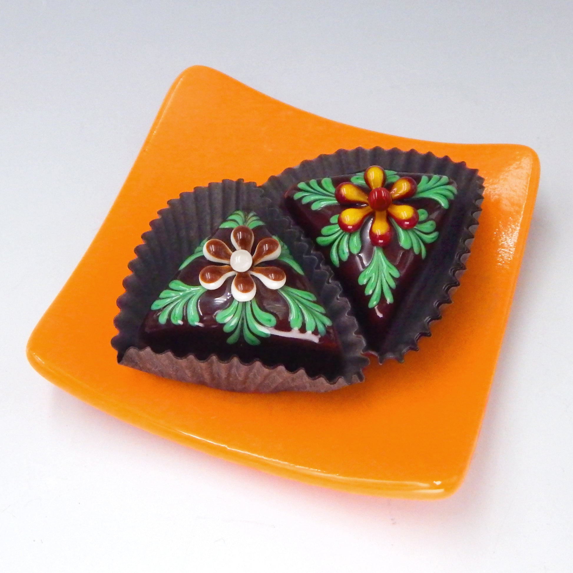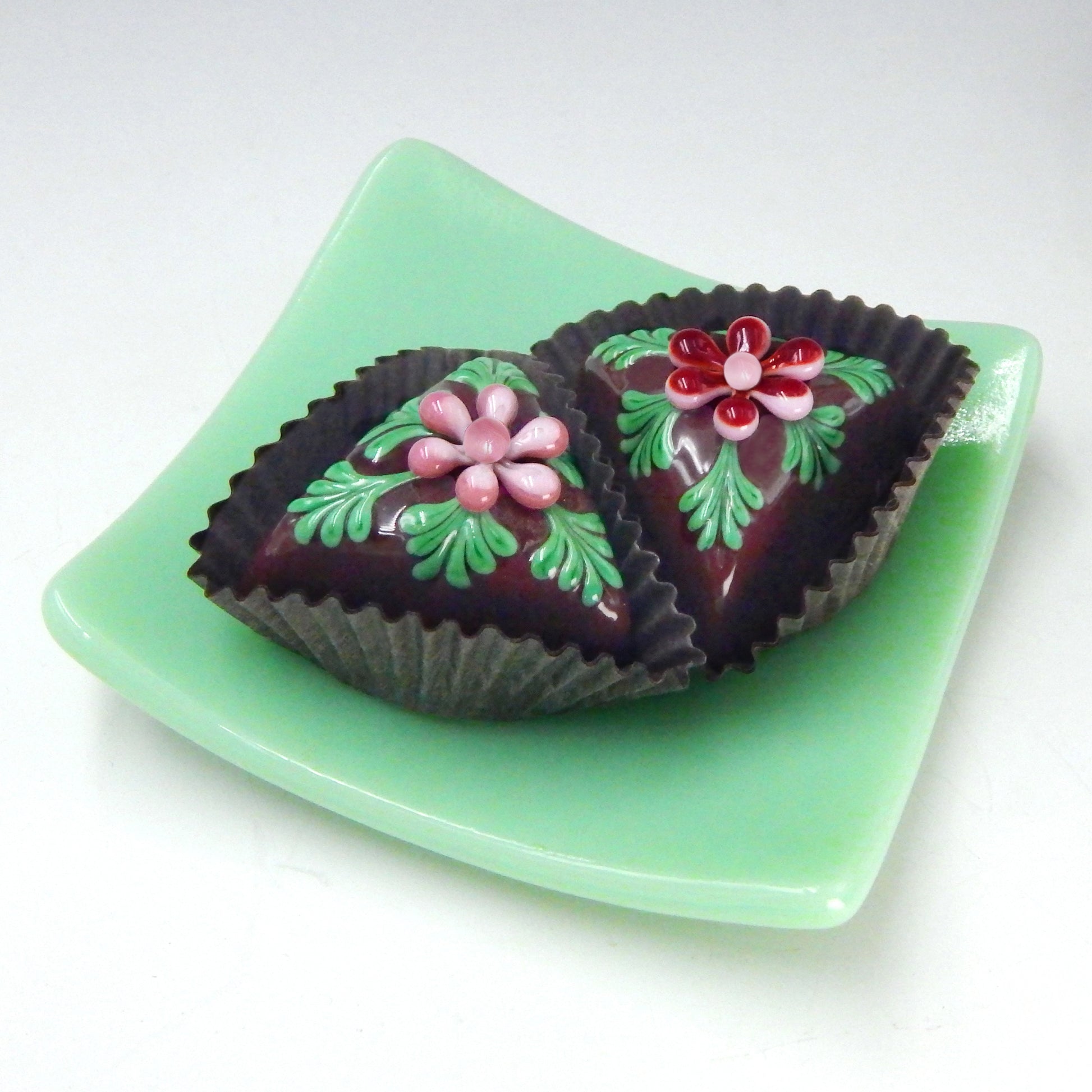 These inedible goodies are from our 'Hearts & Flowers Collection' and are among our many chocolate treats. We design our art glass delicacies to evoke memories of innocence, love and happy times. These pieces are created to tease, seduce, tempt and delight. Use them to create a unique display in a favorite heirloom dish or cabinet for your home or office. They are also perfect and thoughtful gifts for yourself or your friends.
