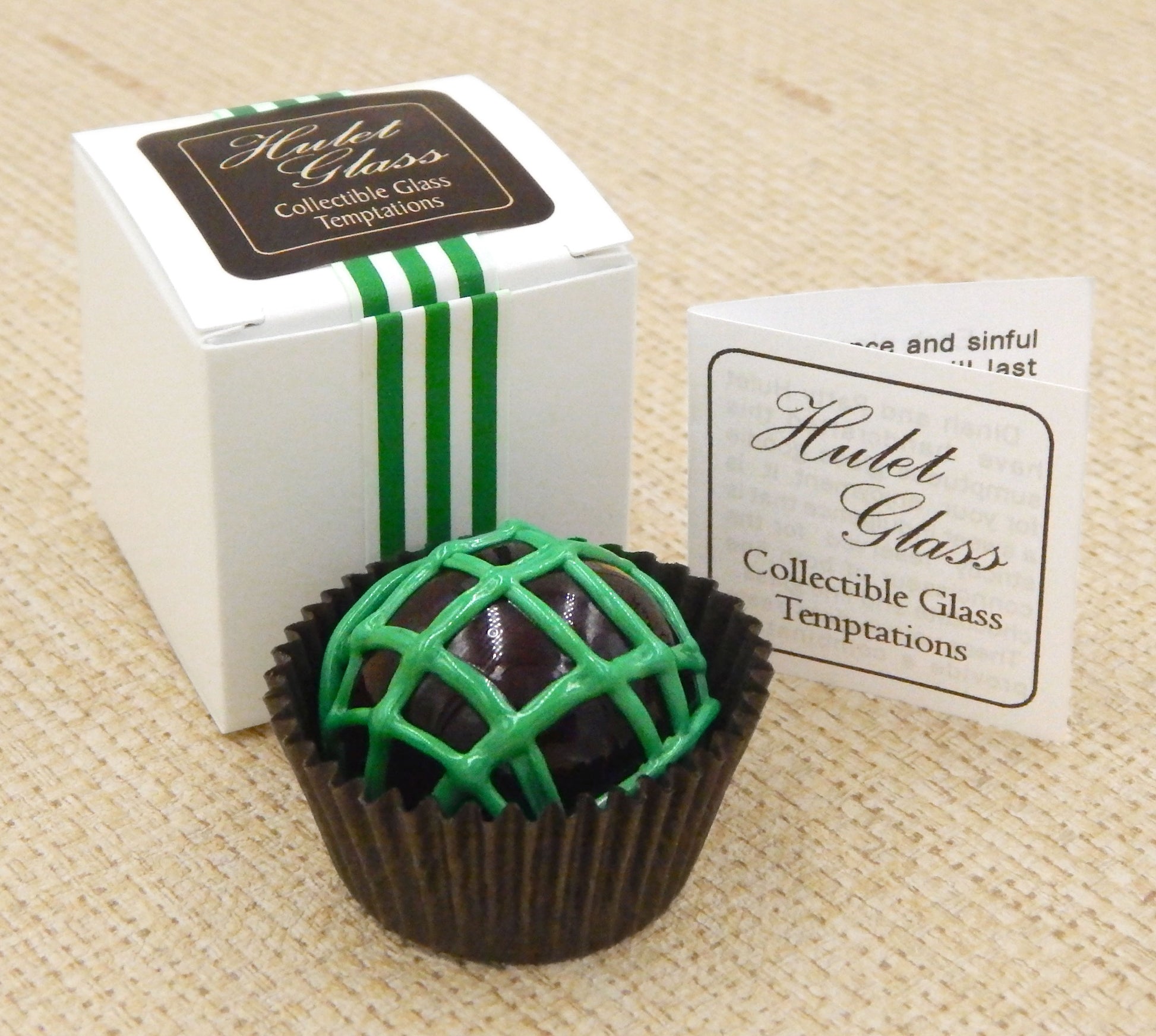The glass chocolate measures 1.5" x 1" (slightly larger than an actual chocolate candy) and sits in a fluted glassine paper candy cup. The bottom of the chocolate is covered in felt to protect the surface it will sit upon. Each beautiful glass chocolate is signed (Hulet), dated and comes to you in a colorful gift box with an enclosure card telling a bit about the piece.
