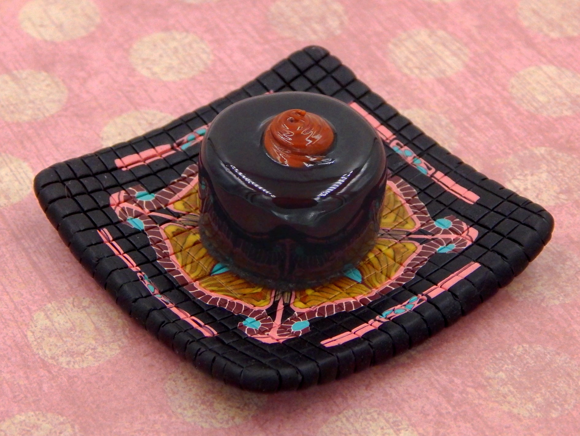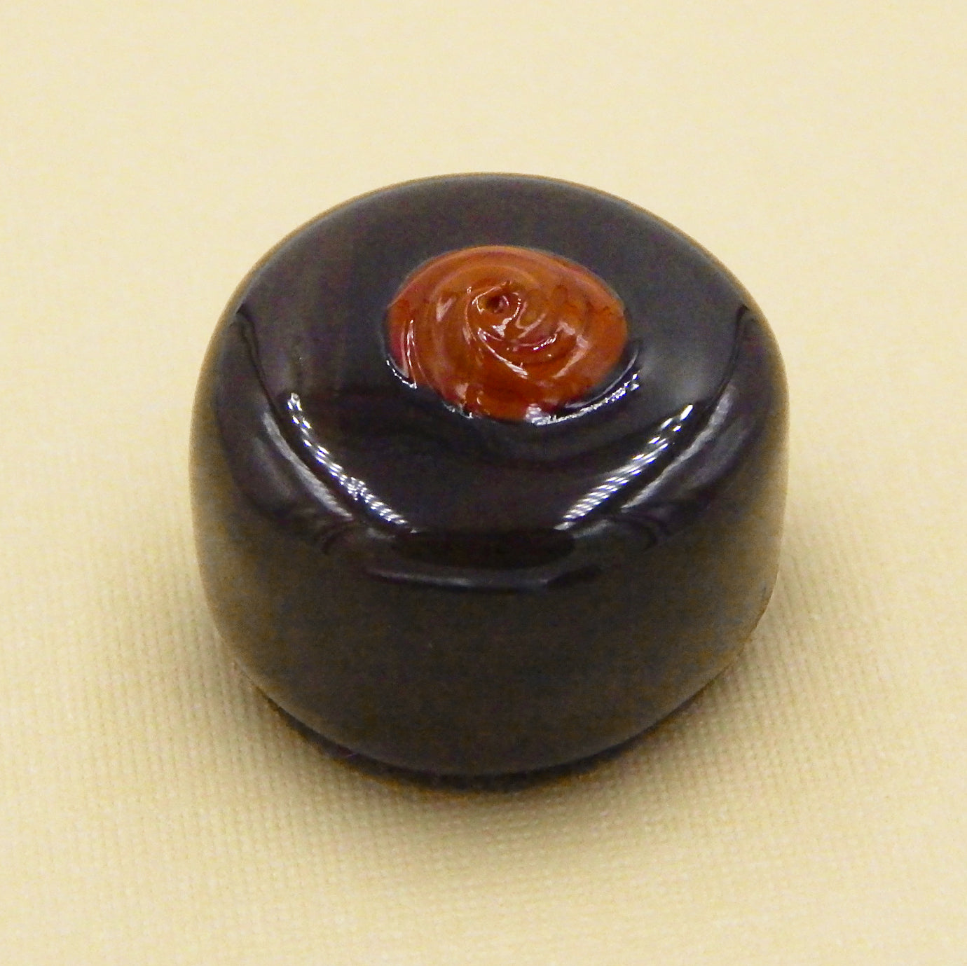 A handmade collectible solid glass chocolate with a creamy caramel dollop on top created from colorful glass utilizing flameworking techniques. Meticulous attention to detail has gone into the construction of each of our pieces to enhance its appeal and collectibility.