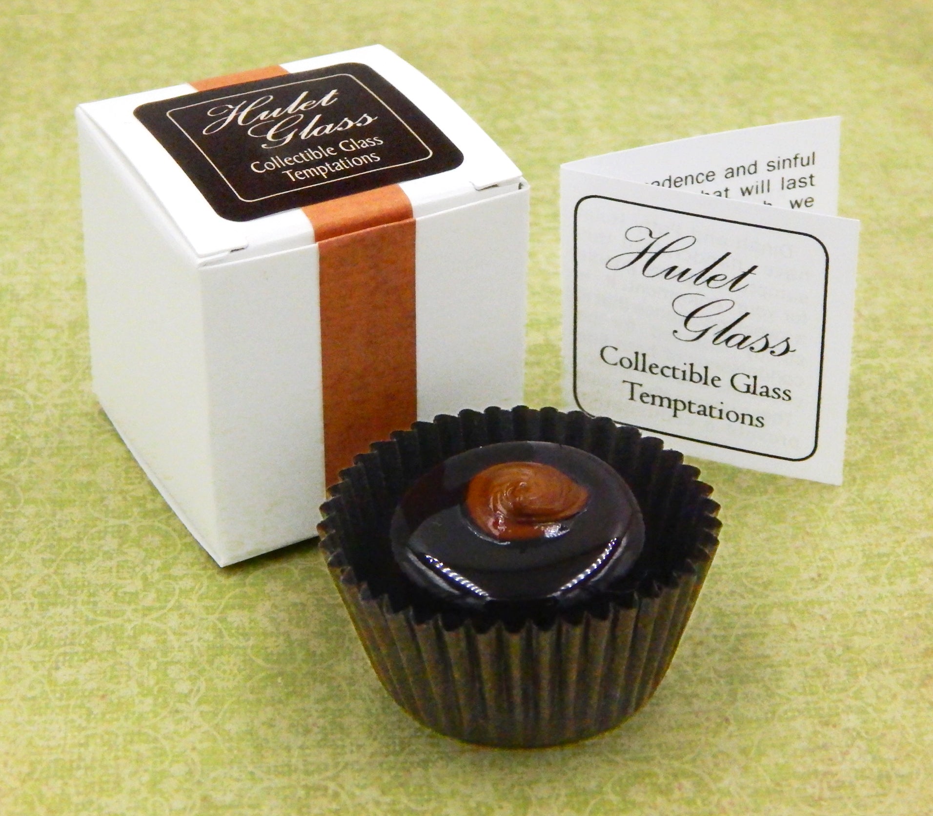 The glass chocolate measures approximately 1.25" x .75" (slightly larger than an actual chocolate candy) and sits in a fluted glassine paper candy cup. The bottom of the chocolate is covered in felt to protect the surface it will sit upon. Each beautiful glass chocolate is signed (Hulet), dated and comes to you in a colorful gift box with an enclosure card telling a bit about the piece.