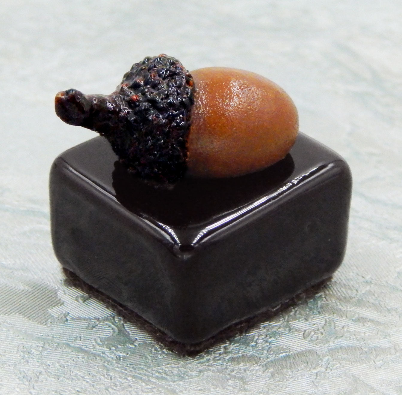 A handmade collectible solid glass chocolate with an acorn on top created from colorful glass utilizing ancient pate de verre and lampworking techniques. Meticulous attention to detail has gone into the construction of each of our pieces to enhance its appeal and collectibility.