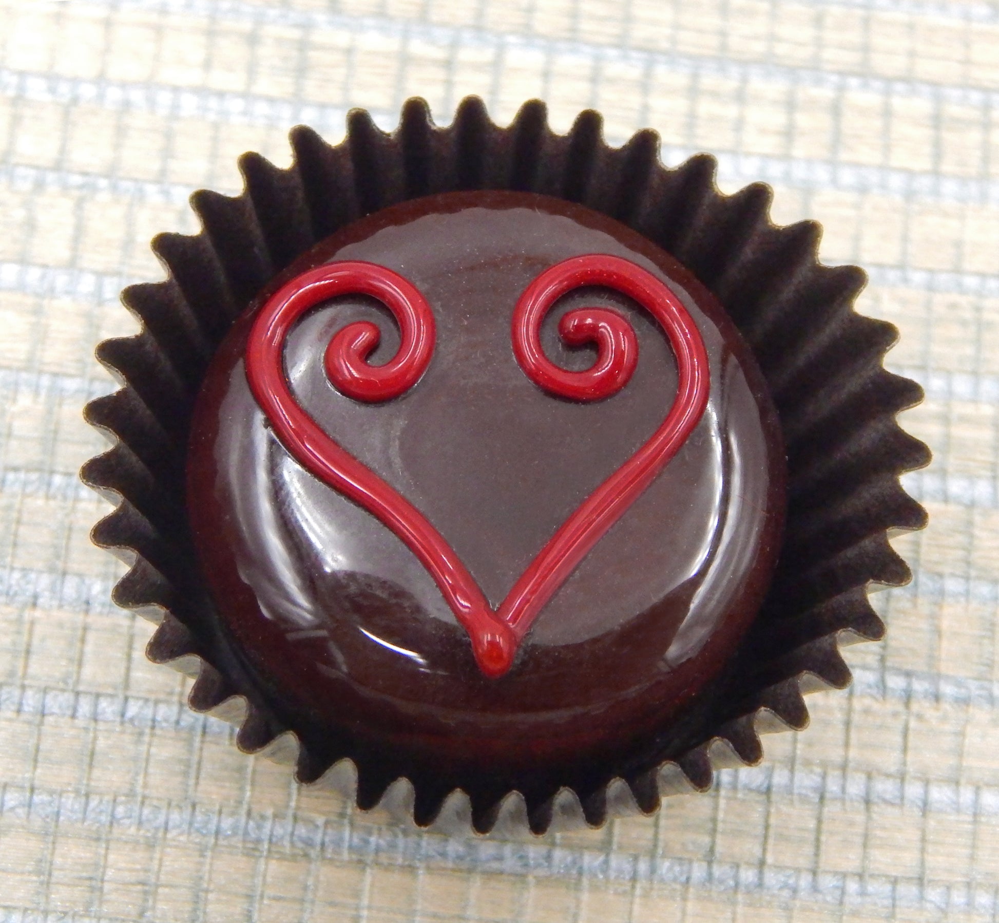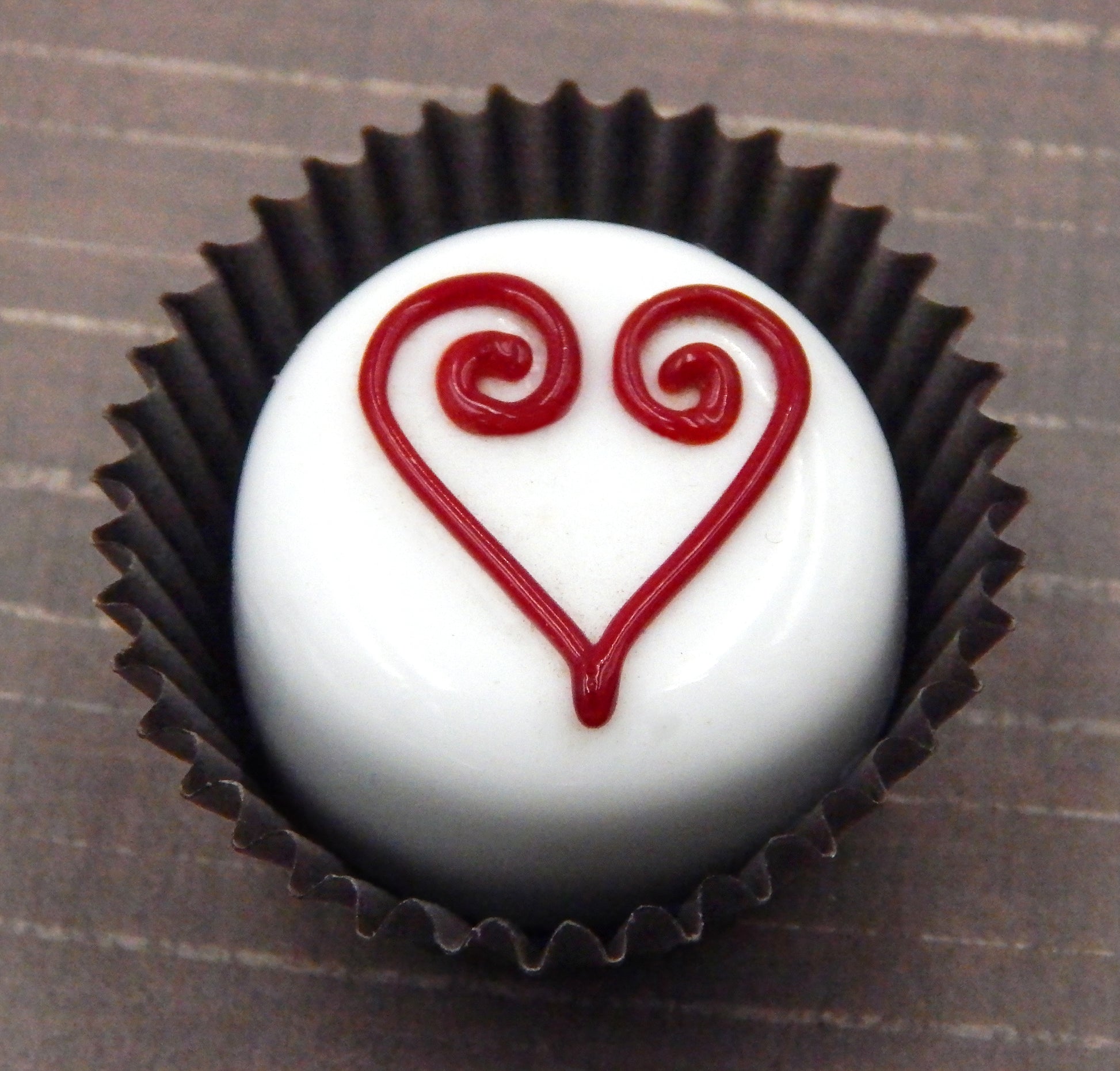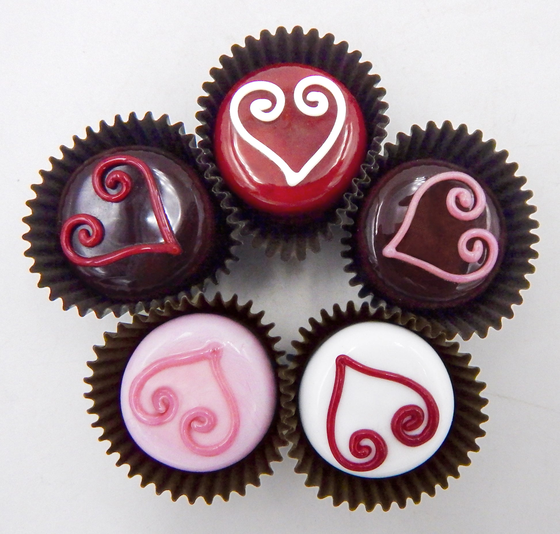 Handmade collectible solid glass chocolates each with a whimsical curly heart on top created from colorful glass utilizing flameworking techniques. Meticulous attention to detail has gone into the construction of each of our pieces to enhance its appeal and collectibility.