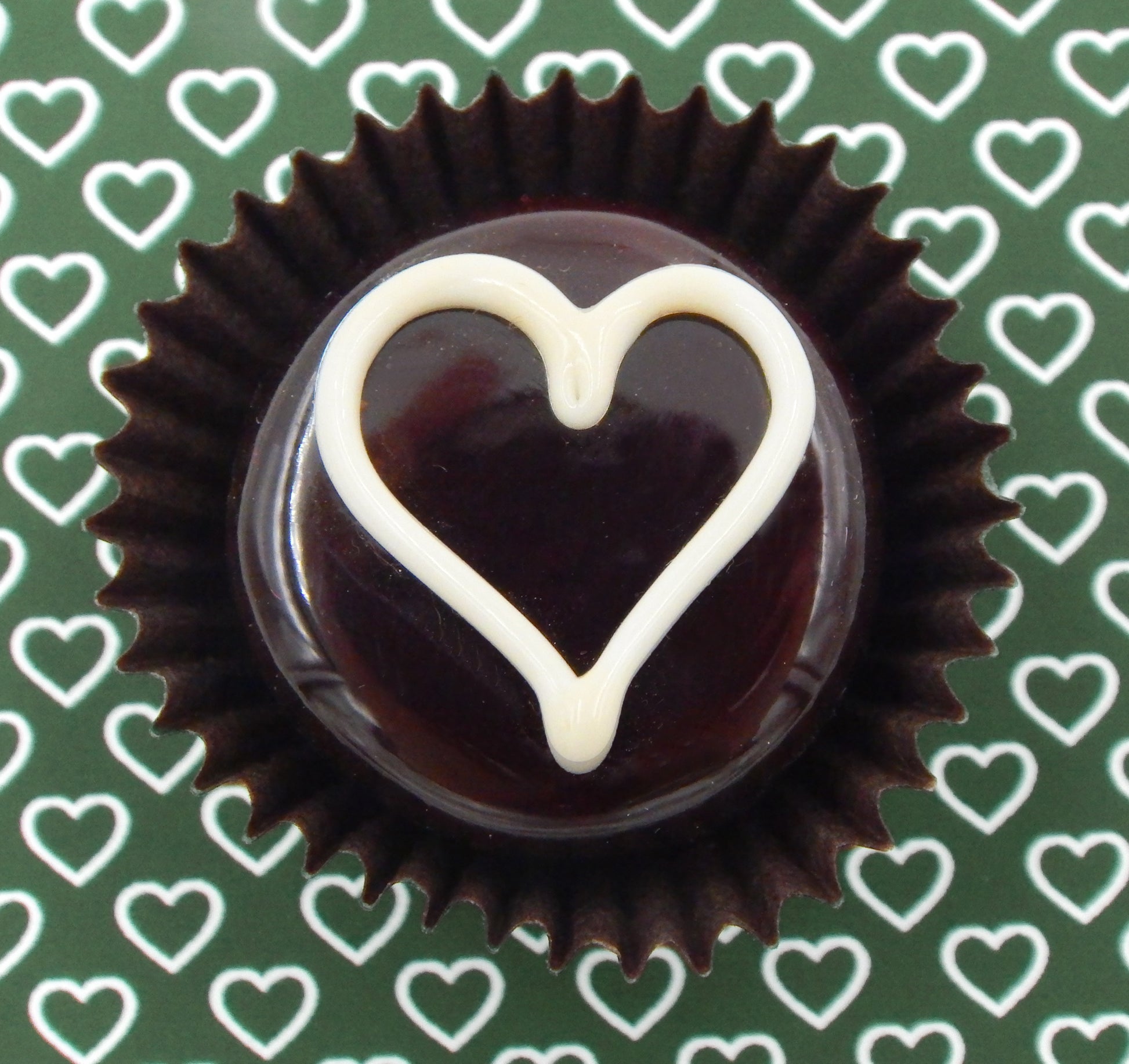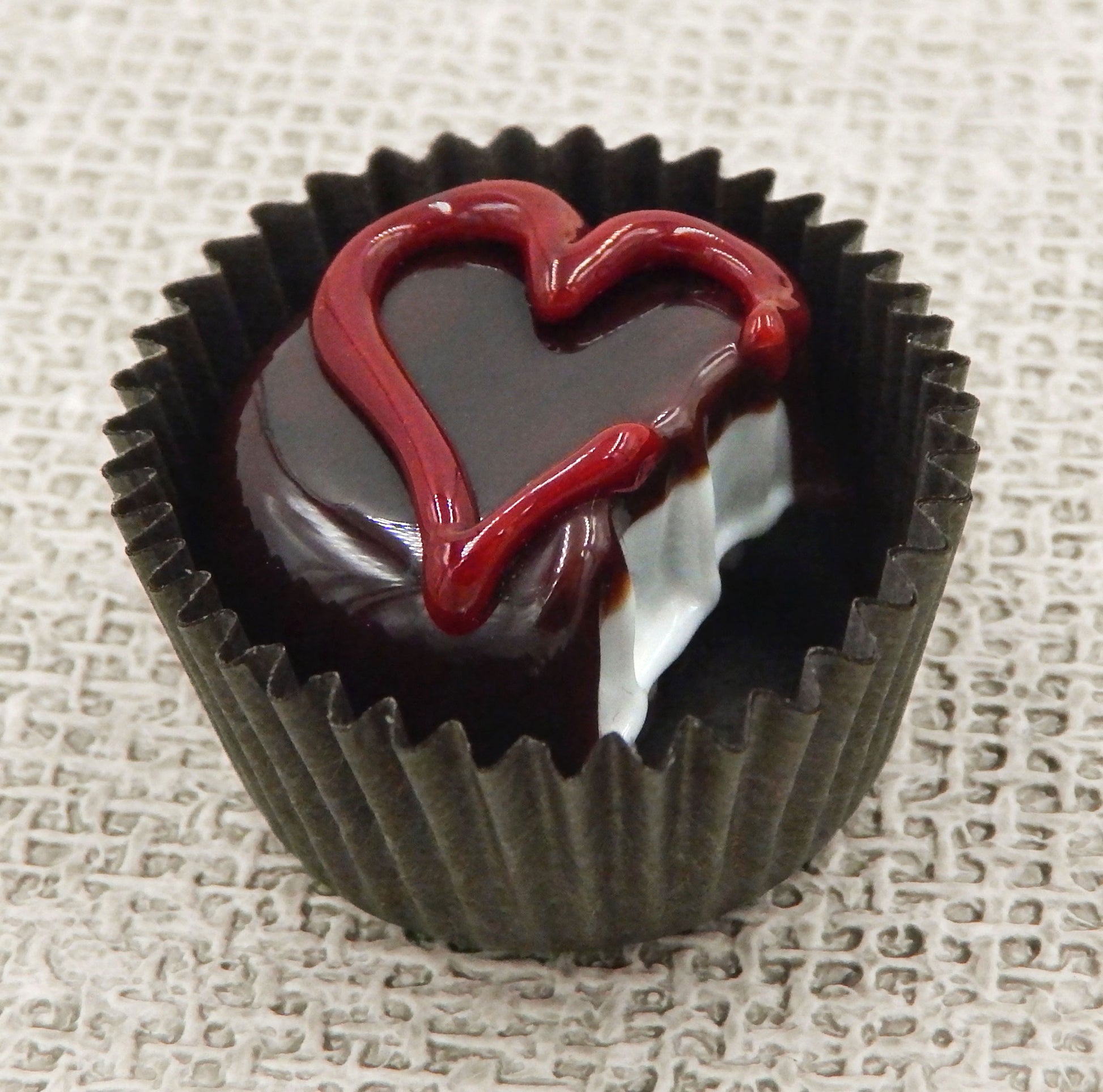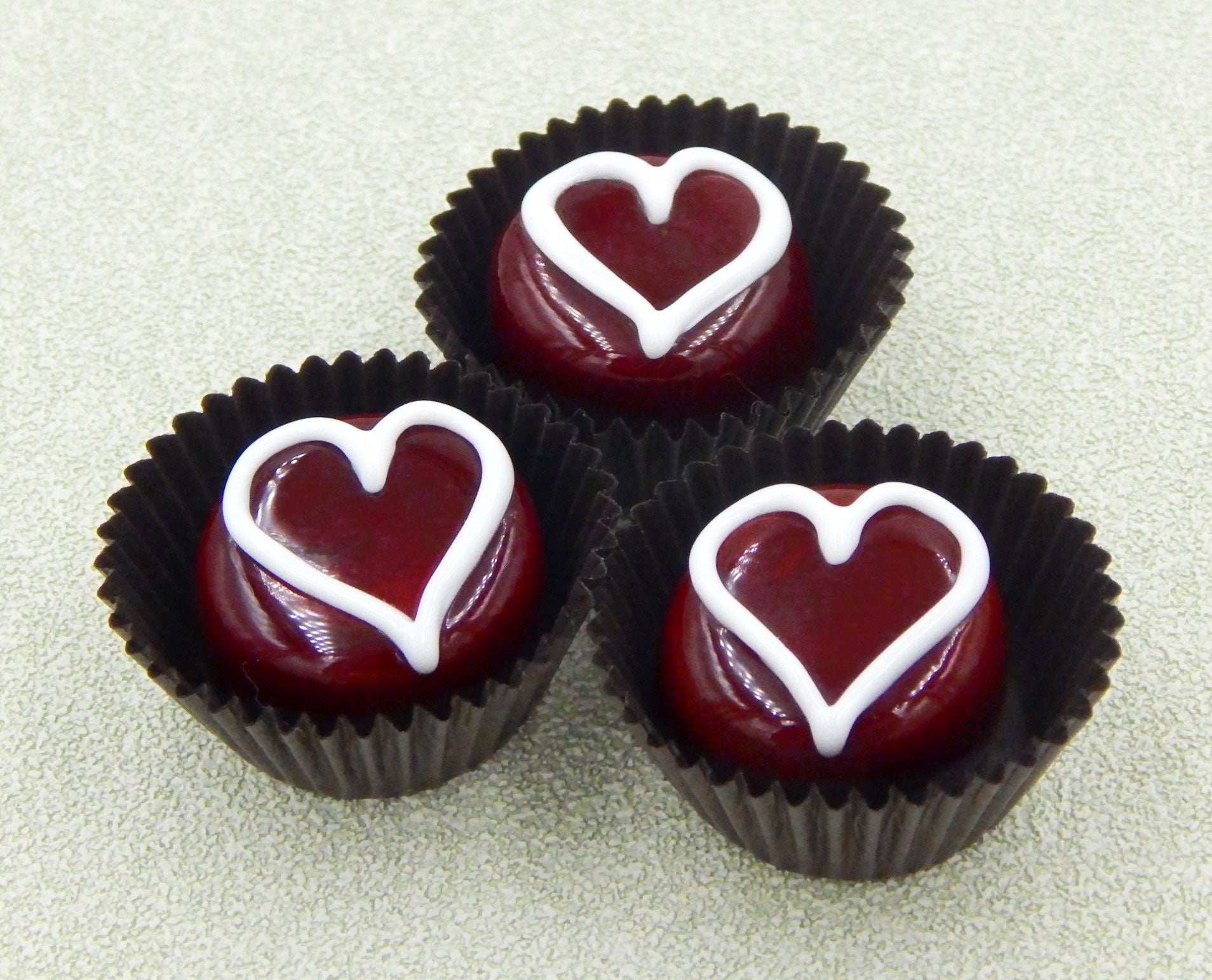 Handmade collectible solid glass chocolates each with a yummy line heart on top created from colorful glass utilizing flameworking techniques. Meticulous attention to detail has gone into the construction of each of our pieces to enhance its appeal and collectibility.