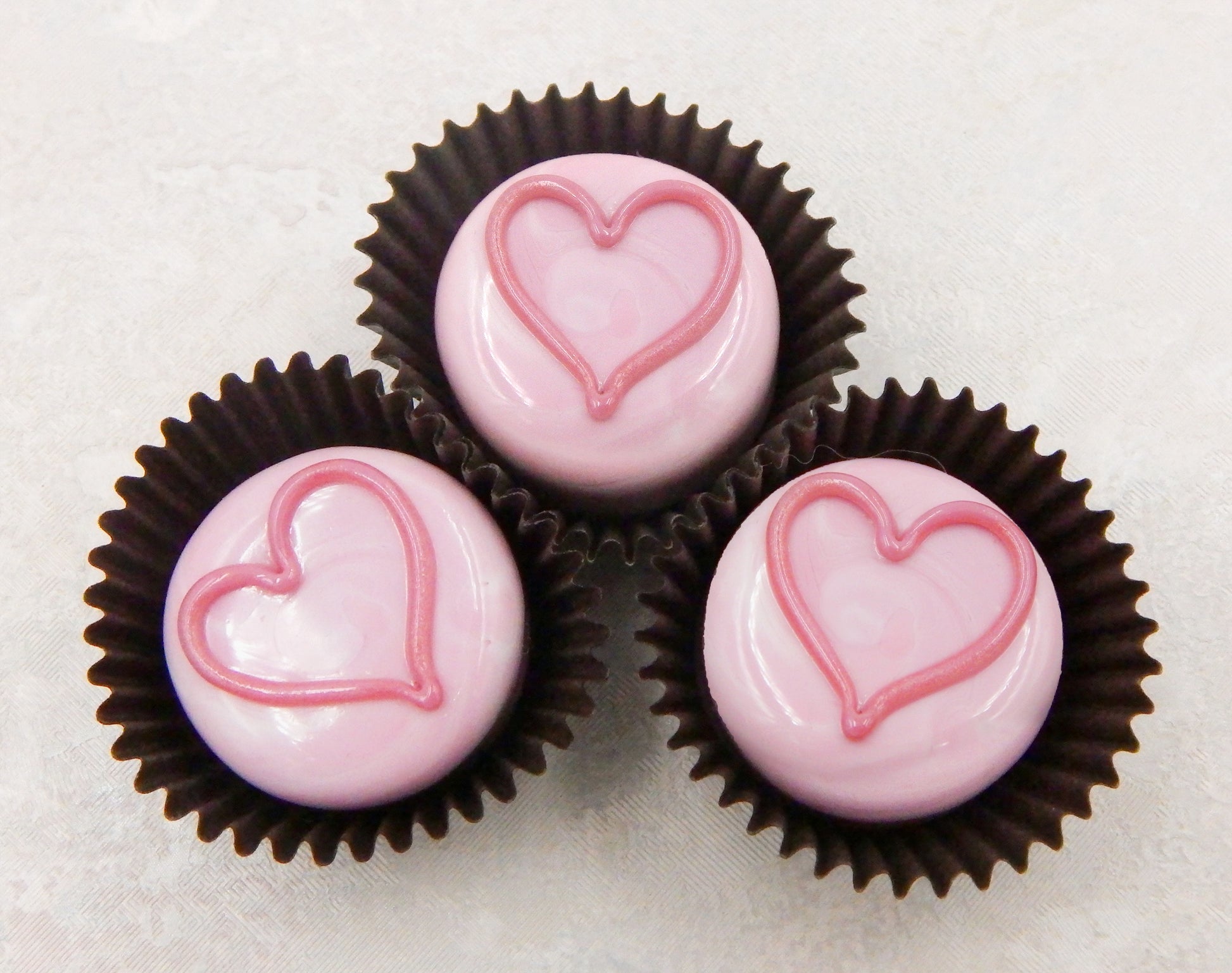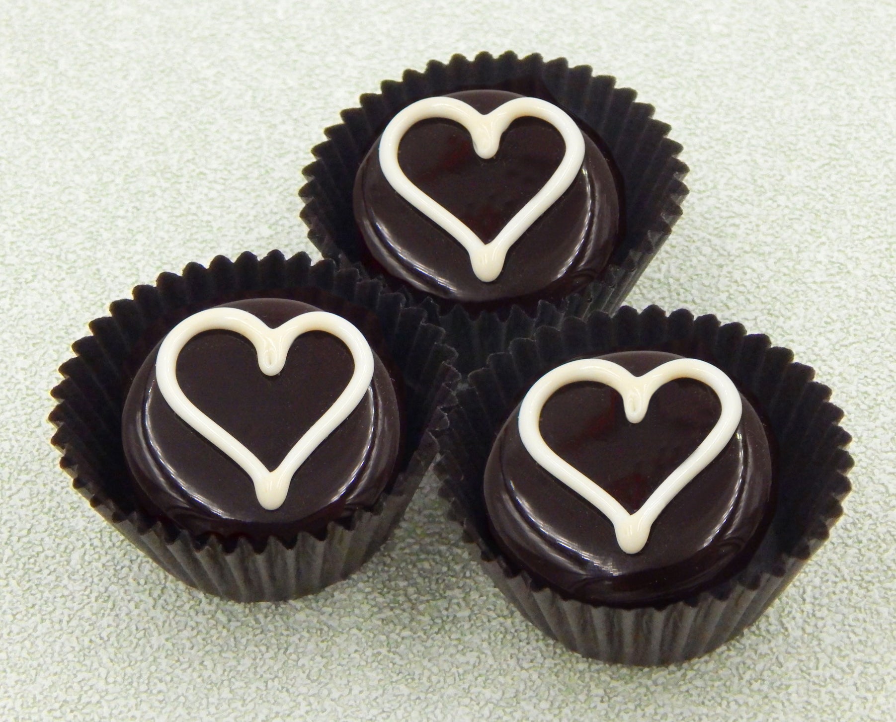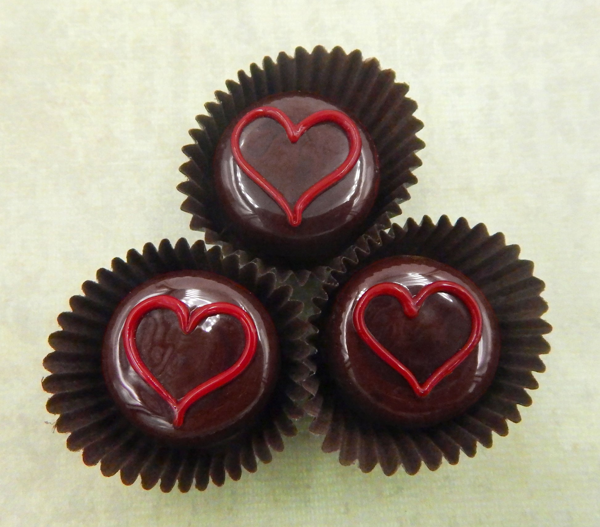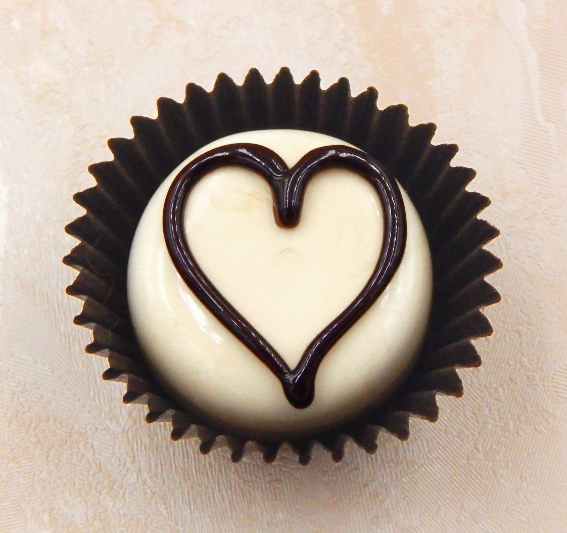 Handmade collectible solid glass chocolates each with a yummy line heart on top created from colorful glass utilizing flameworking techniques. Meticulous attention to detail has gone into the construction of each of our pieces to enhance its appeal and collectibility.
