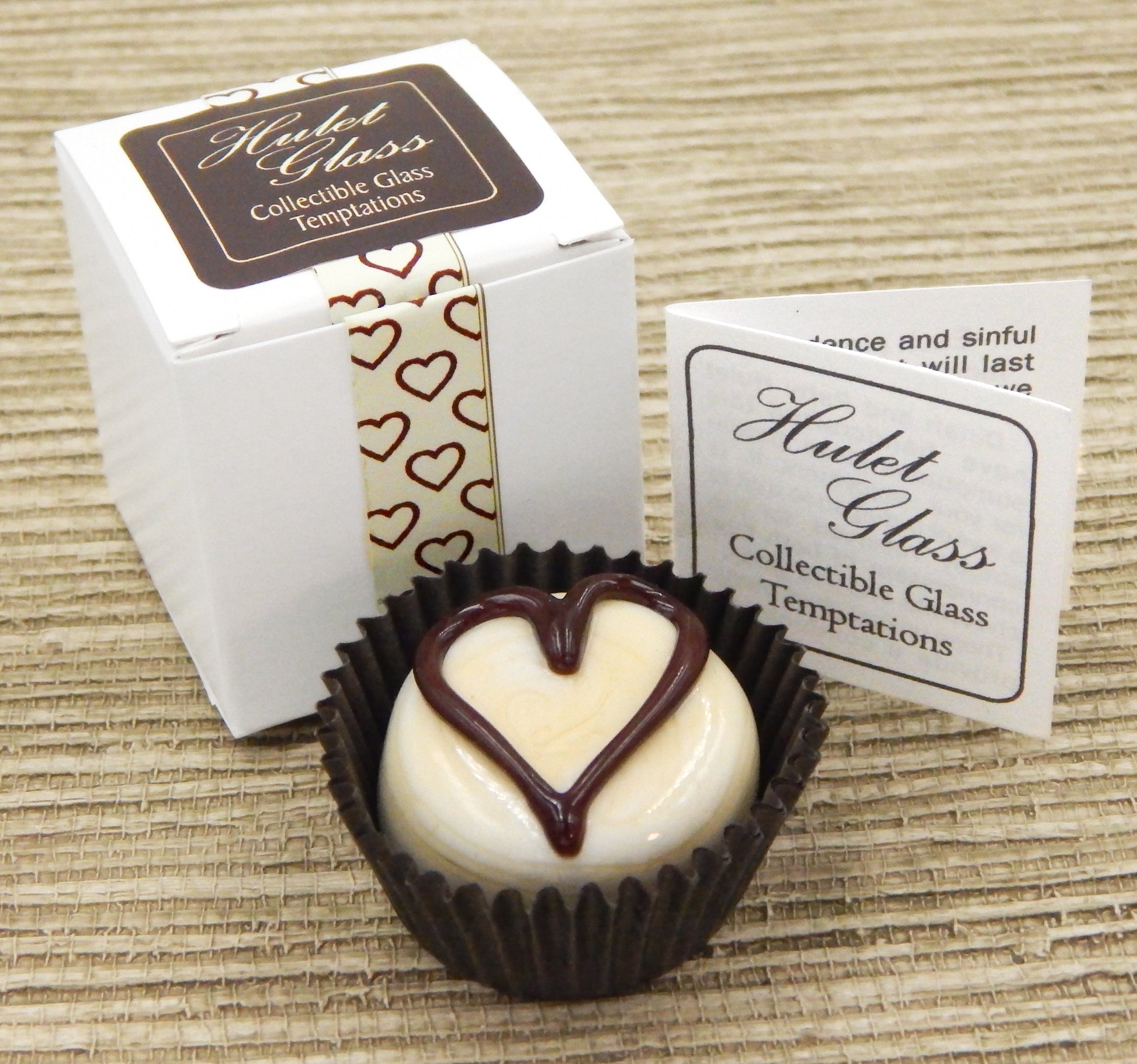 The glass chocolate measures approximately 1.25" diameter x 1" tall (slightly larger than an actual chocolate candy) and sits in a fluted glassine paper candy cup. The bottom of the chocolate is covered in felt to protect the surface it will sit upon. Each beautiful glass chocolate is signed (Hulet), dated and comes to you in a colorful gift box with an enclosure card telling a bit about the piece.