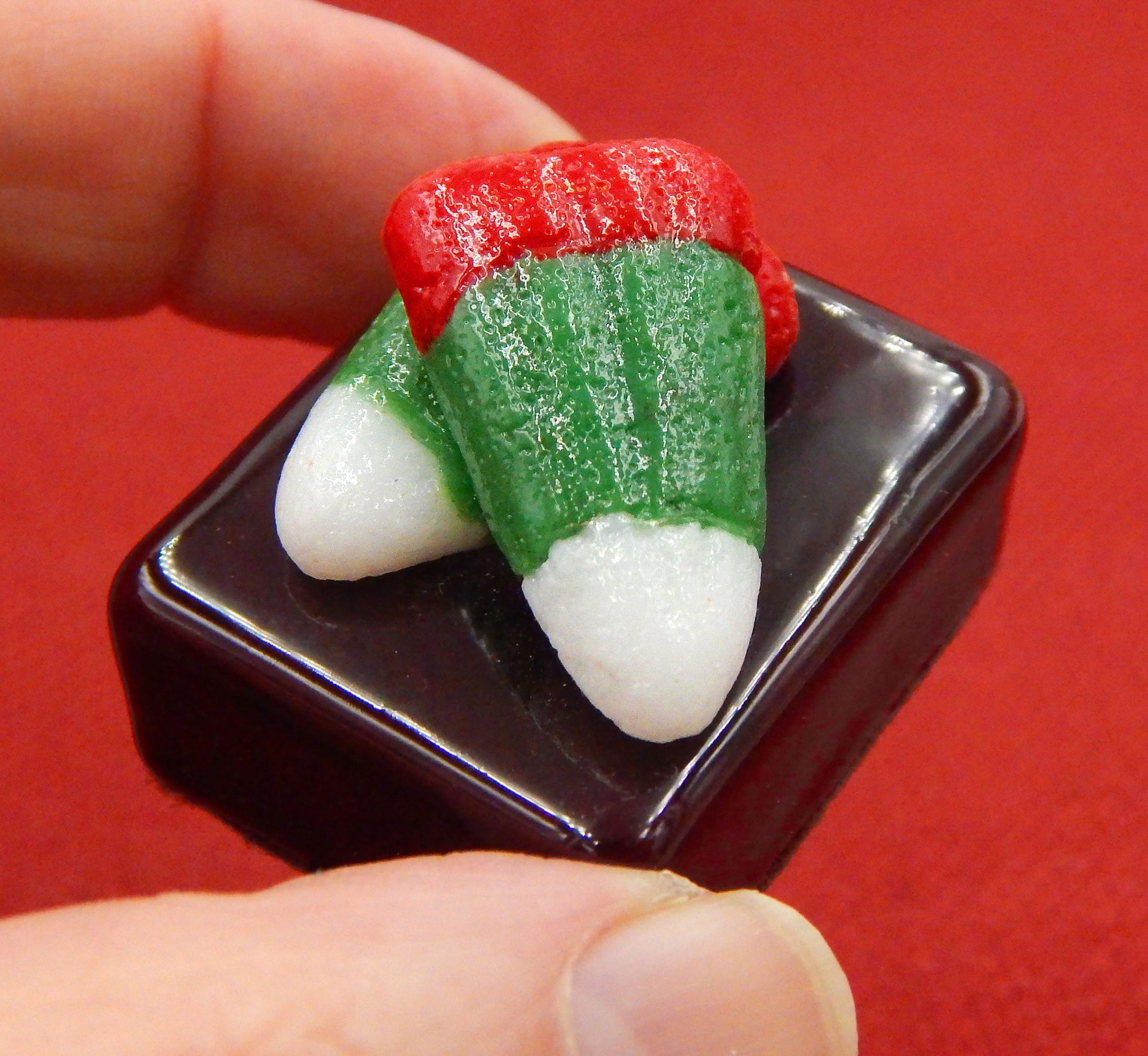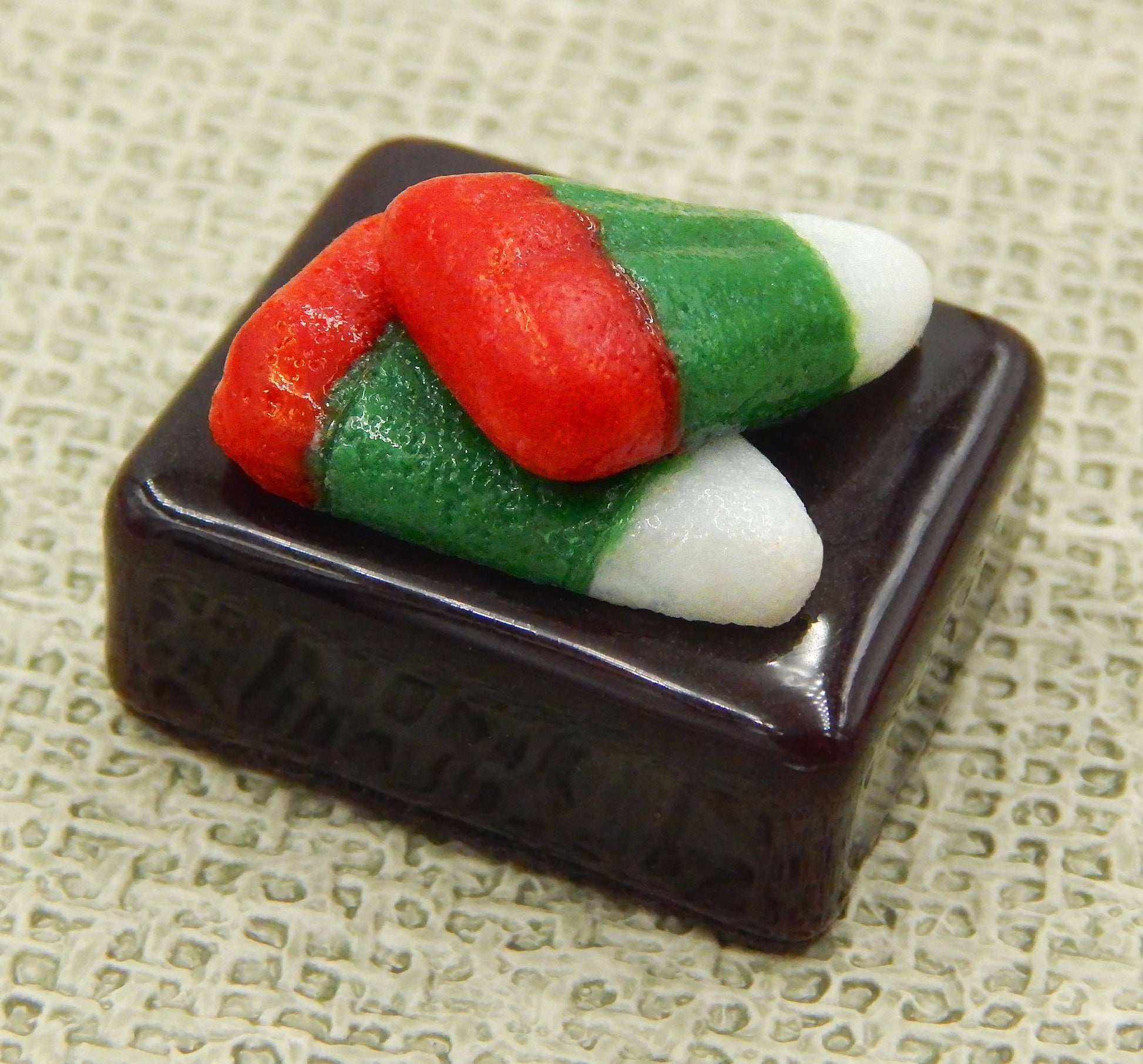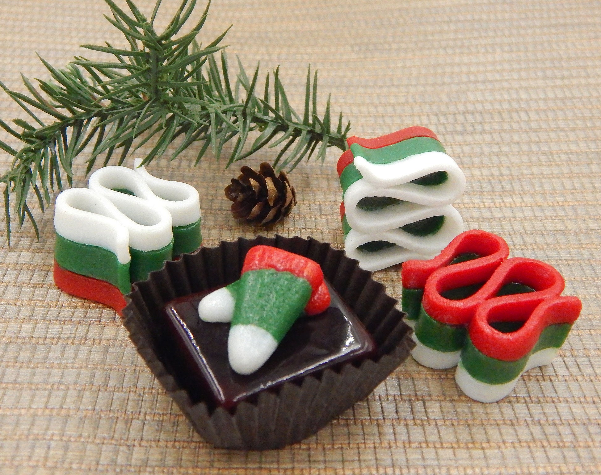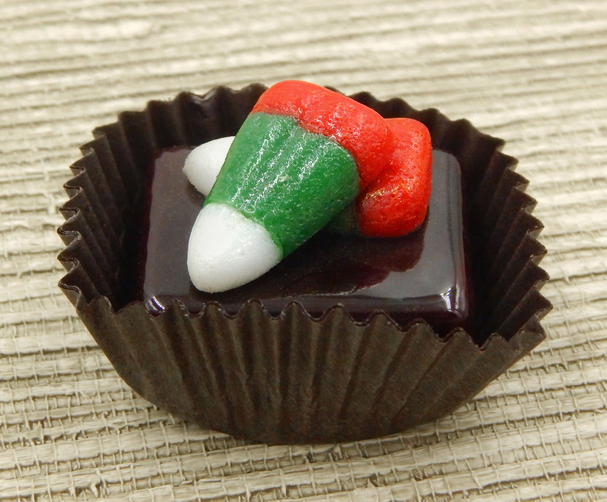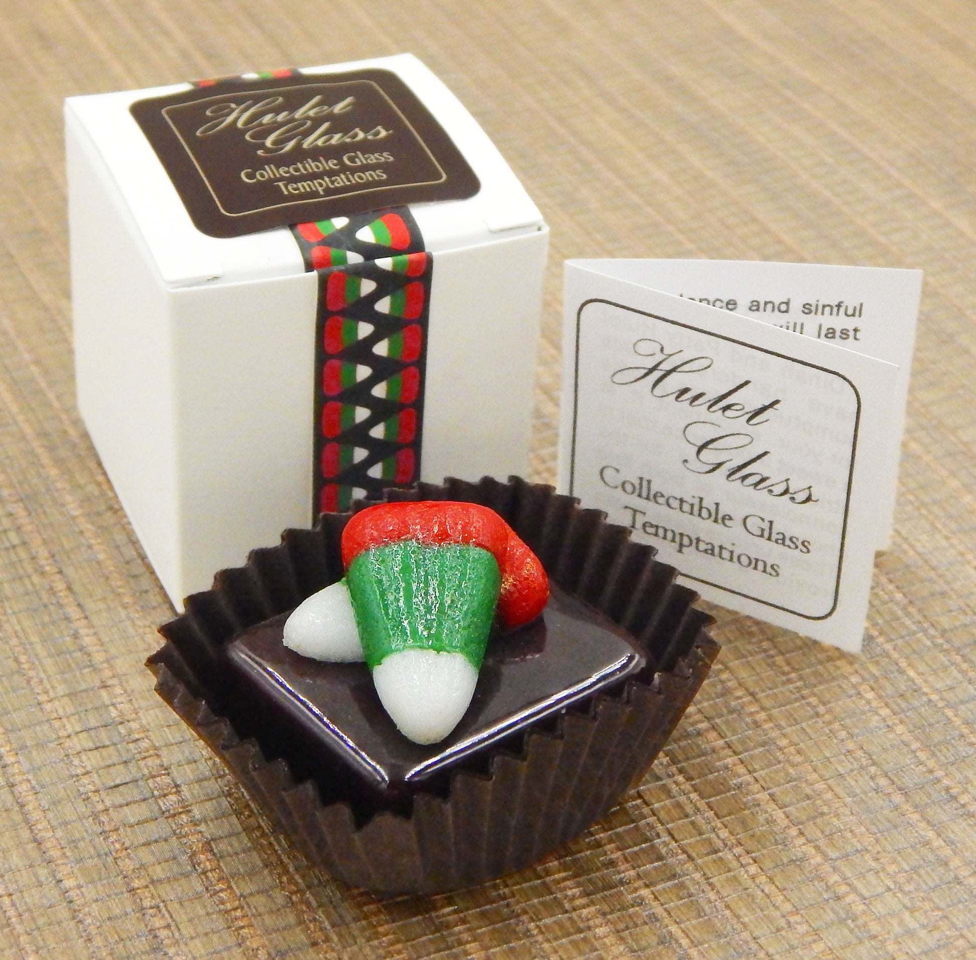 A handmade collectible solid glass chocolate with Christmas Candy Corn on top created from colorful glass utilizing ancient pate de verre and lampworking techniques. Meticulous attention to detail has gone into the construction of each of our pieces to enhance its appeal and collectibility.