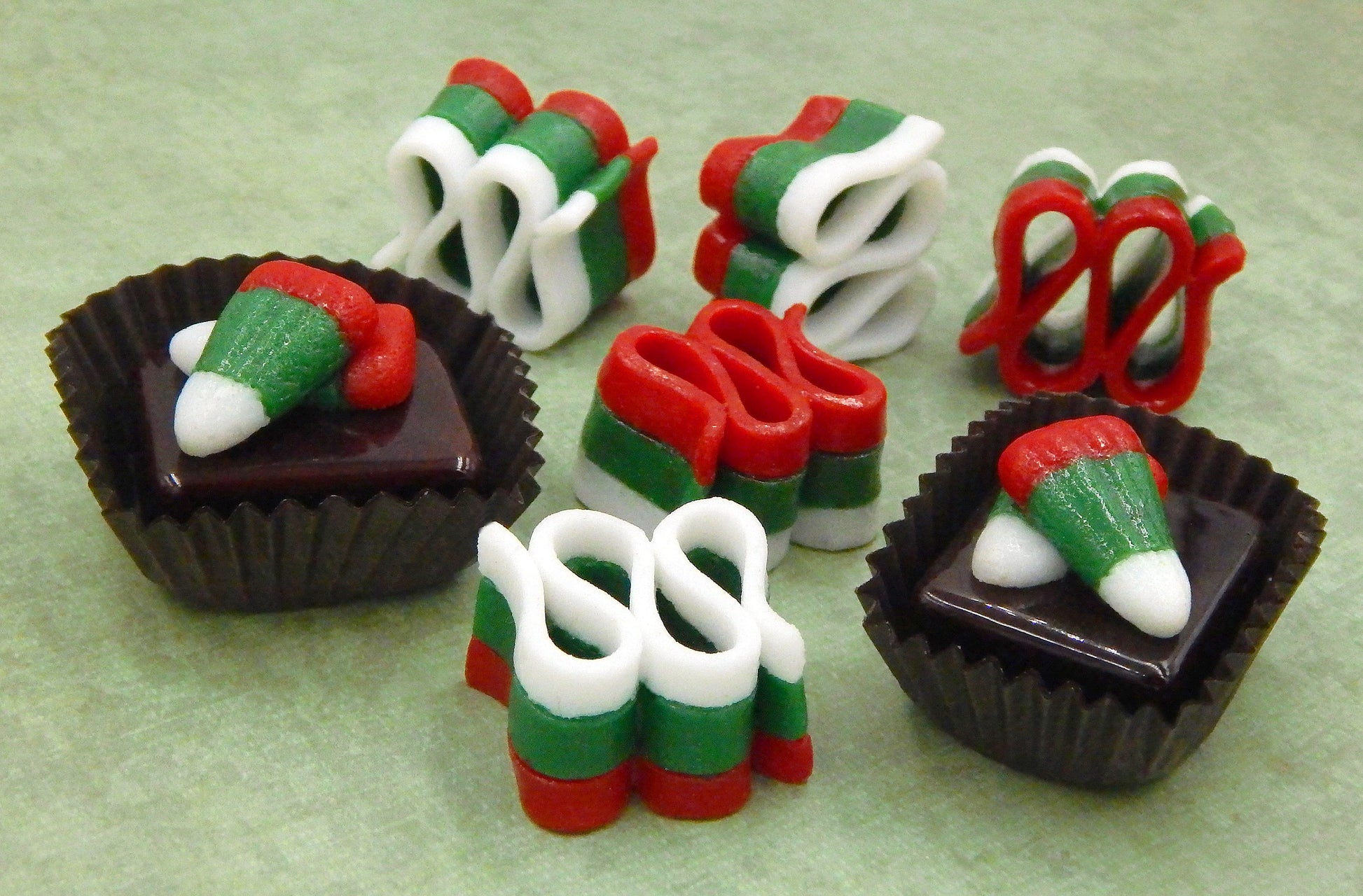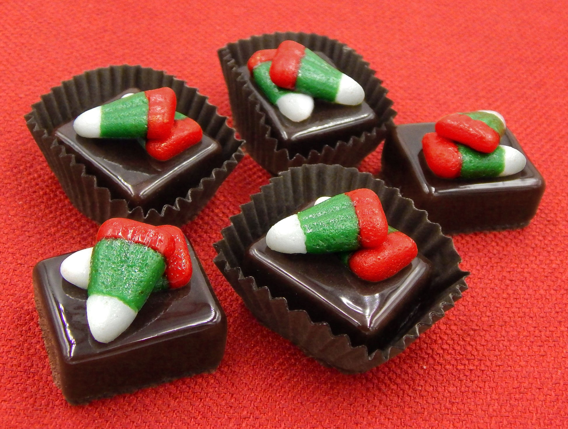 This listing is for 1 glass chocolate as seen in the first photo. The third photo shows an example of the slight variation between individual handmade chocolates. The final photos show the Christmas Candy Corn chocolates displayed with our unique Christmas Ribbon Candy.