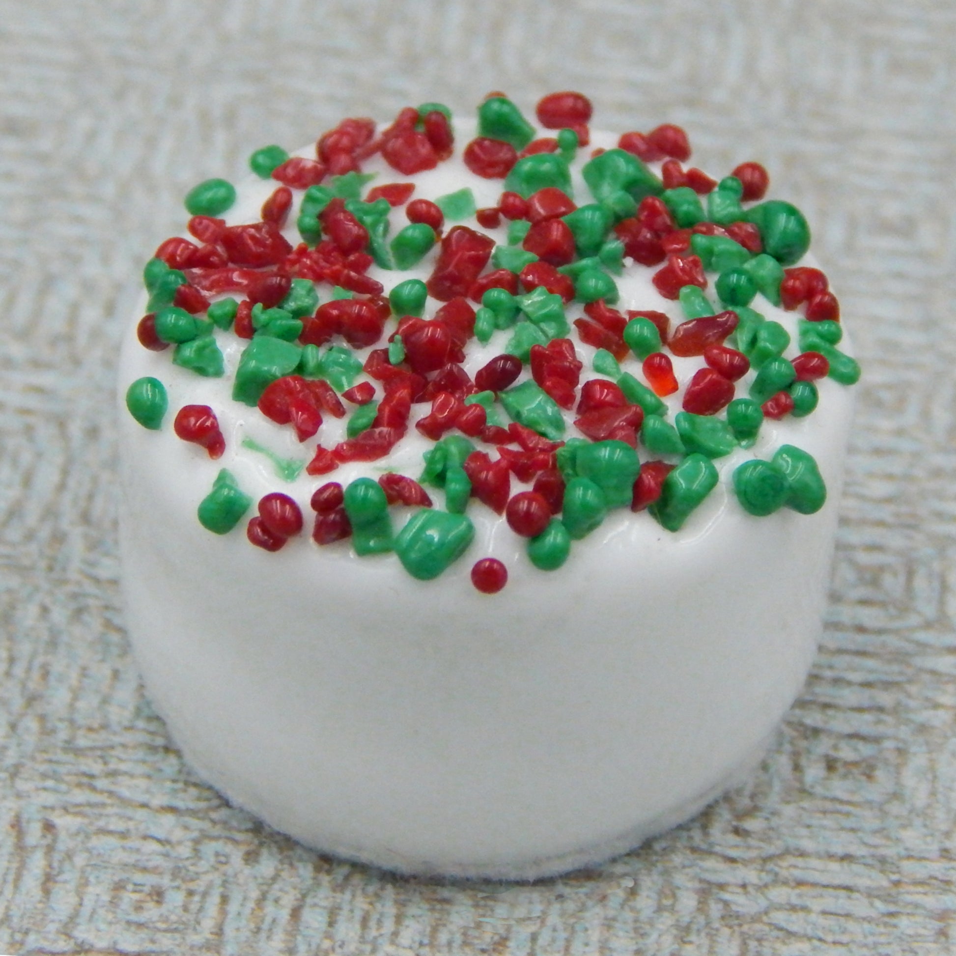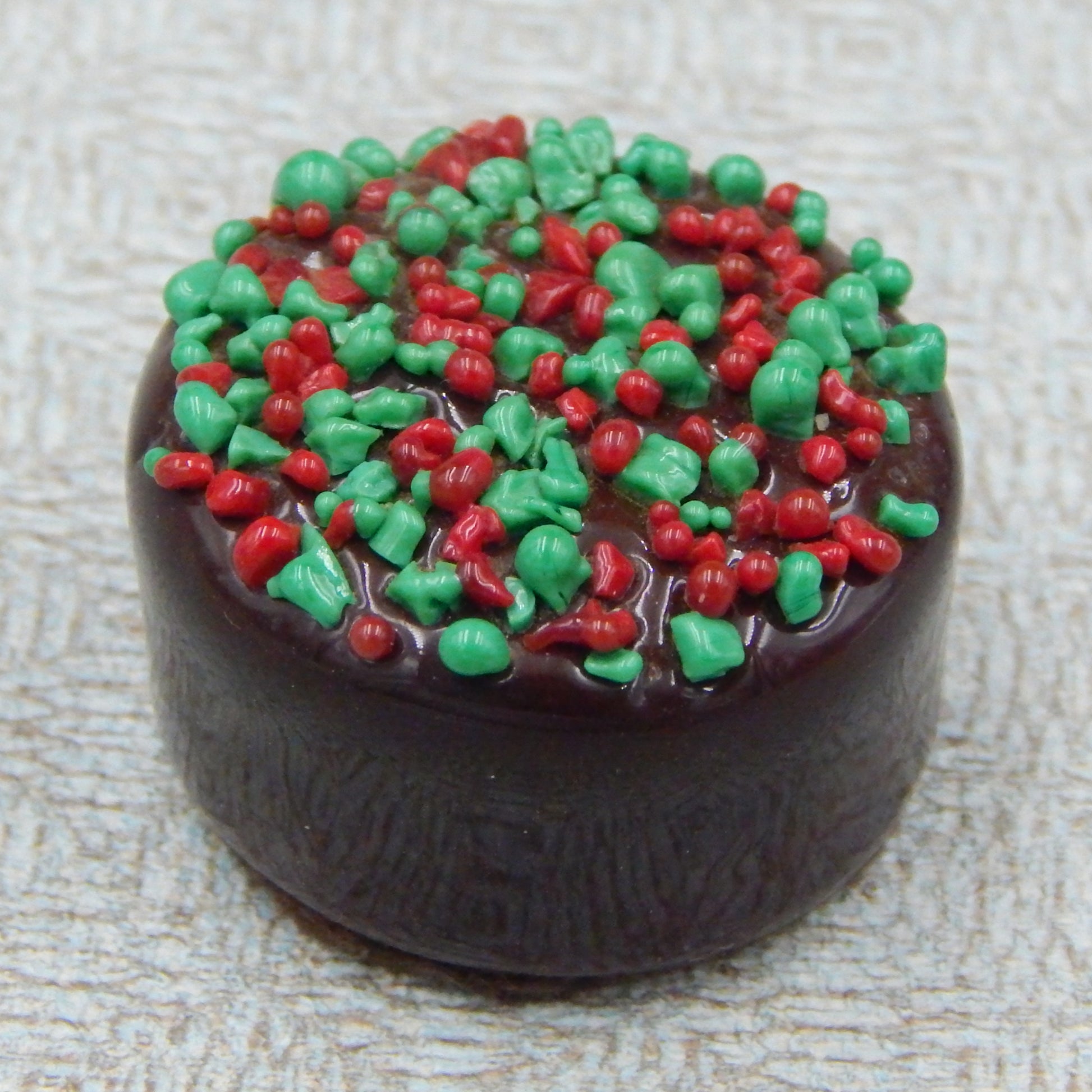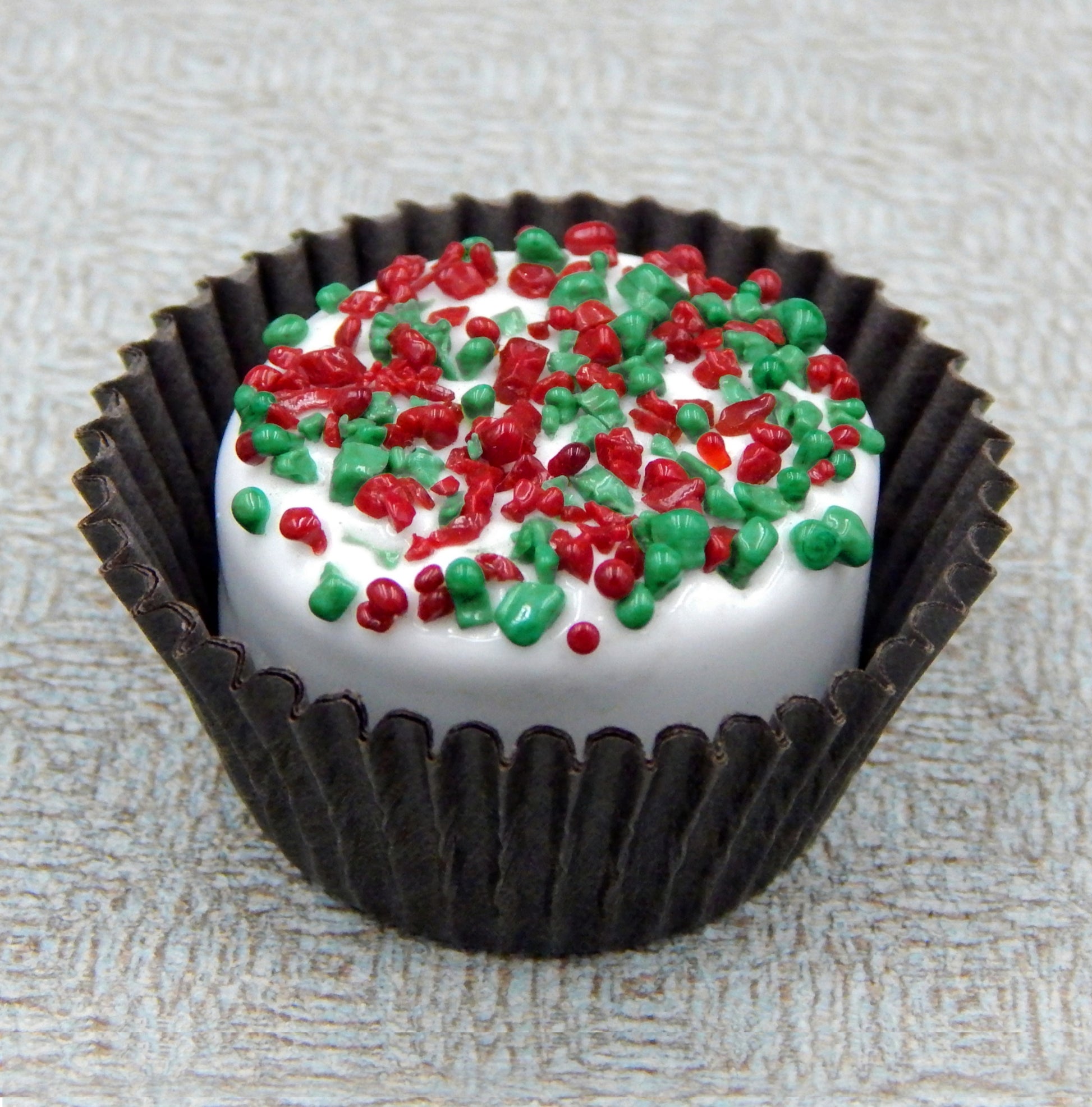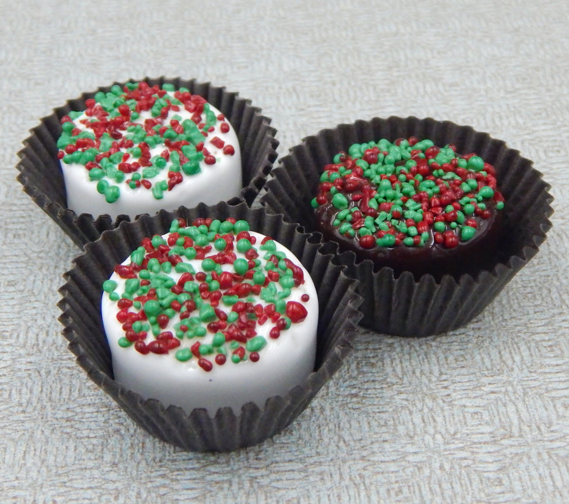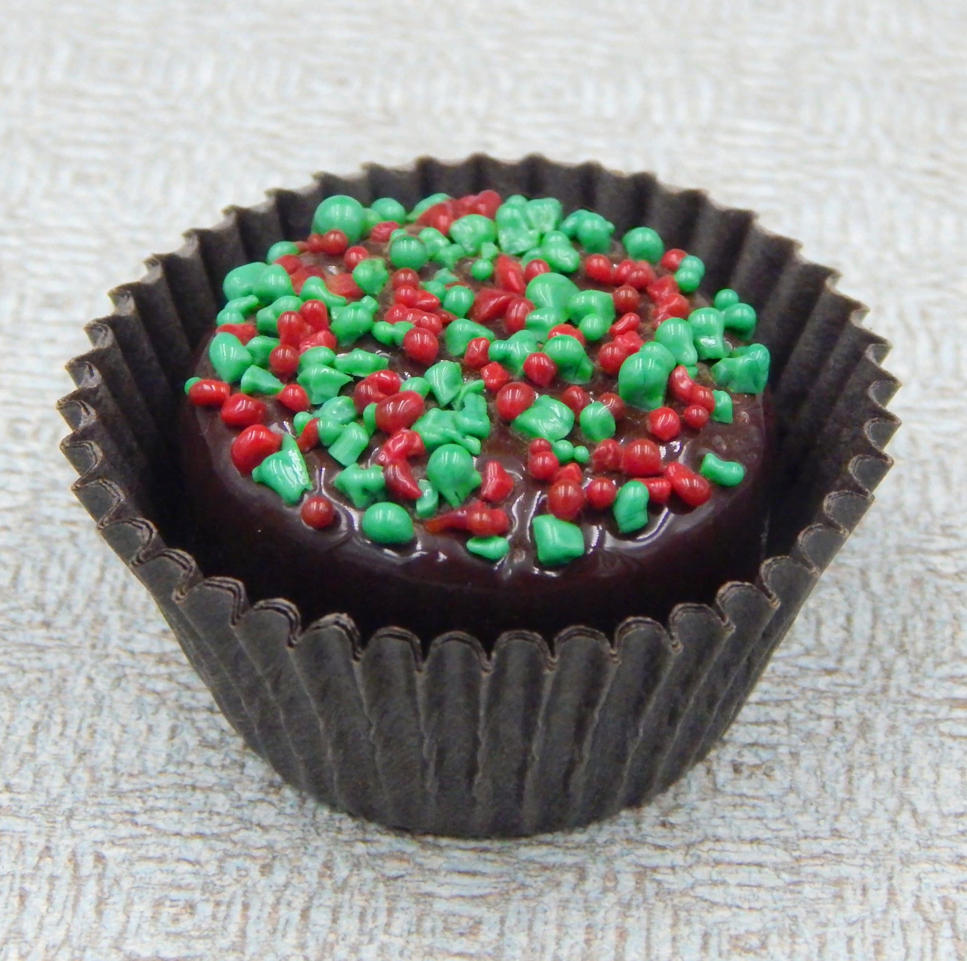 Handmade collectible solid glass Christmas chocolates with sprinkles of red & green candies on top created from colorful glass utilizing flameworking techniques. Meticulous attention to detail has gone into the construction of each of our pieces to enhance its appeal and collectibility.