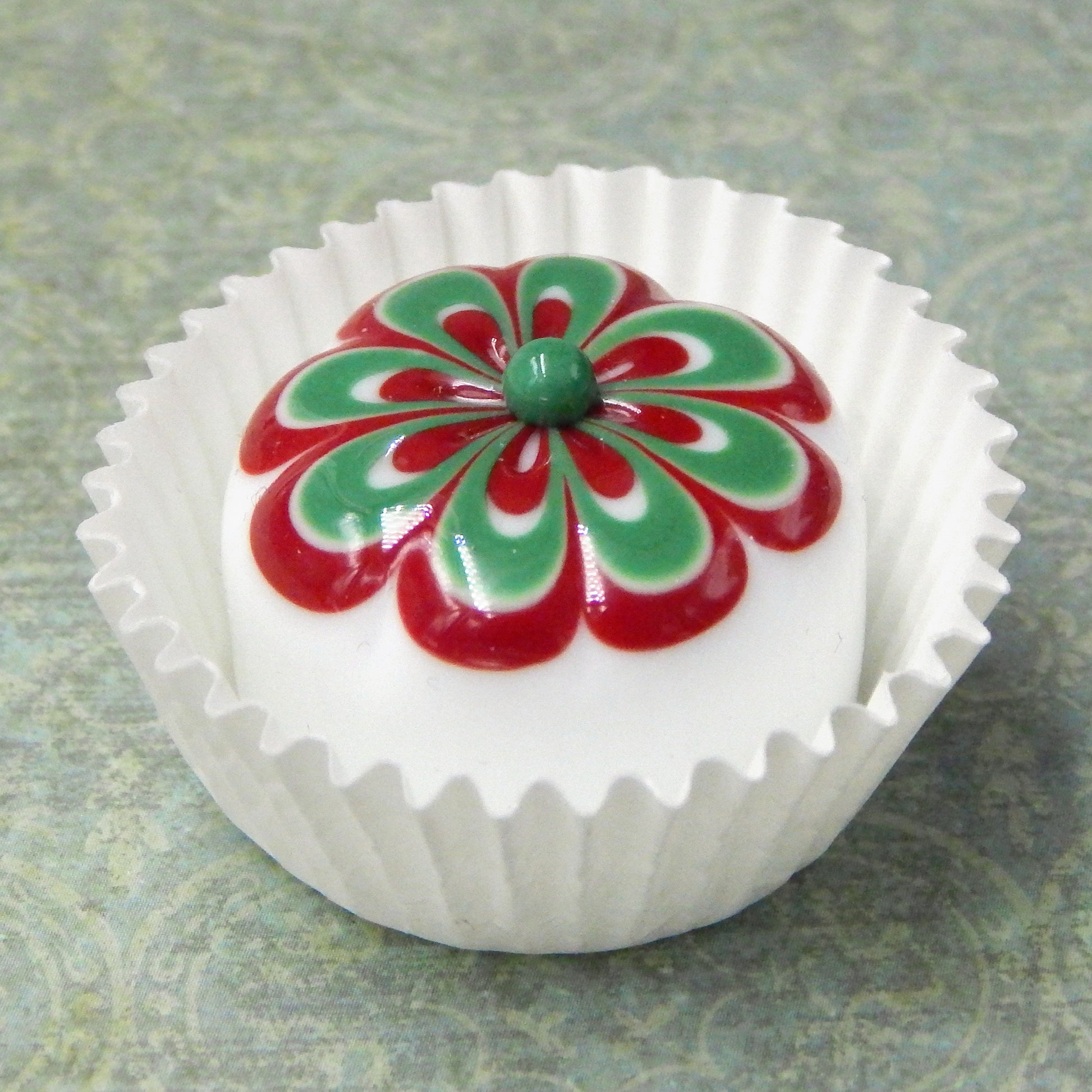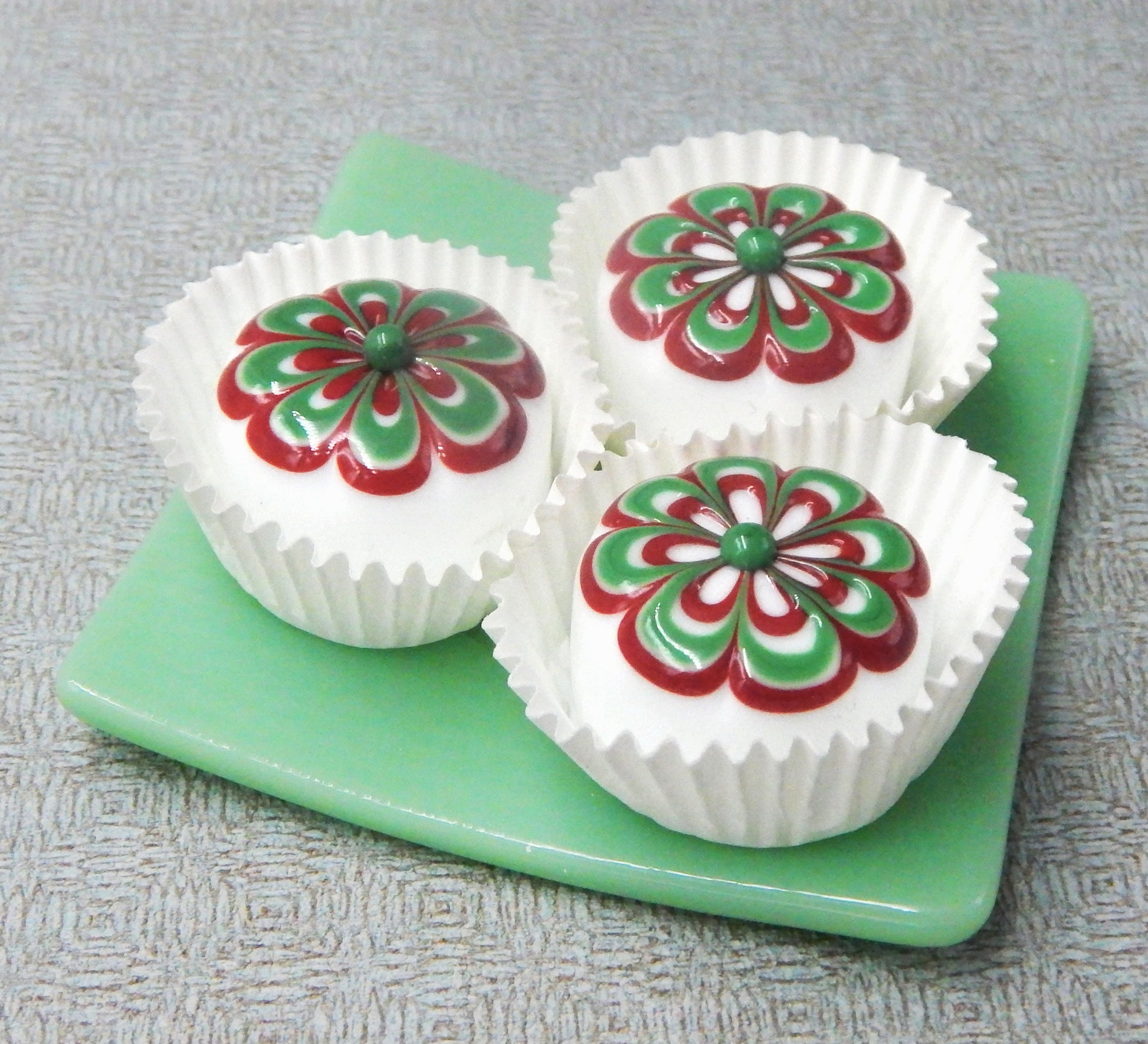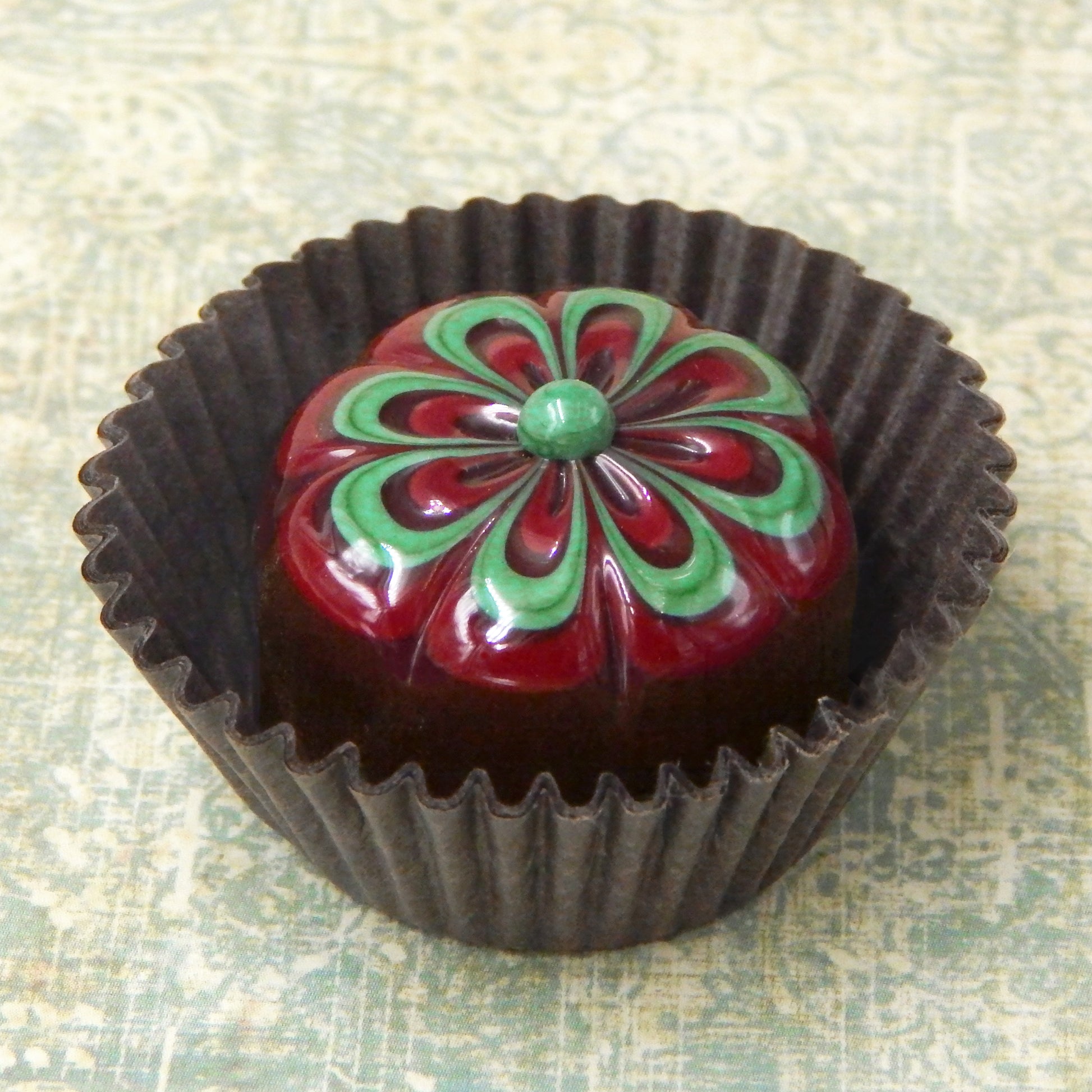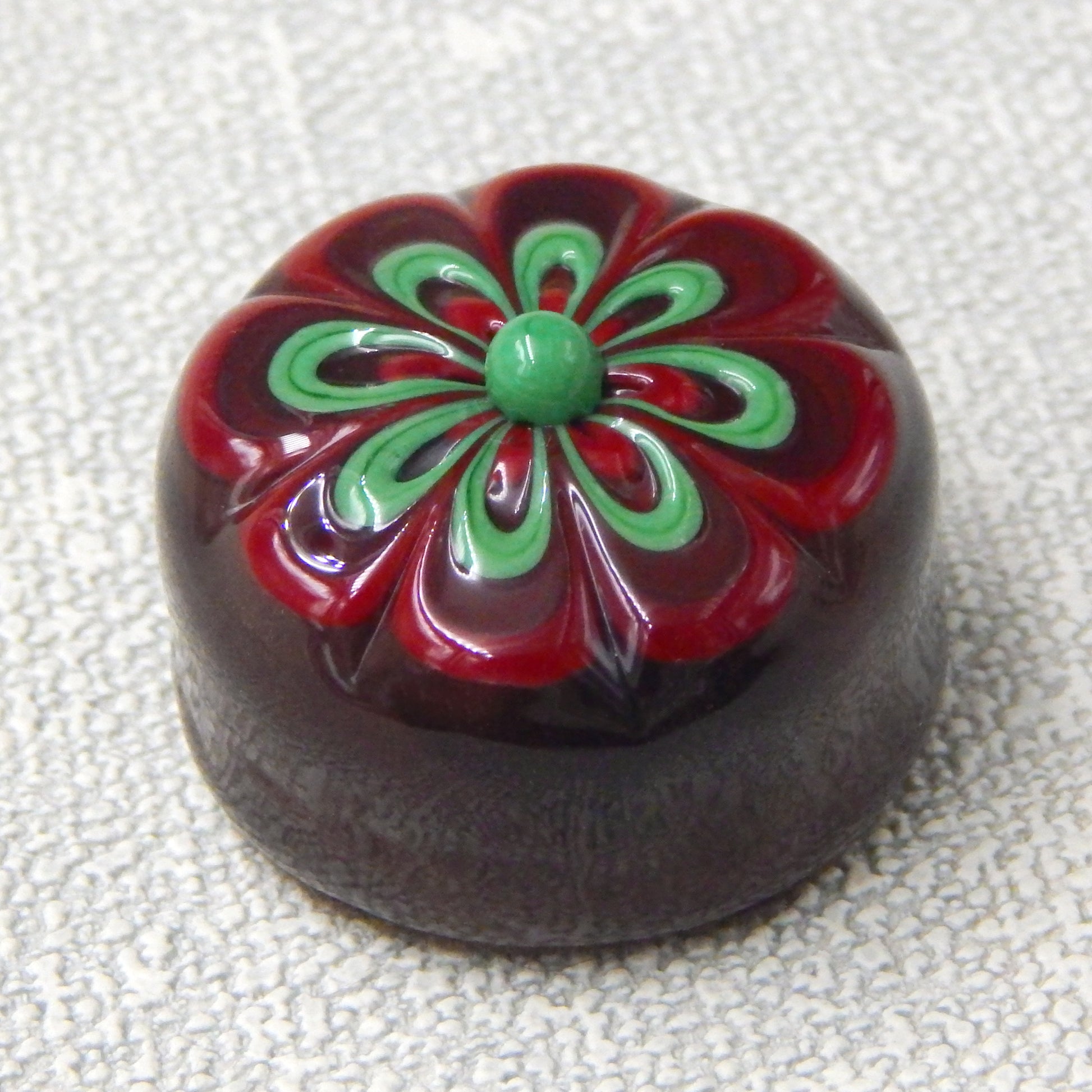 Handmade collectible solid glass chocolates with scrumptious cherry and wintergreen floral designs on top created from colorful glass utilizing flameworking techniques. Meticulous attention to detail has gone into the construction of each of our pieces to enhance its appeal and collectibility.