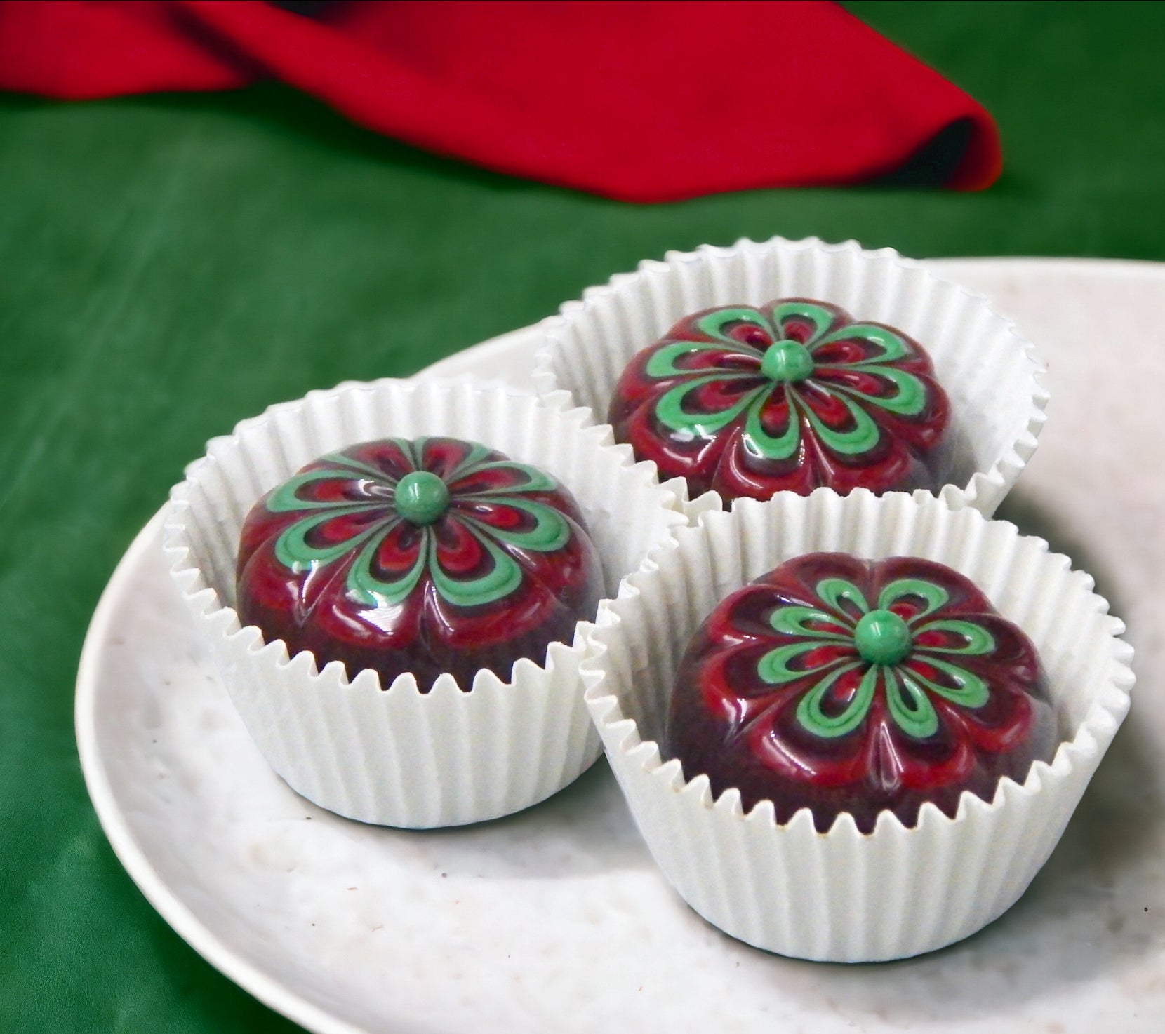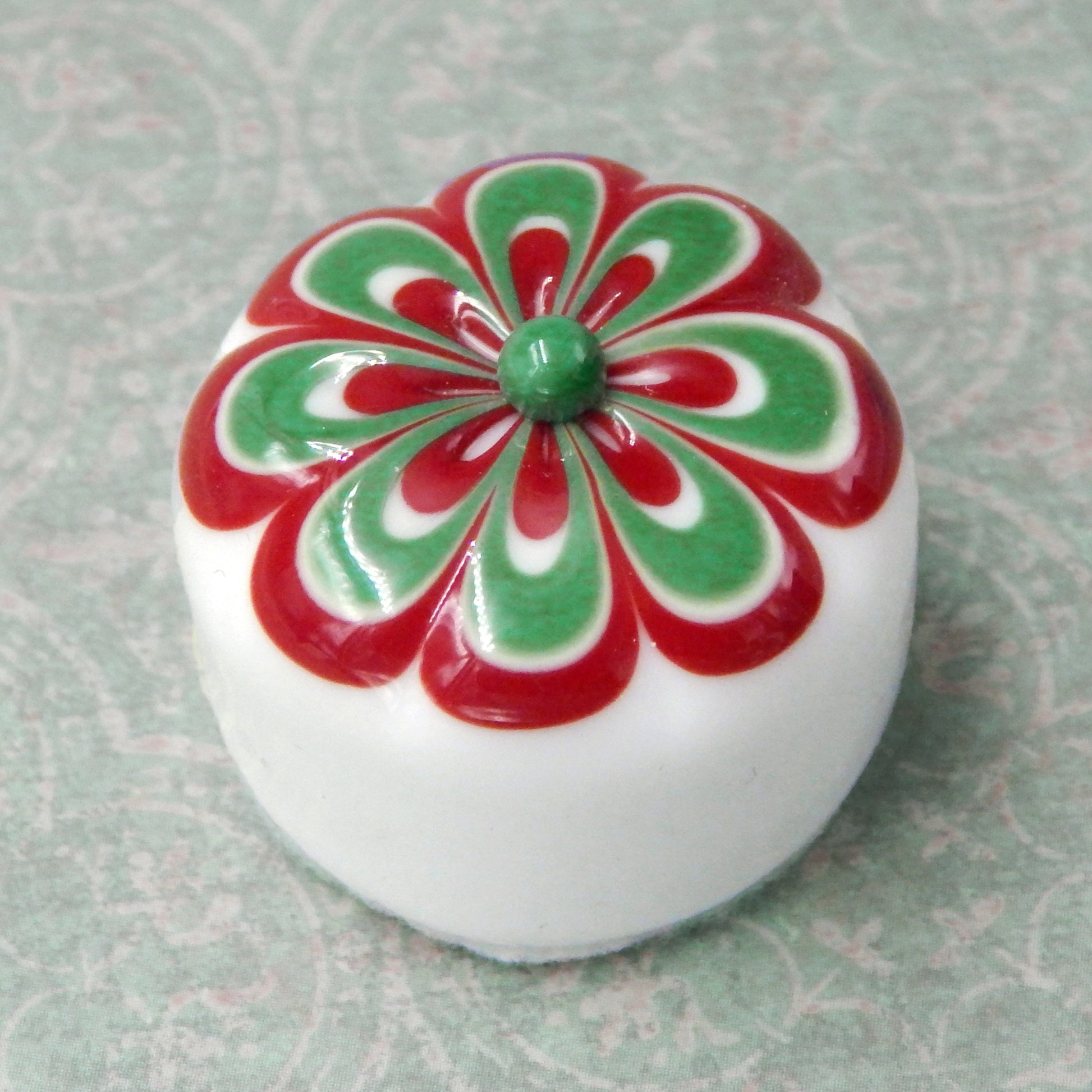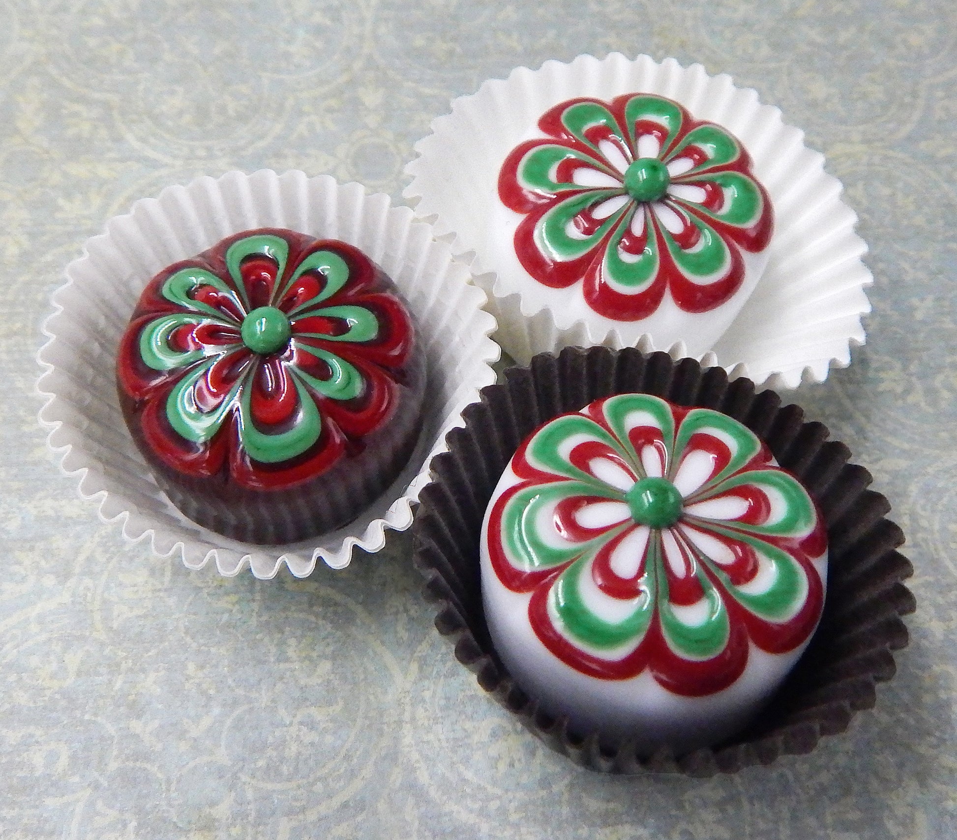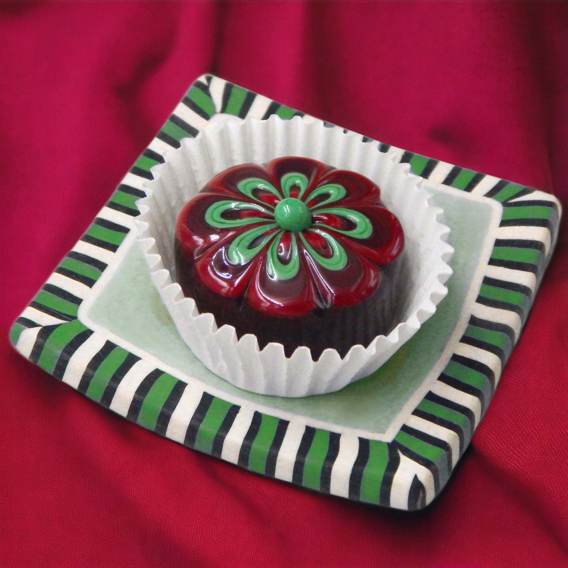 Handmade collectible solid glass chocolates with scrumptious cherry and wintergreen floral designs on top created from colorful glass utilizing flameworking techniques. Meticulous attention to detail has gone into the construction of each of our pieces to enhance its appeal and collectibility.