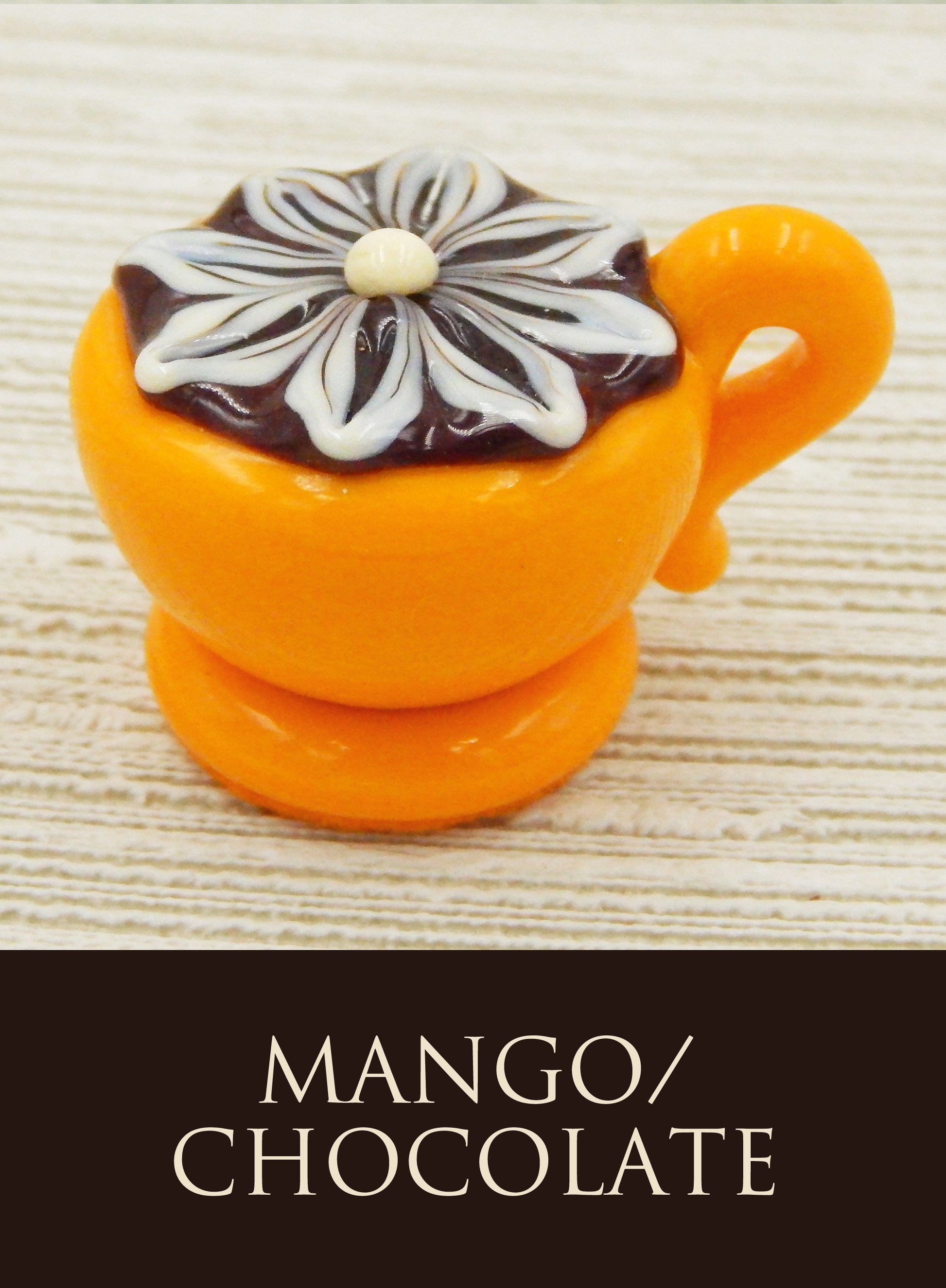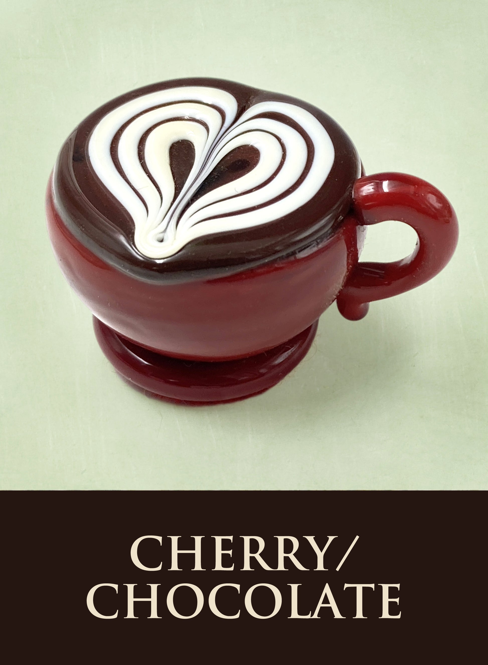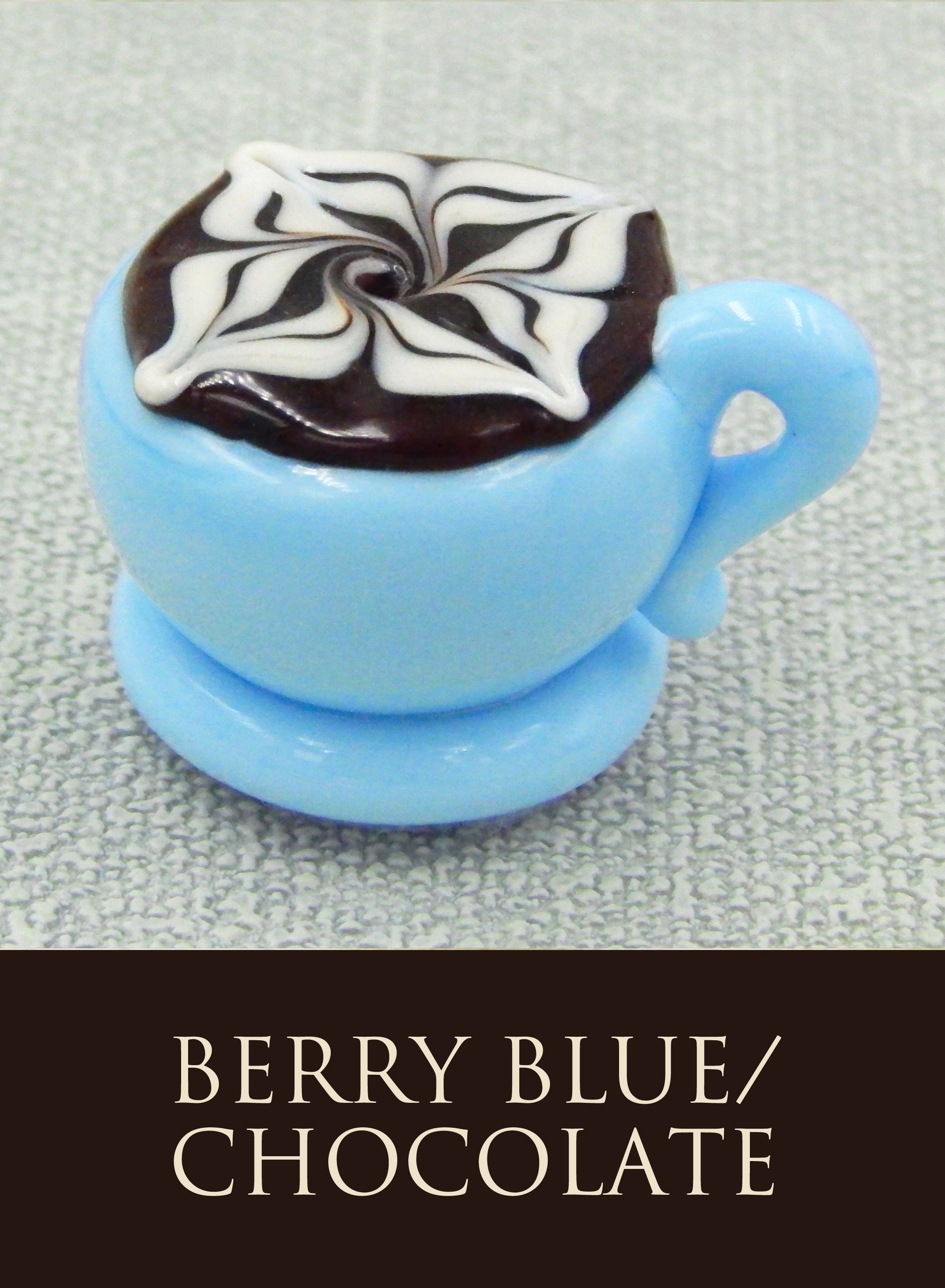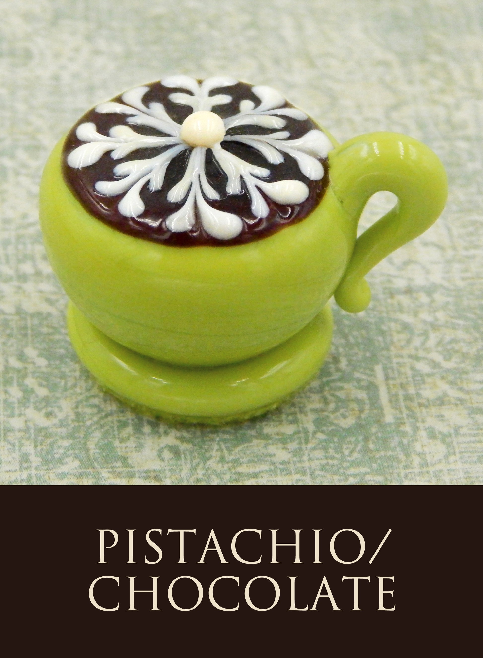 Each glass latte cup measures approximately 1.5" x 1" (slightly larger than an actual chocolate candy) and sits in a fluted glassine paper candy cup. The bottom of each chocolate is covered in felt to protect the surface it will sit upon. Each beautiful glass treat is signed (Hulet), dated and comes to you in a colorful gift box with an enclosure card telling a bit about the piece.