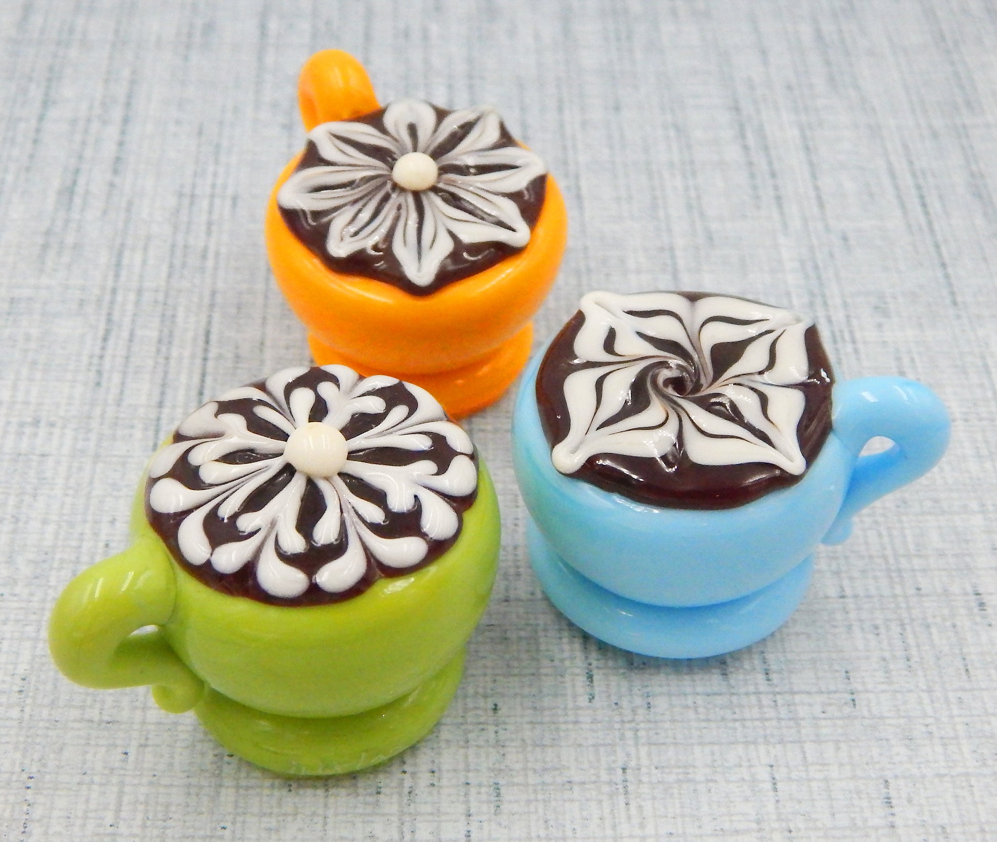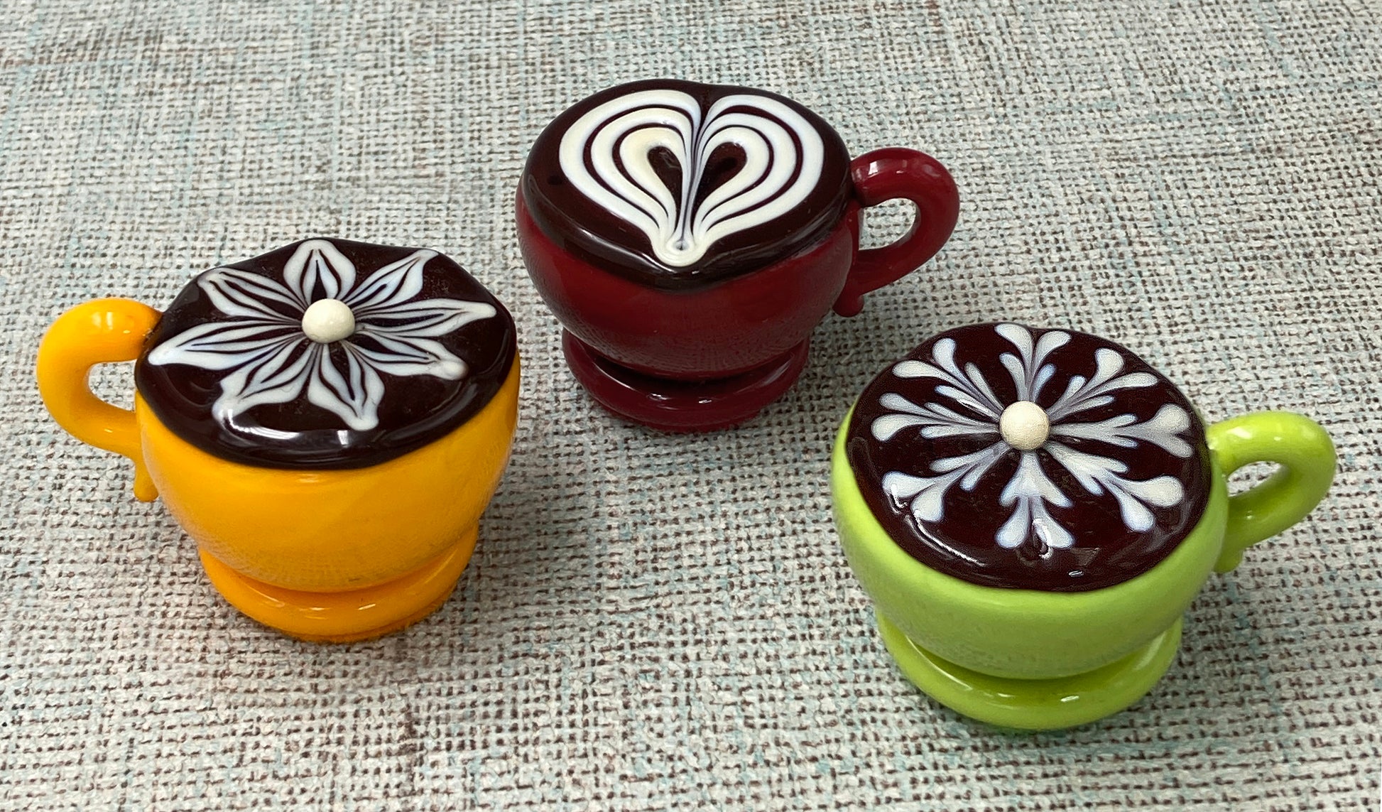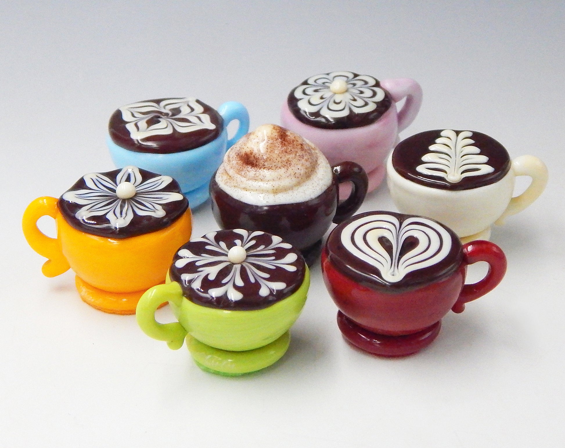 Handmade collectible solid glass coffee cups with creamy decorative accents on top created from colorful glass utilizing flameworking techniques. Meticulous attention to detail has gone into the construction of each of our pieces to enhance its appeal and collectibility.